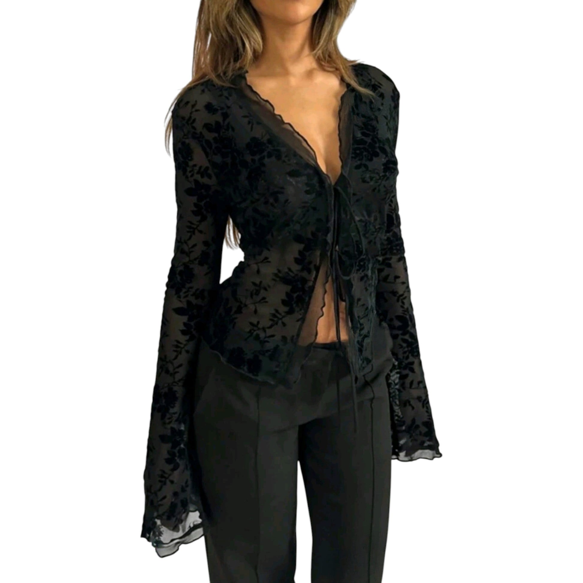 Címke nélküli, fekete, V-nyakú, hosszú, harang ujjú, elöl fűzős, áttetsző virágmintás blúz csipke szegéllyel