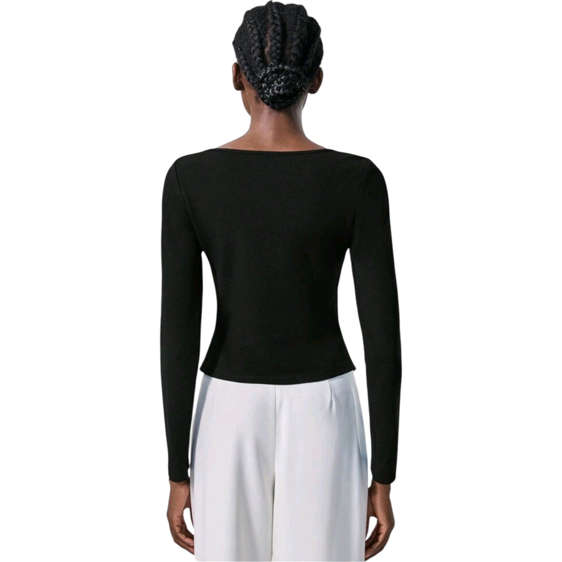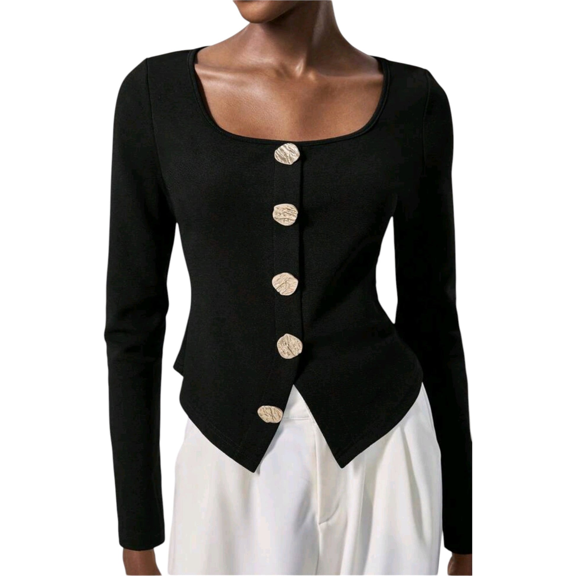 Címke nélküli, fekete, hosszú ujjú, gombos, karcsúsított szabású