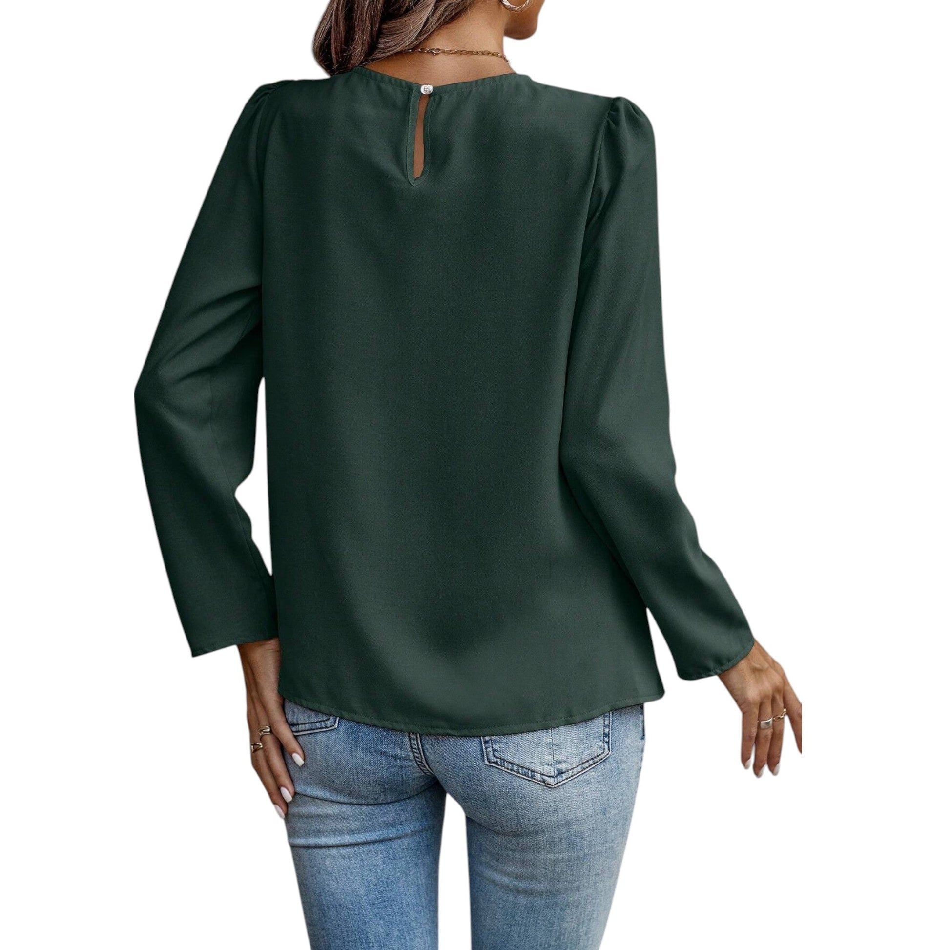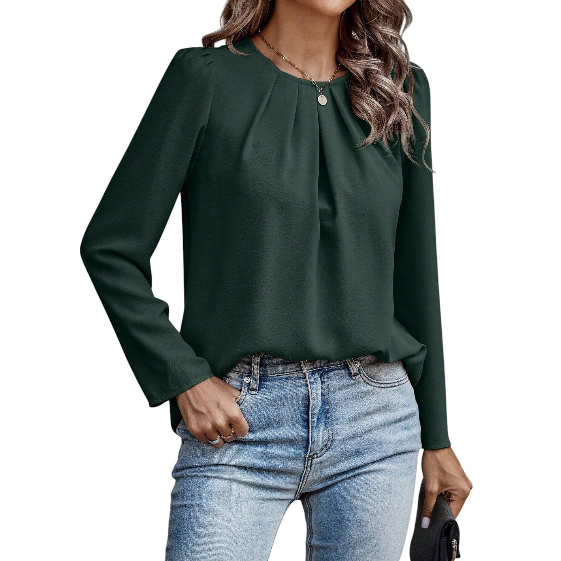 Címke nélküli, smaragdzöld, hosszú ujjú, kerek nyakú, mellrésznél ráncolt.
