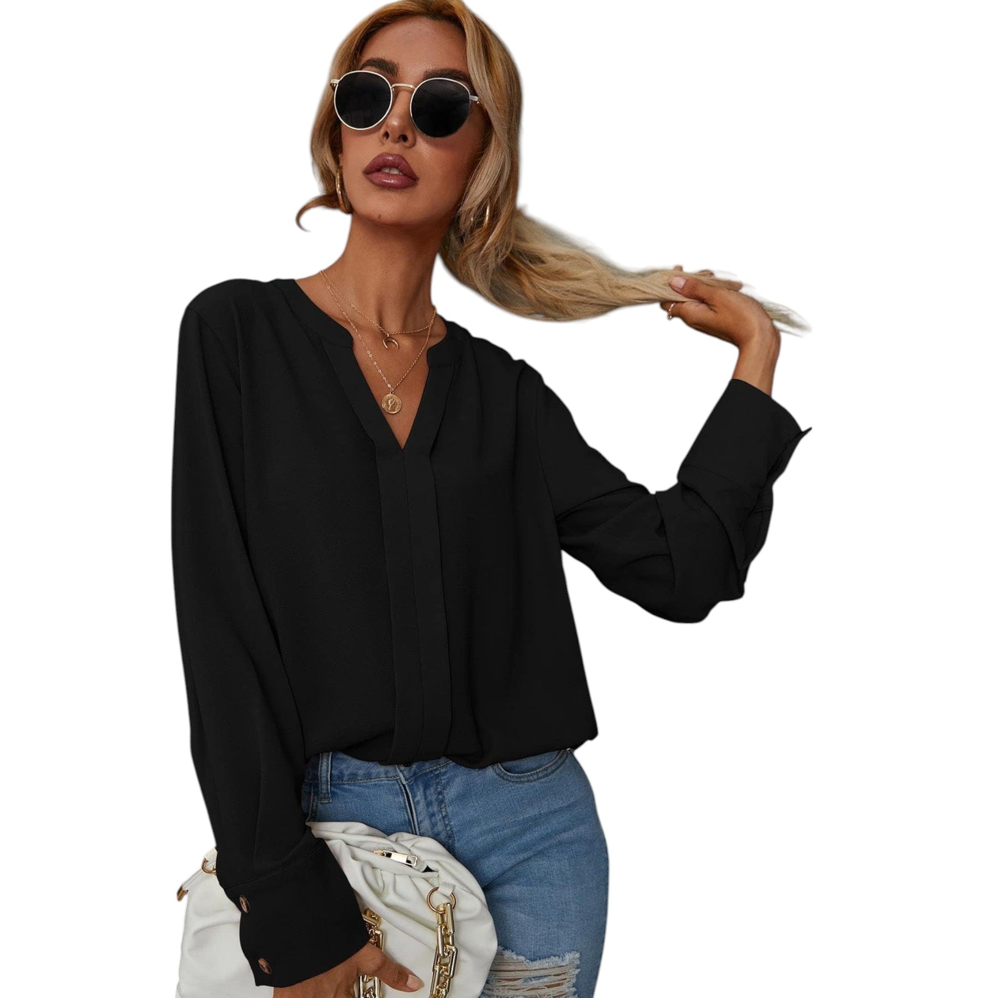 Címke nélküli, fekete, V-nyakú, hosszú ujjú blúz.