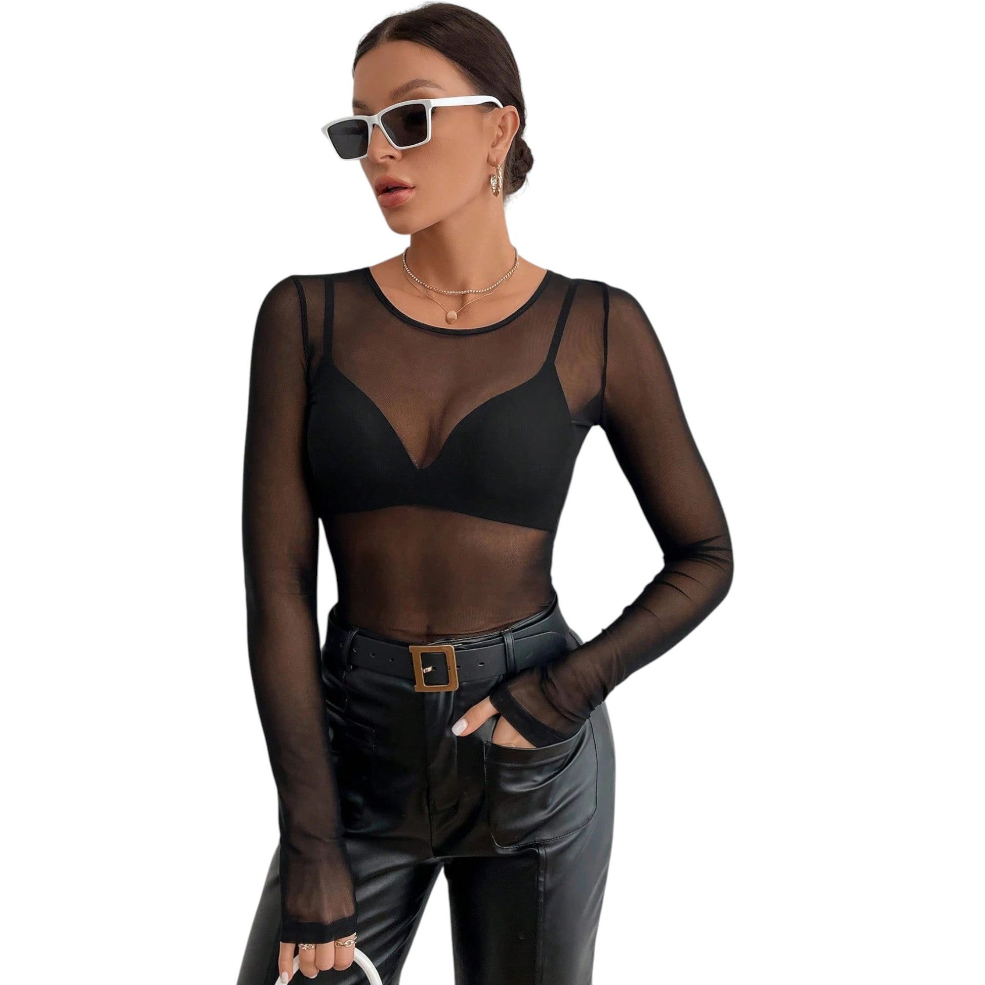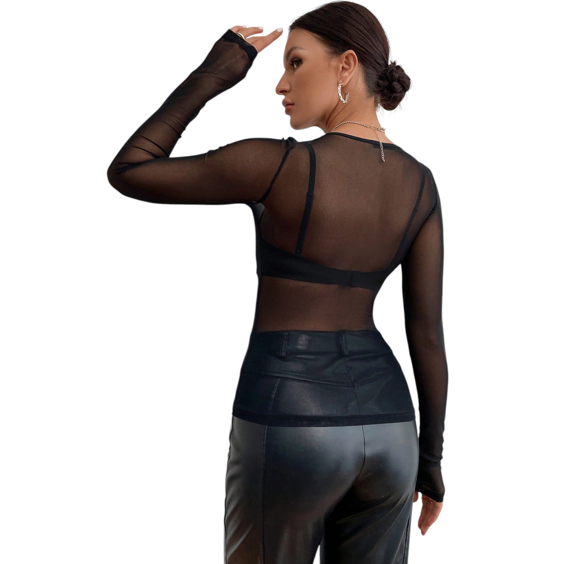 Címke nélküli, fekete, átlátszó, hosszú ujjú, kerek nyakú felső.