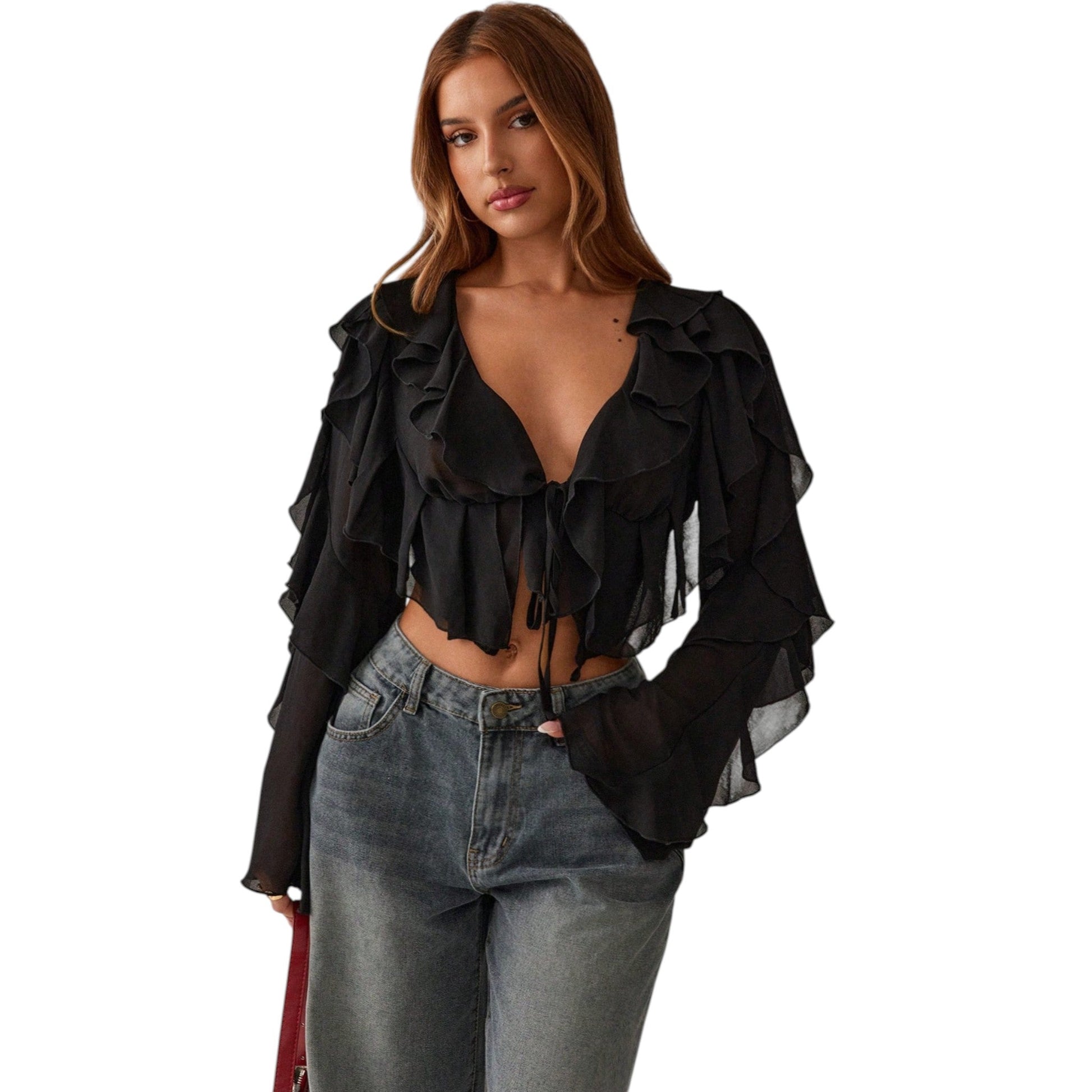 Címke nélküli, fekete, elöl megkötős, mély v-nyakú, hosszú fodros ujjú, áttetsző.