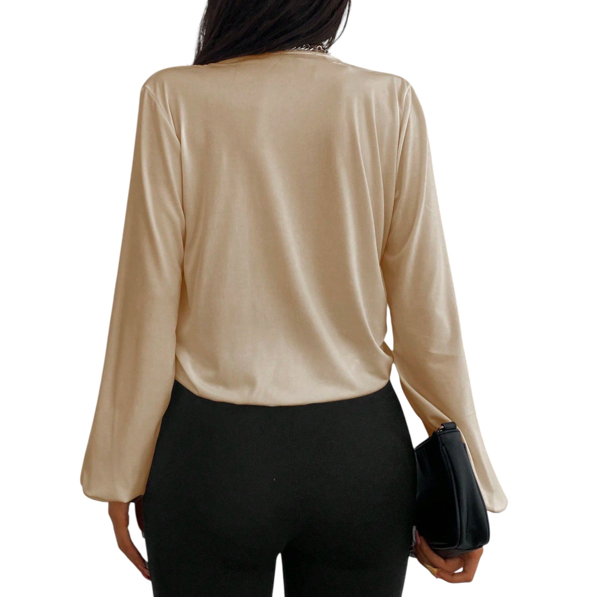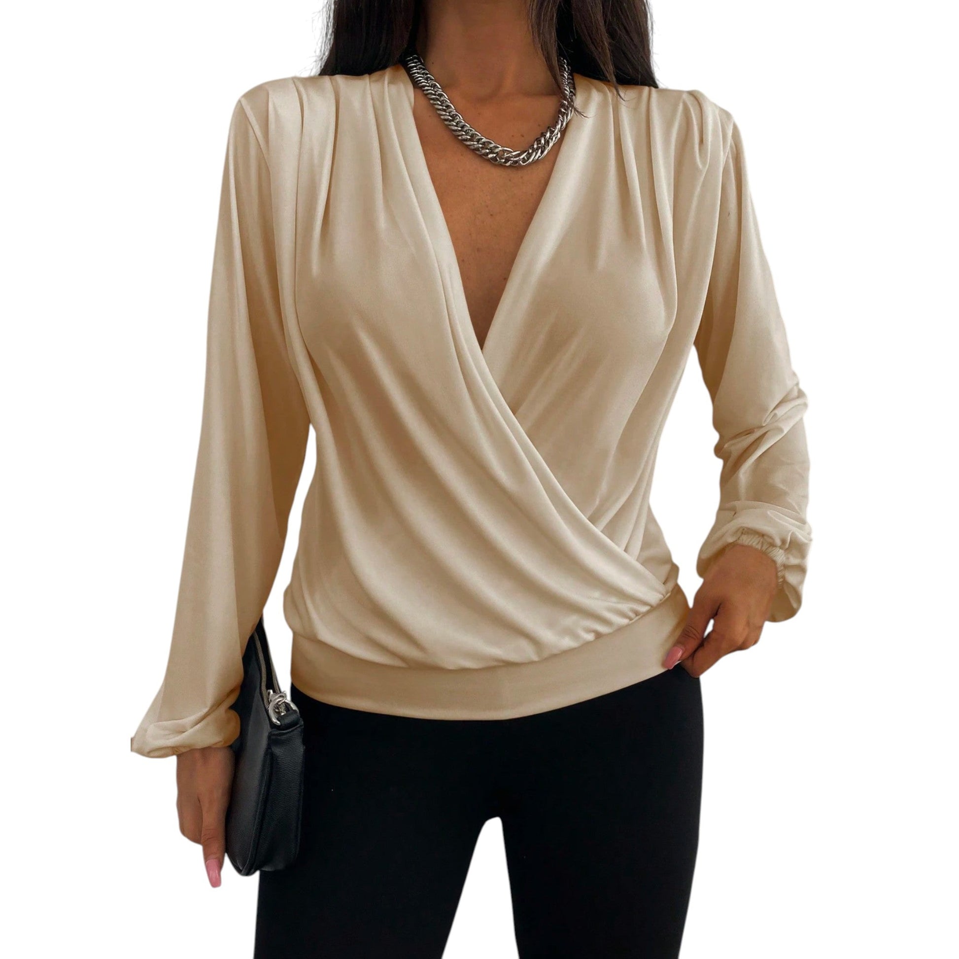 Címke nélküli, drapp, átlapolt, mély v-nyakú, hosszú ujjú, redőzött anyagú, gumírozott aljú.
