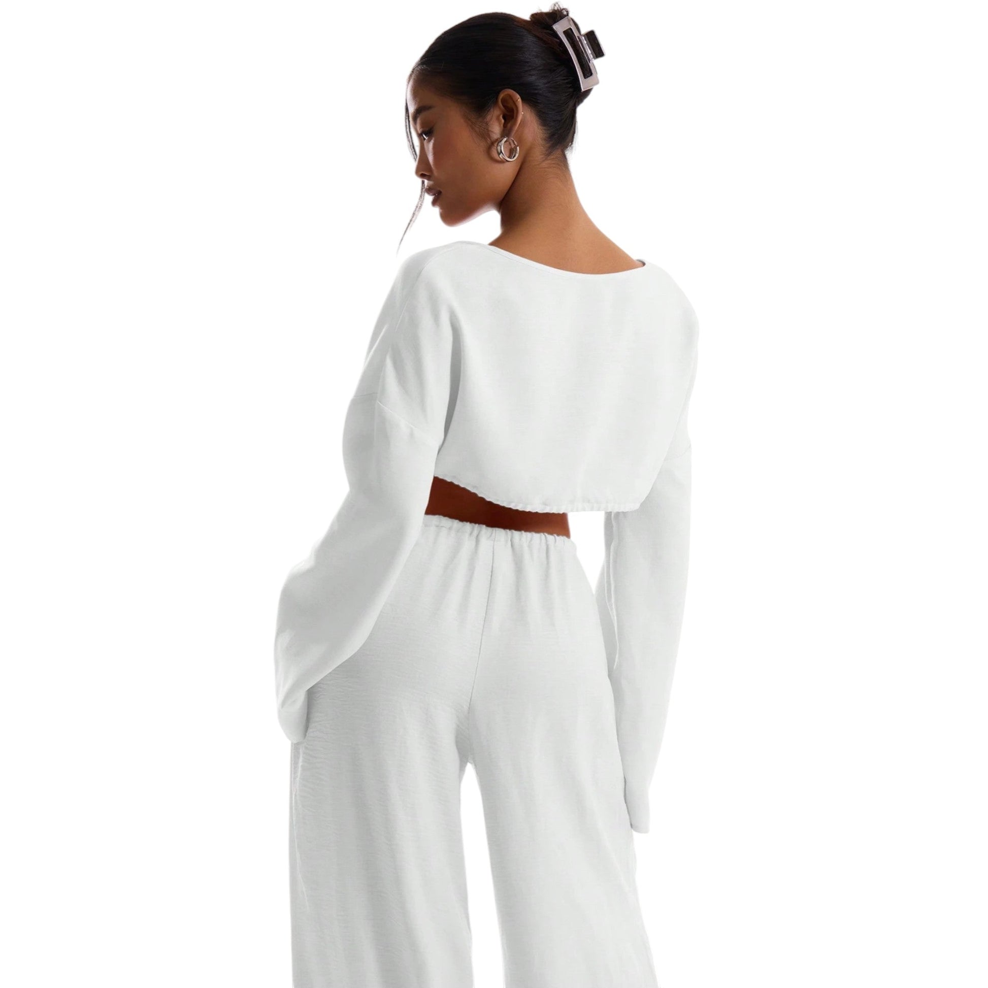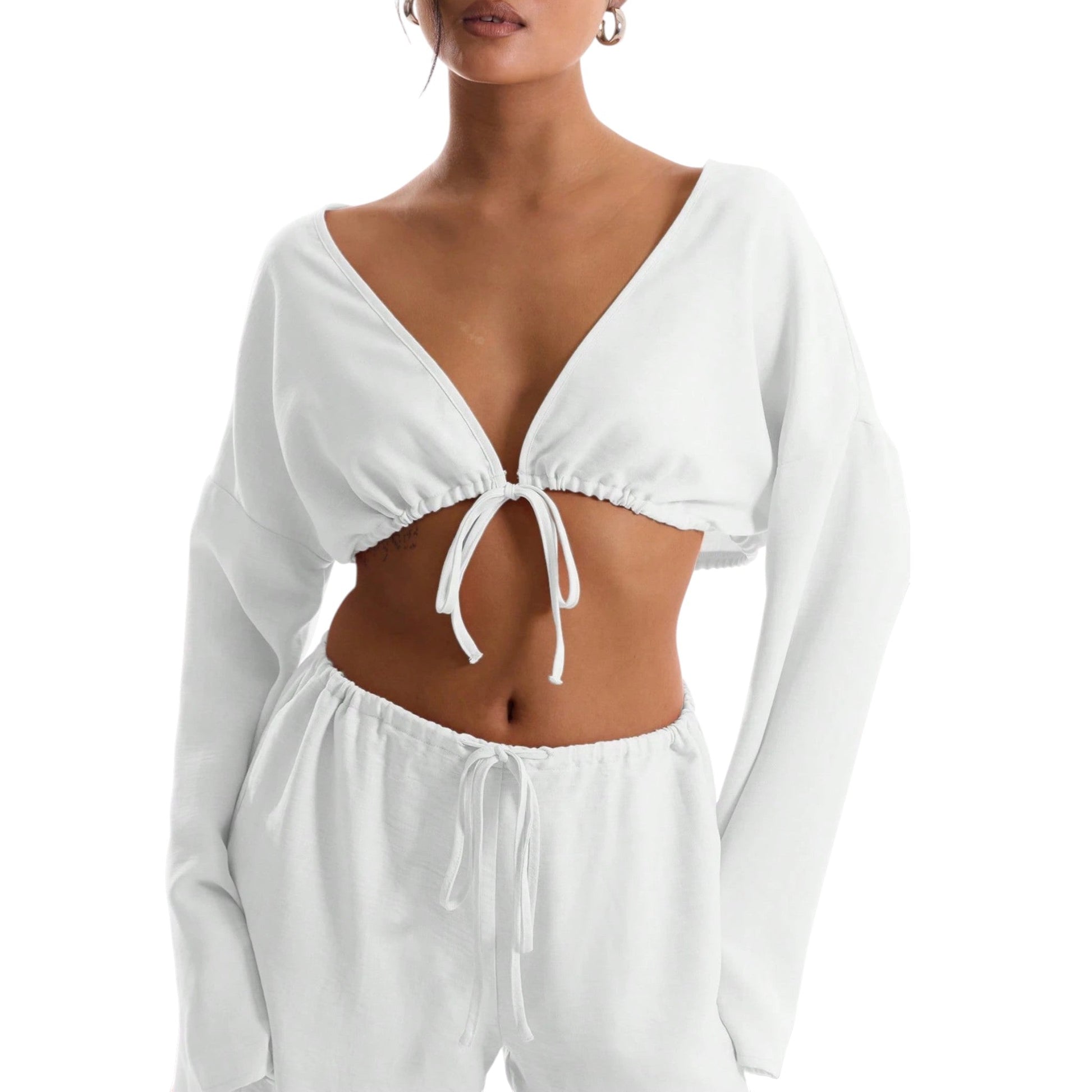 Címke nélküli, ekrü, elöl megkötős, mély v-nyakú, hosszú, bő ujjú, crop fazonú.
