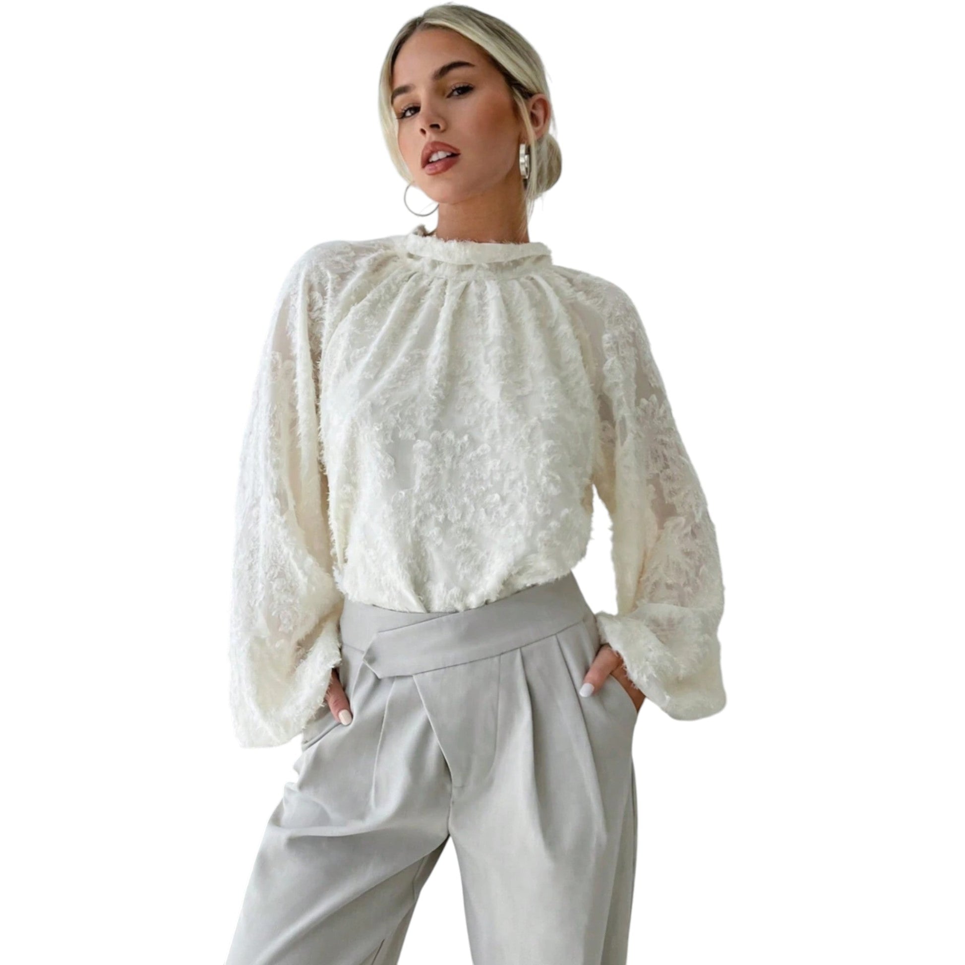 Címke nélküli, ekrü, magas nyakú, texturált anyagú, hosszú, puffos ujjú, mandzsettás.