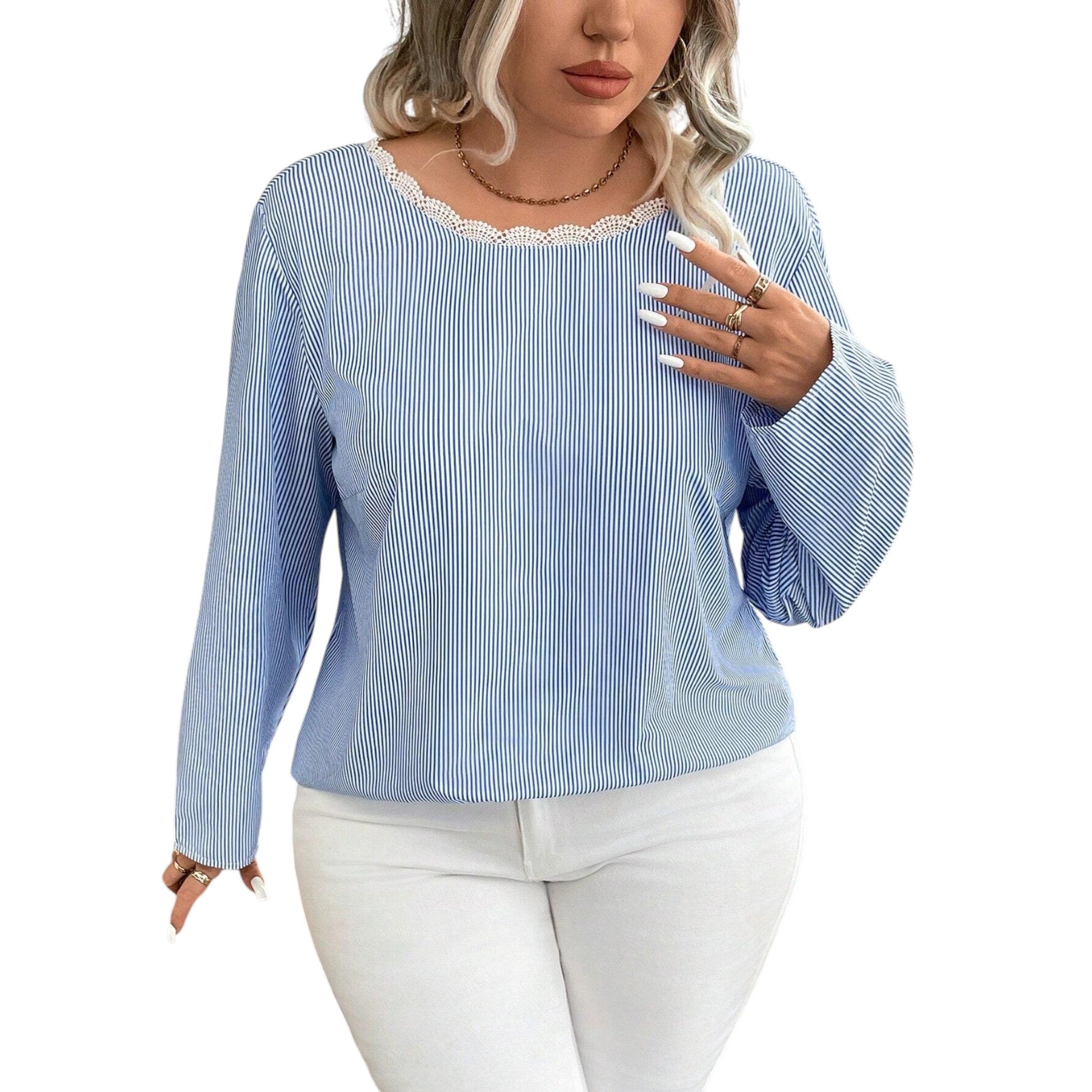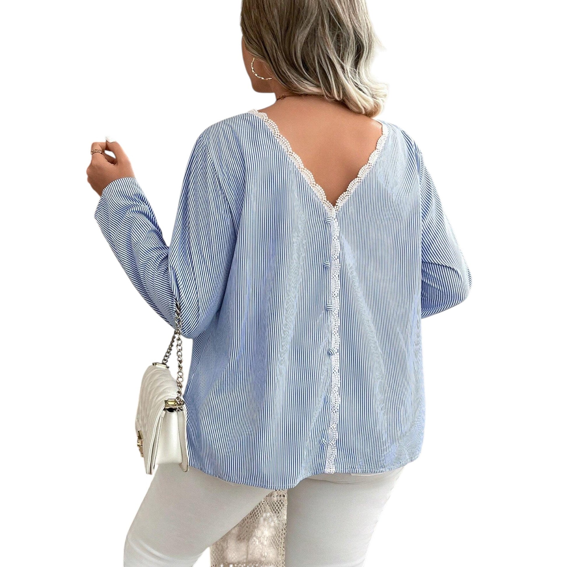Címke nélküli, kék és fehér, csíkos, kerek nyakú, csipke díszítéssel a nyaknál, hosszú ujjú.