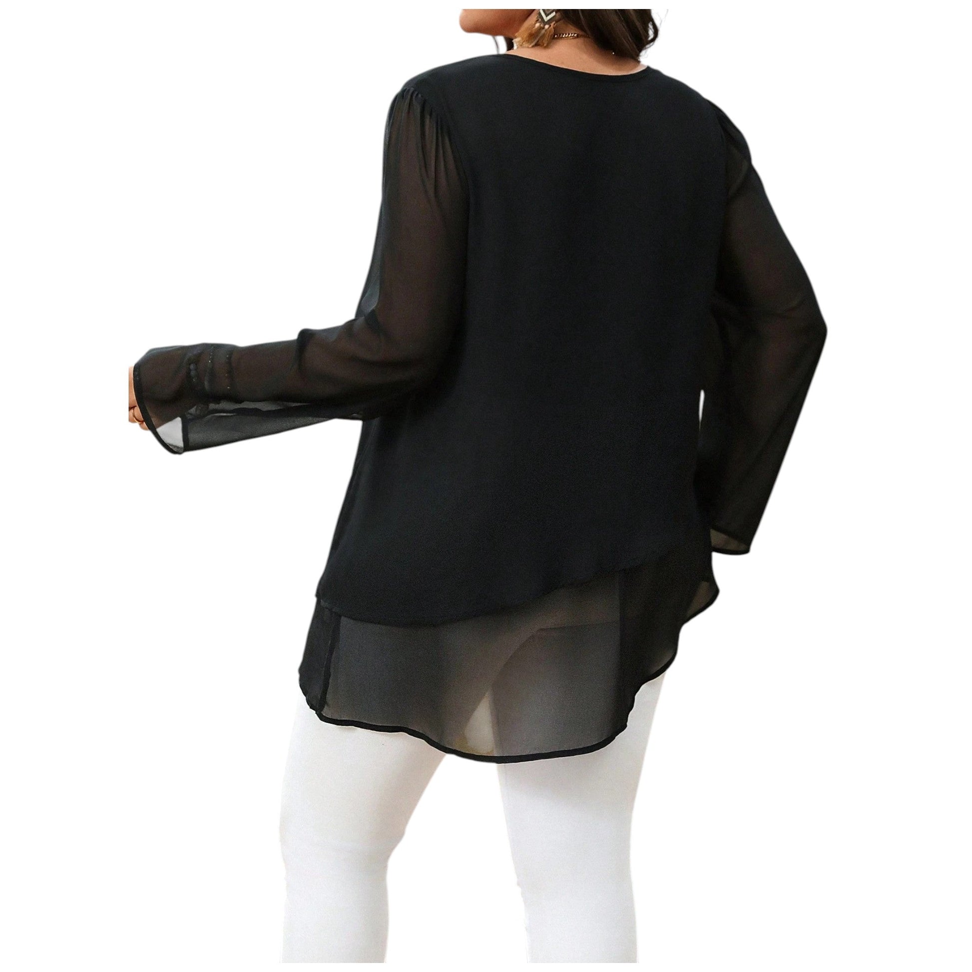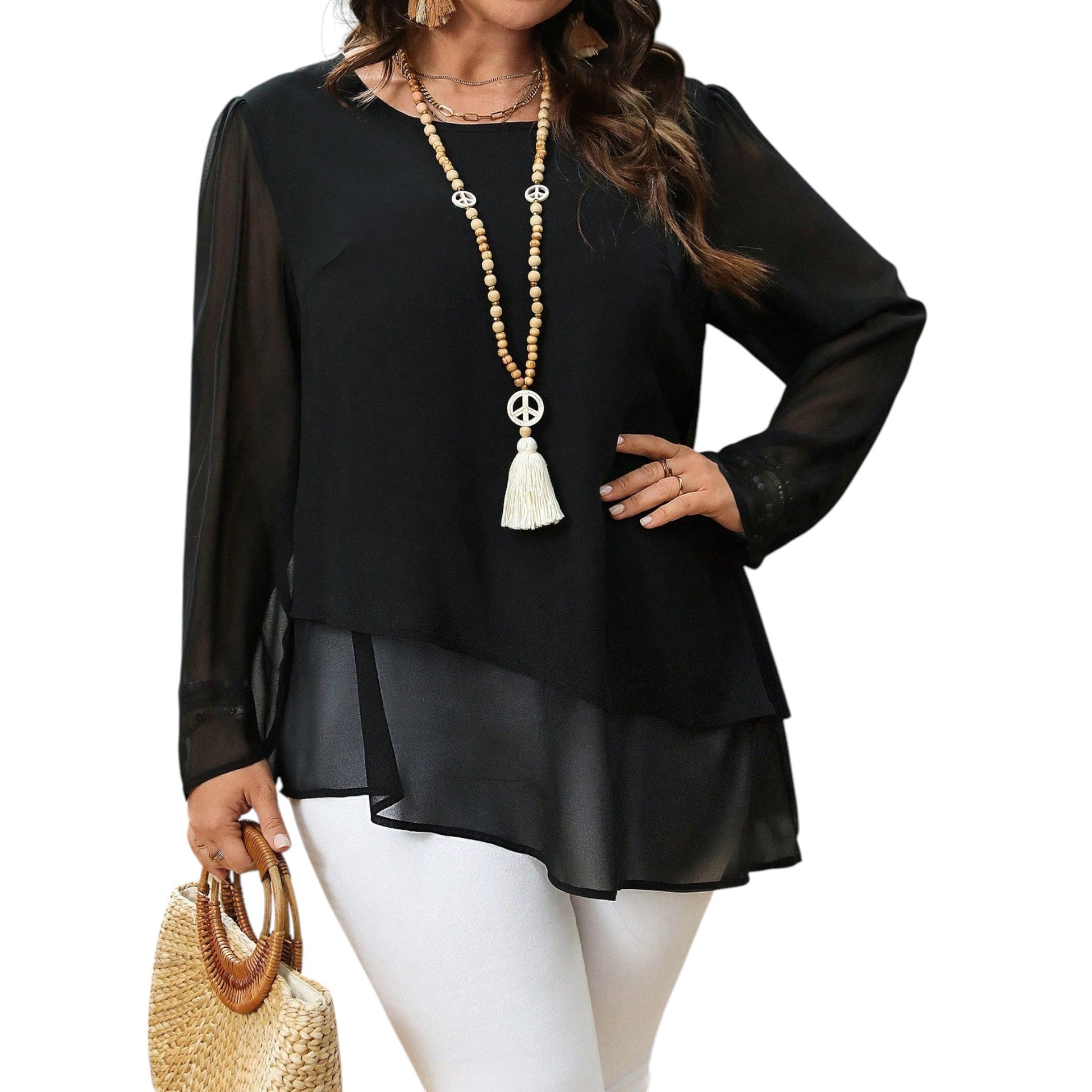 Címke nélküli, fekete, kerek nyakú, hosszú áttetsző ujjú, réteges, aszimmetrikus aljú.