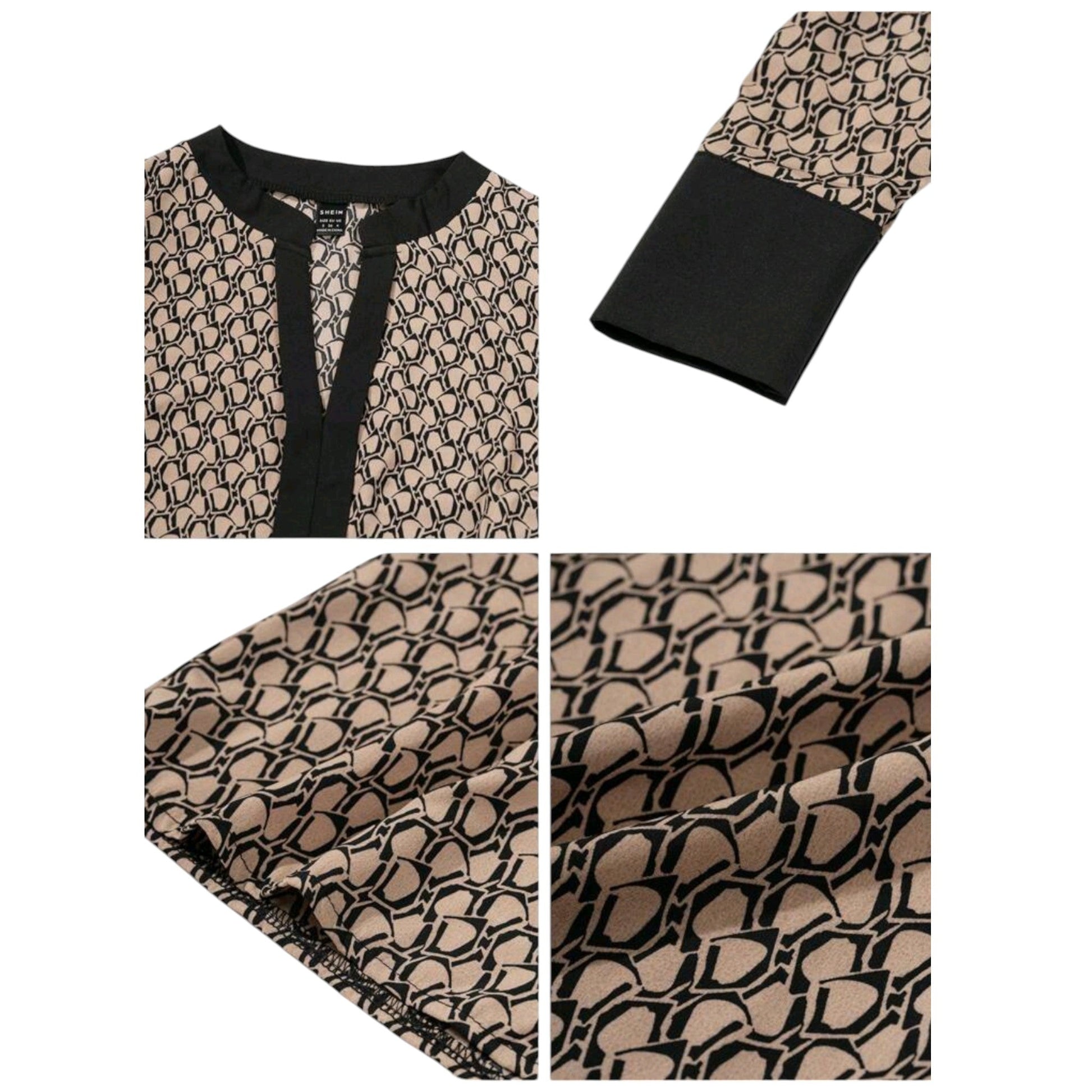 Címke nélküli, bézs alapon sötétbarna logómintás, rövid ujjú, galléros blúz.
