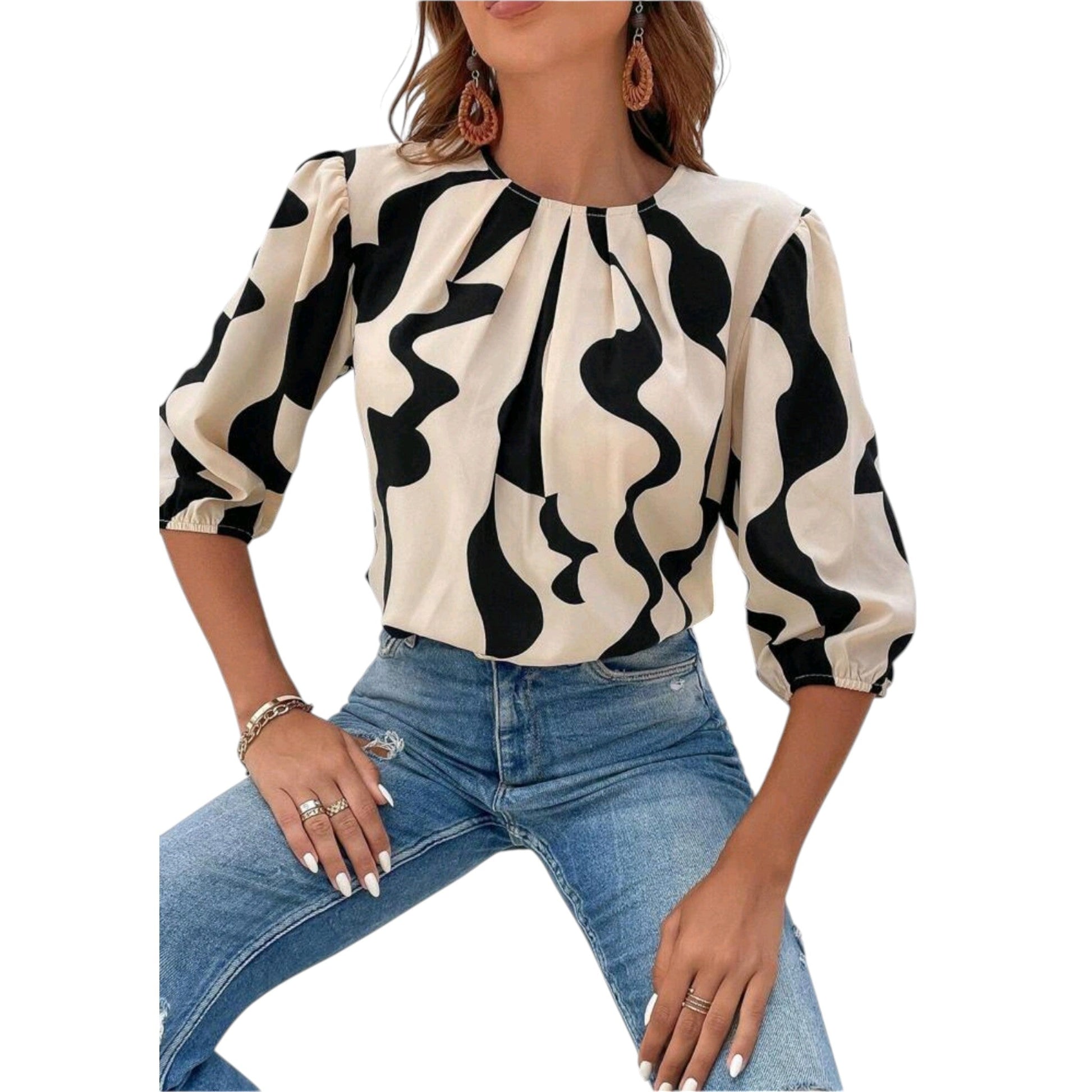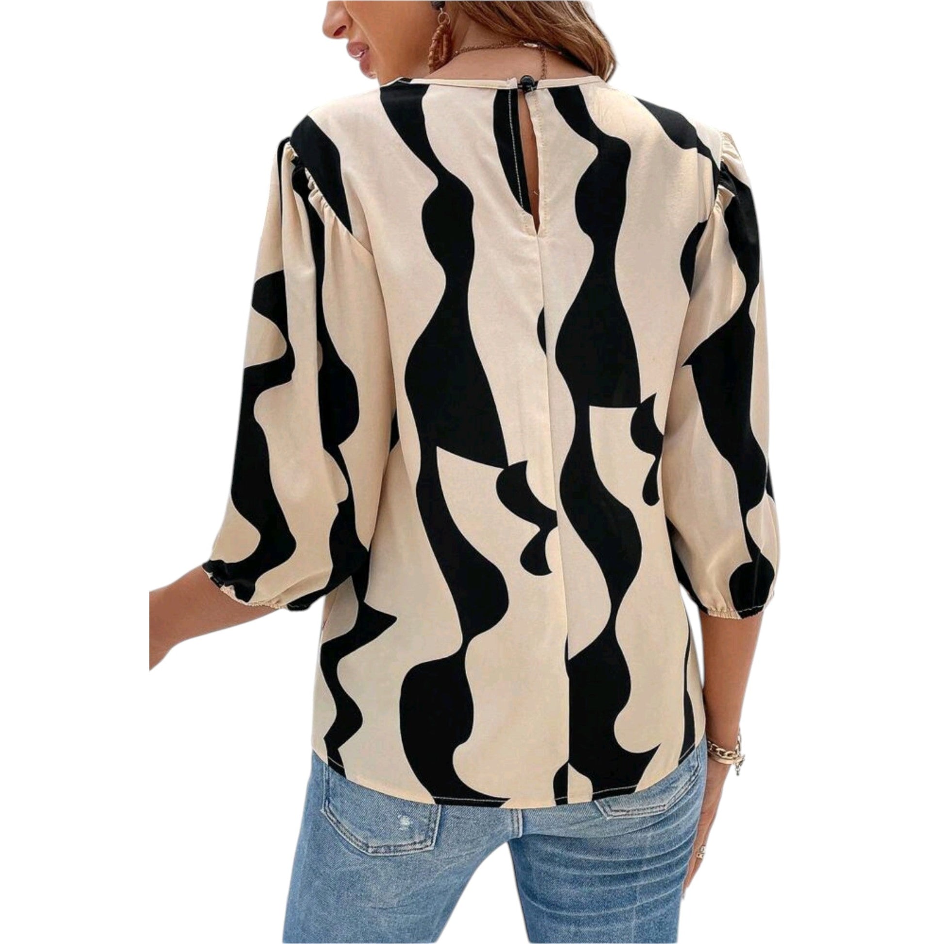 Címke nélküli, fekete alapon bézs geometrikus mintás, hosszú ujjú blúz.