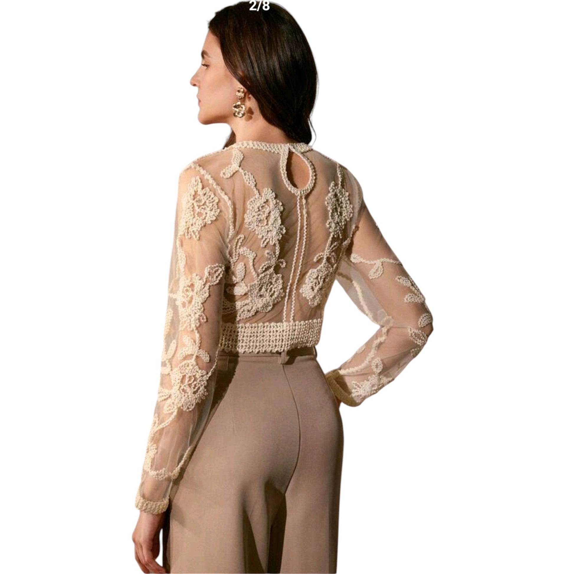 Címke nélküli, fehér, szatén anyagú, hosszú ujjú blúz, elöl csipke díszítéssel.