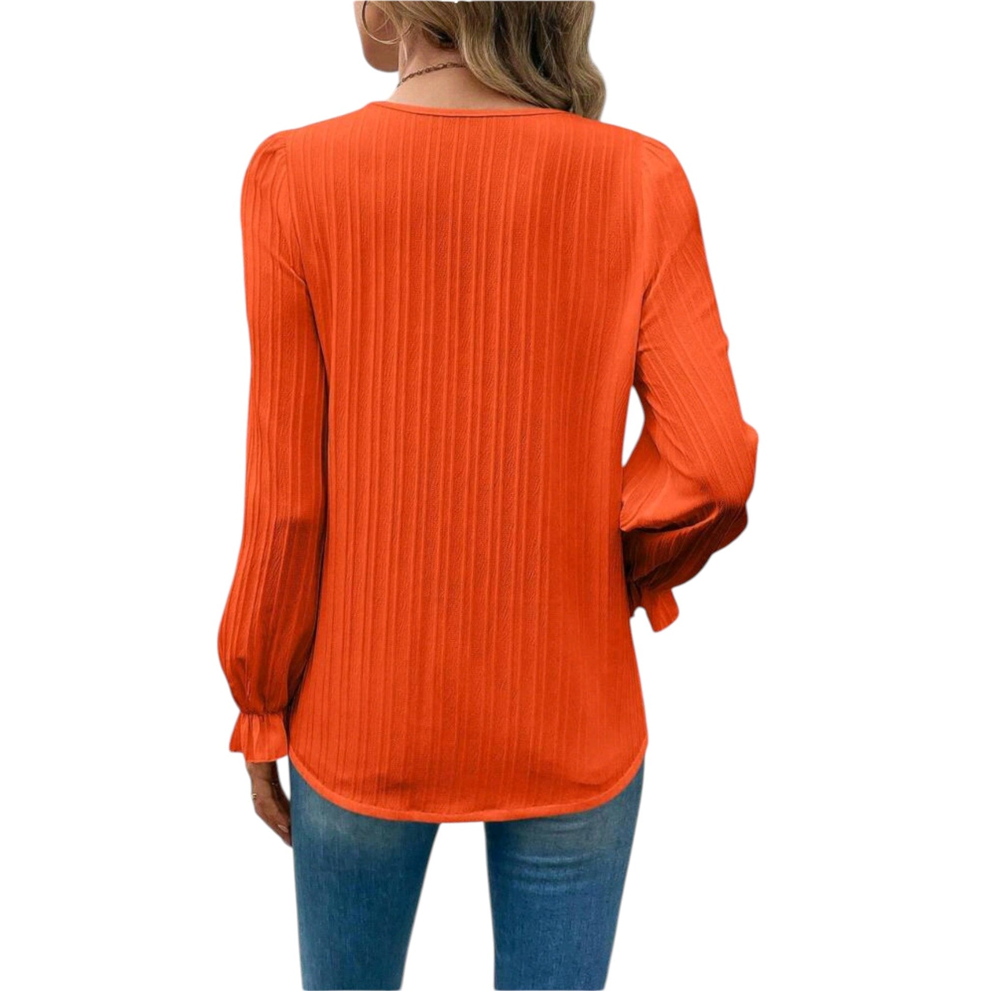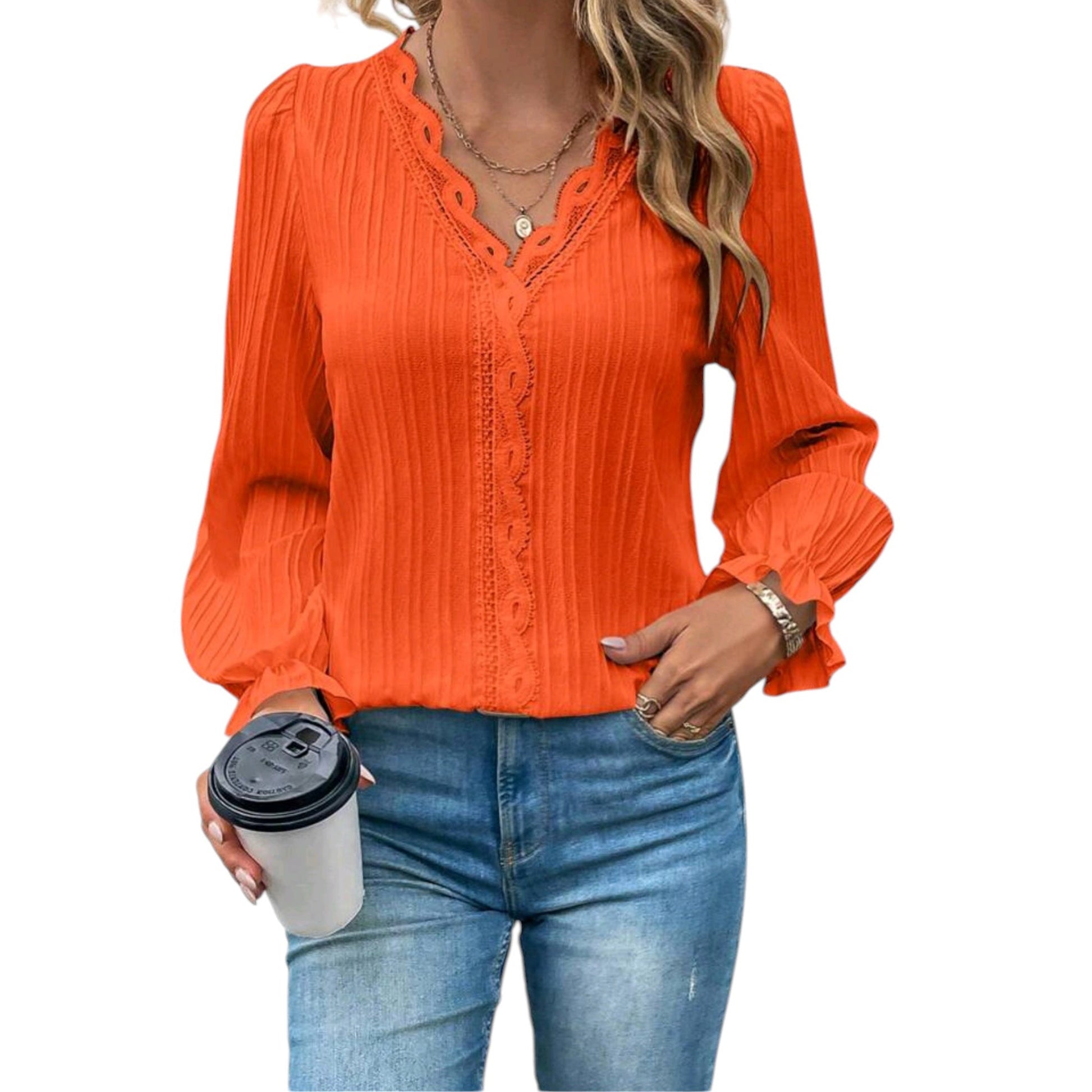 Címke nélküli, narancssárga, hosszú ujjú, V-nyakú, fodros ujjvégek, csipke díszítés.