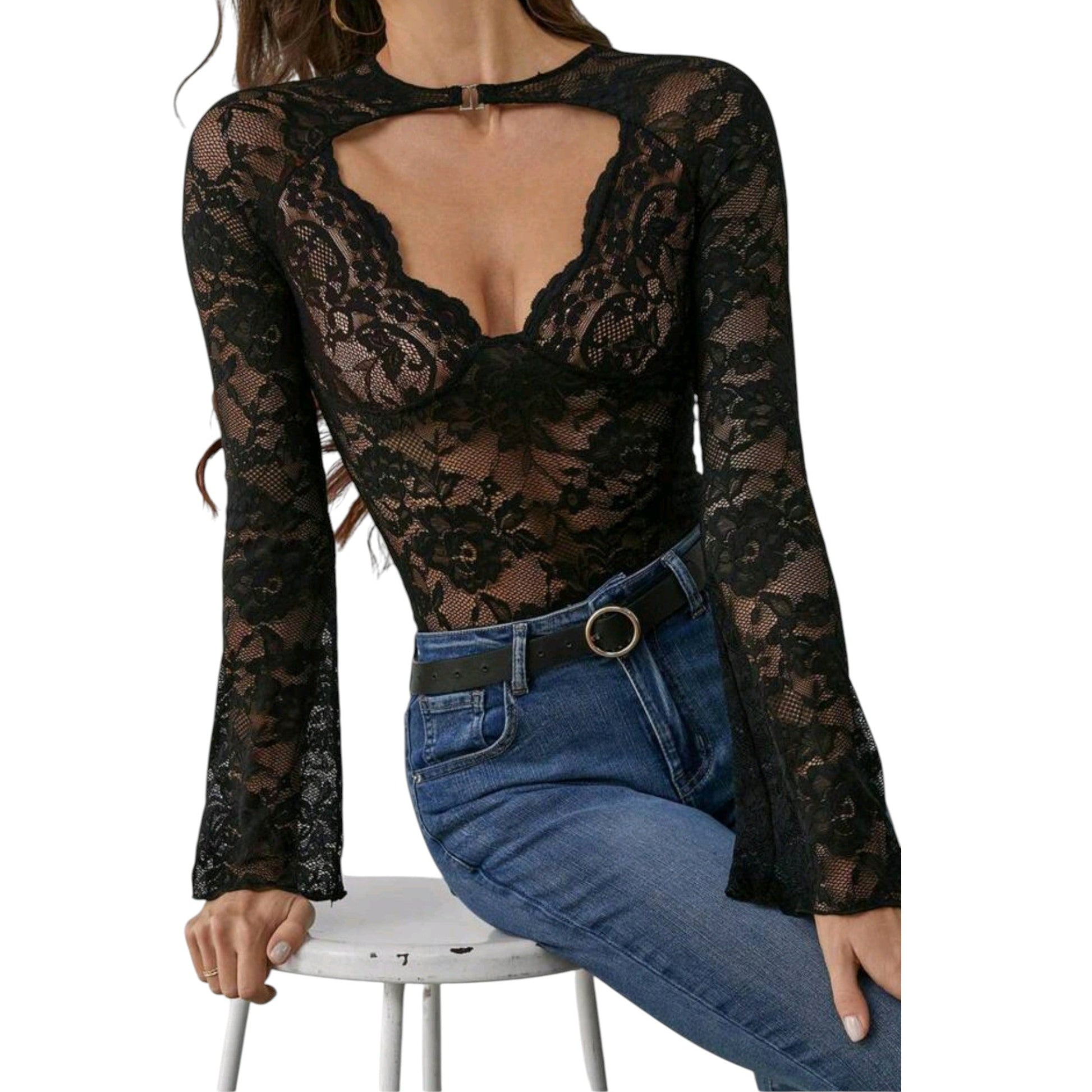 Címke nélküli, fekete, hosszú ujjú, V-nyakú, csipke anyagú, mellrésznél kivágott.