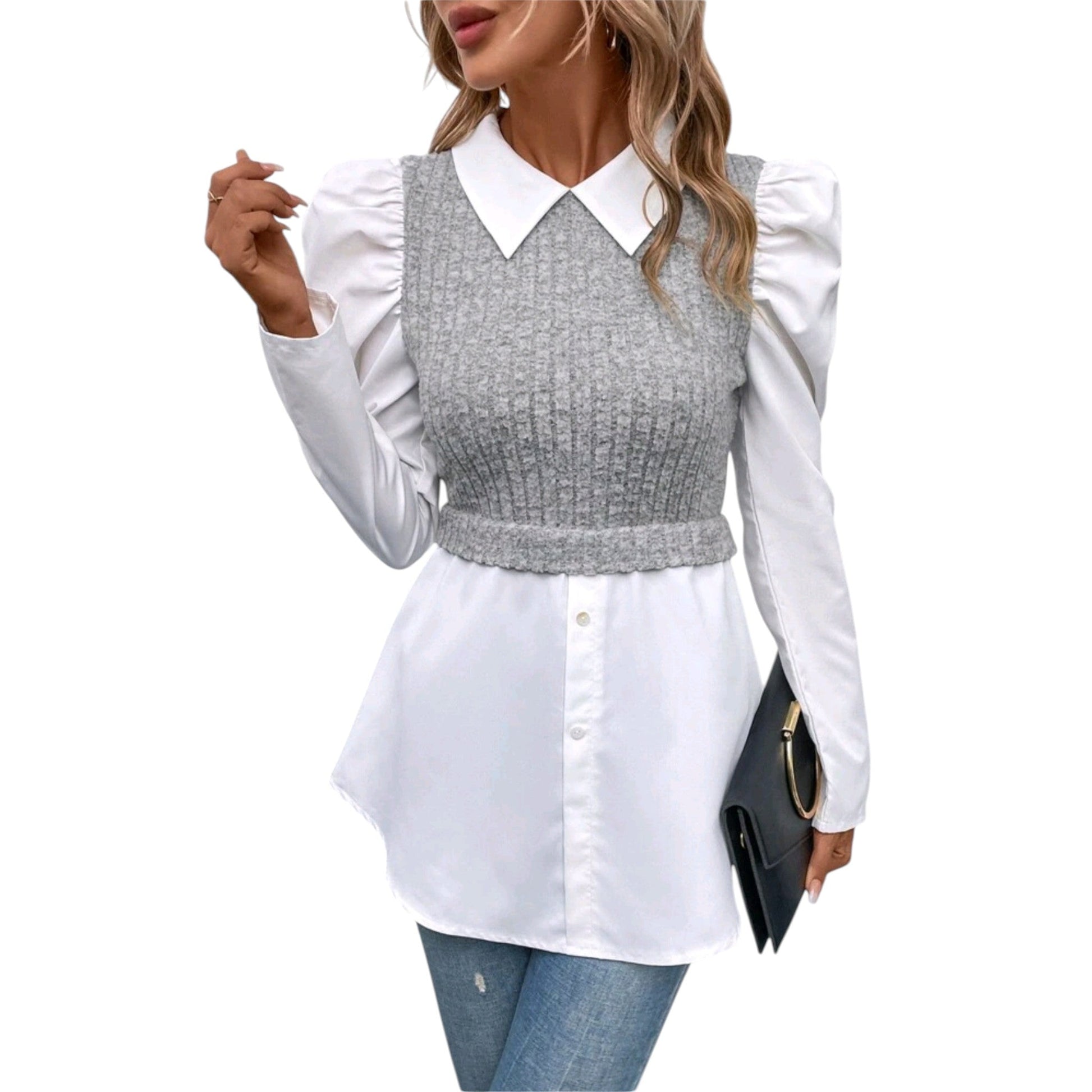 Címke nélküli, szürke és fehér, kötött mellényes, hosszú ujjú, galléros.