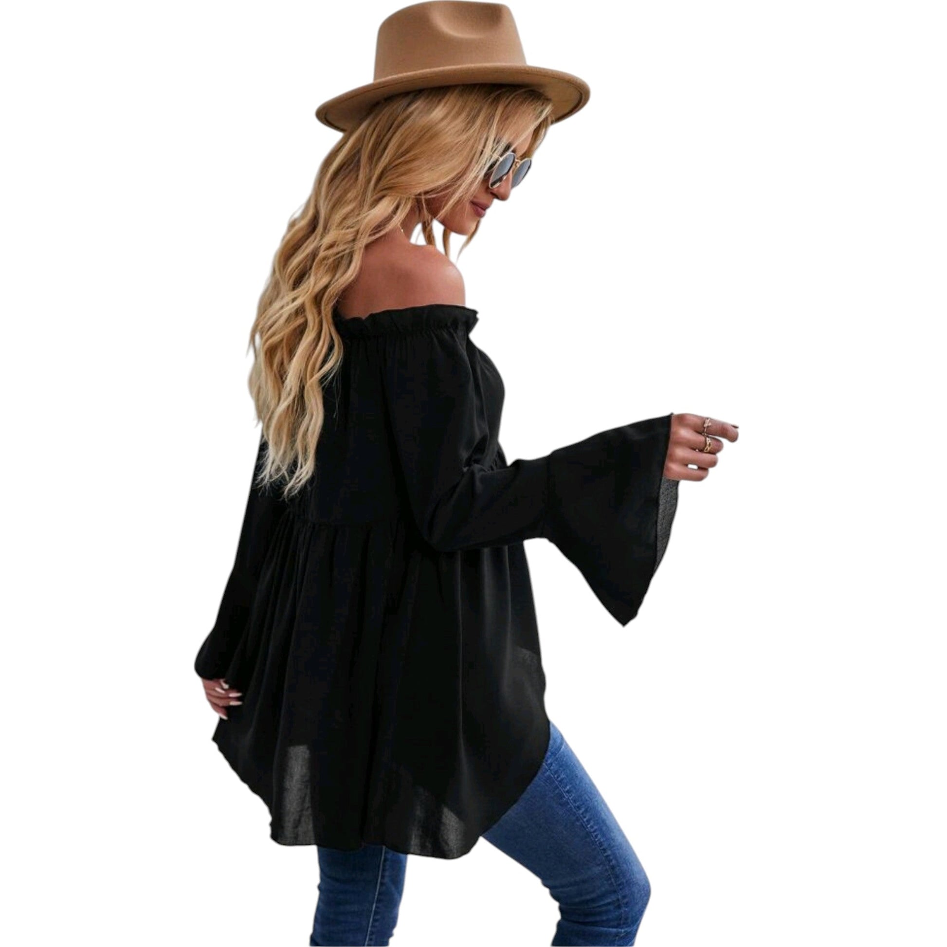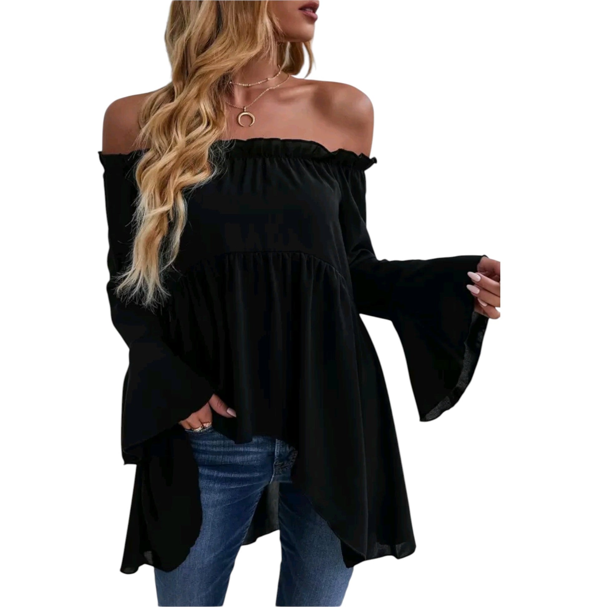 Címke nélküli, fekete, ejtett vállú, fodros, harangujjú.