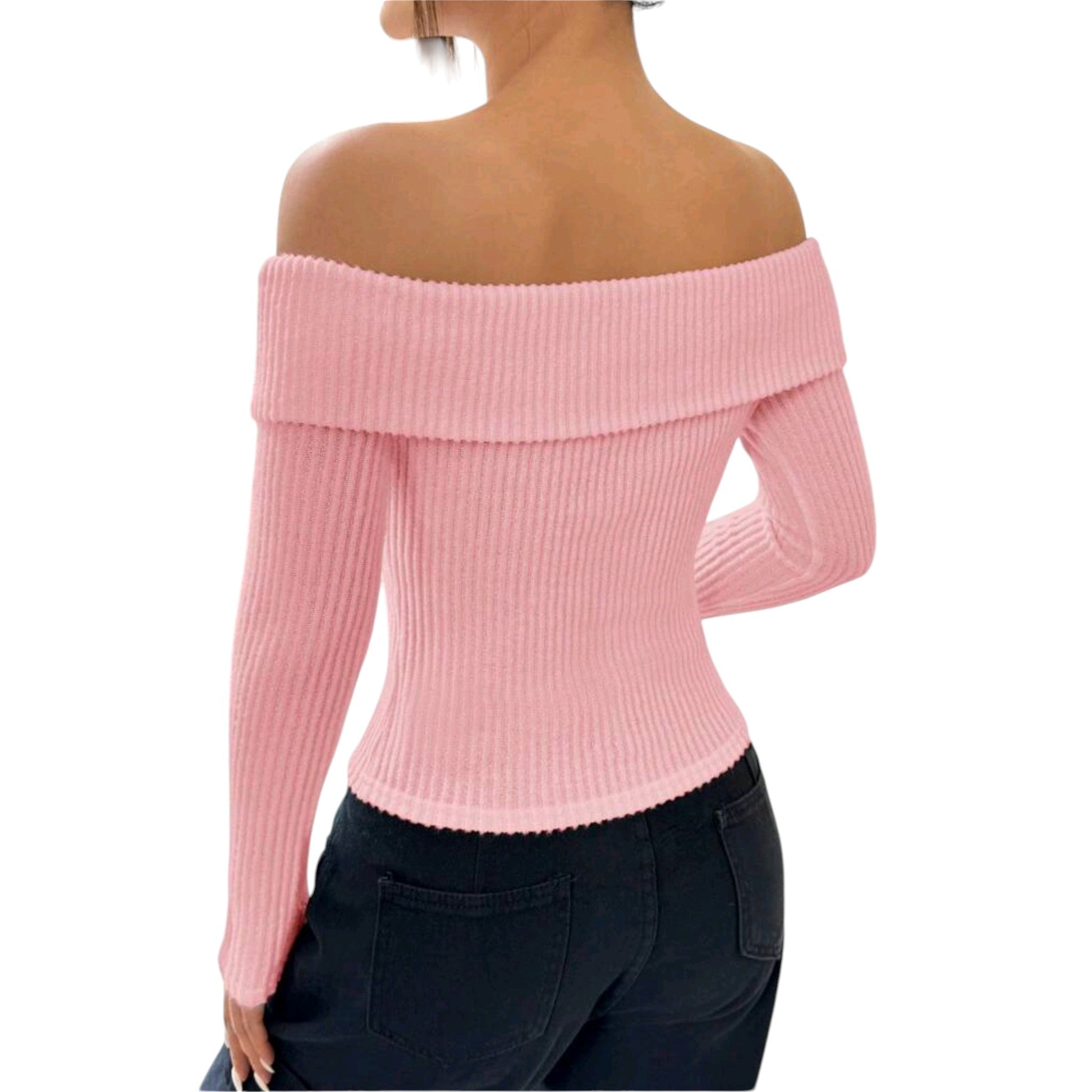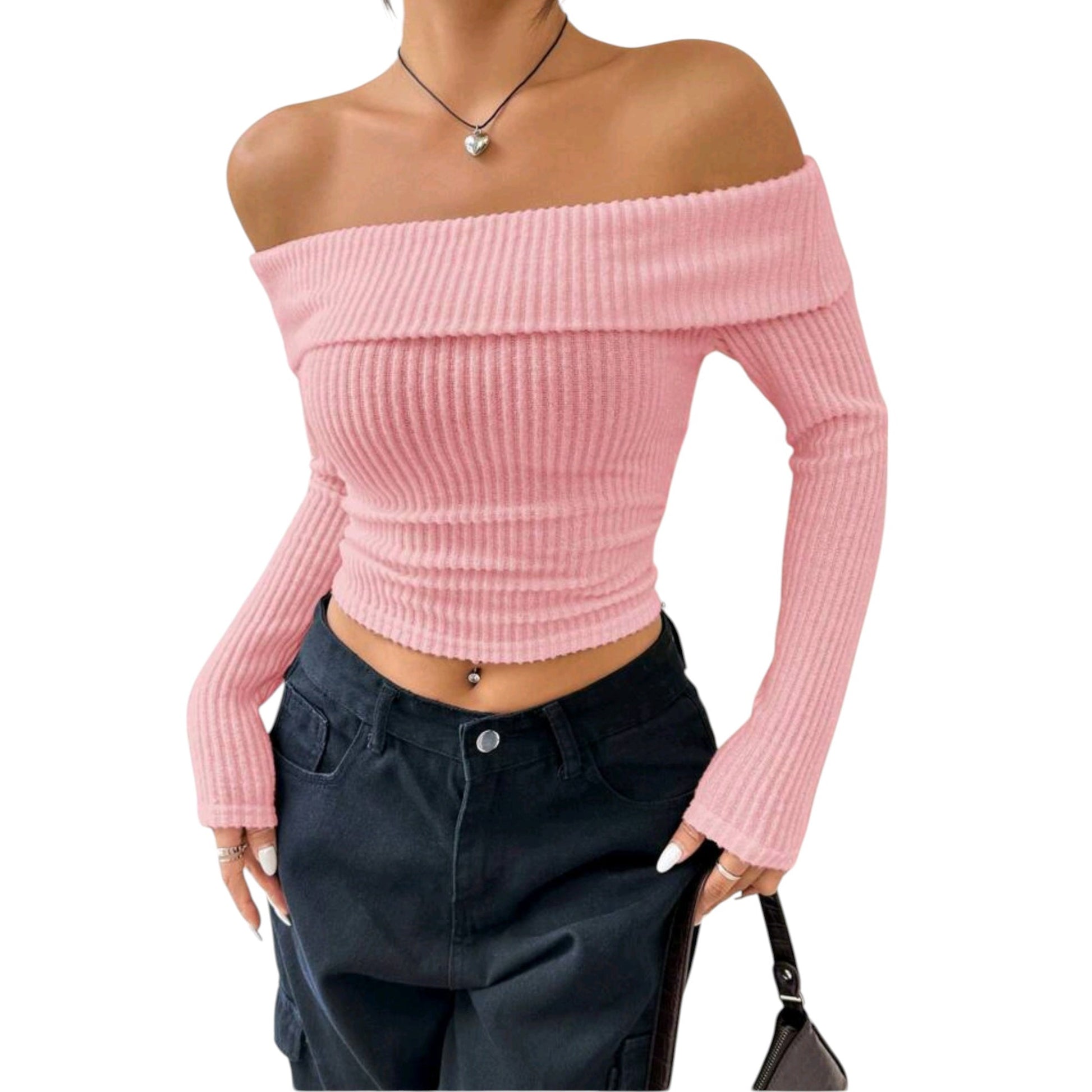 Címke nélküli, rózsaszín, ejtett vállú, bordázott, hosszú ujjú, crop.