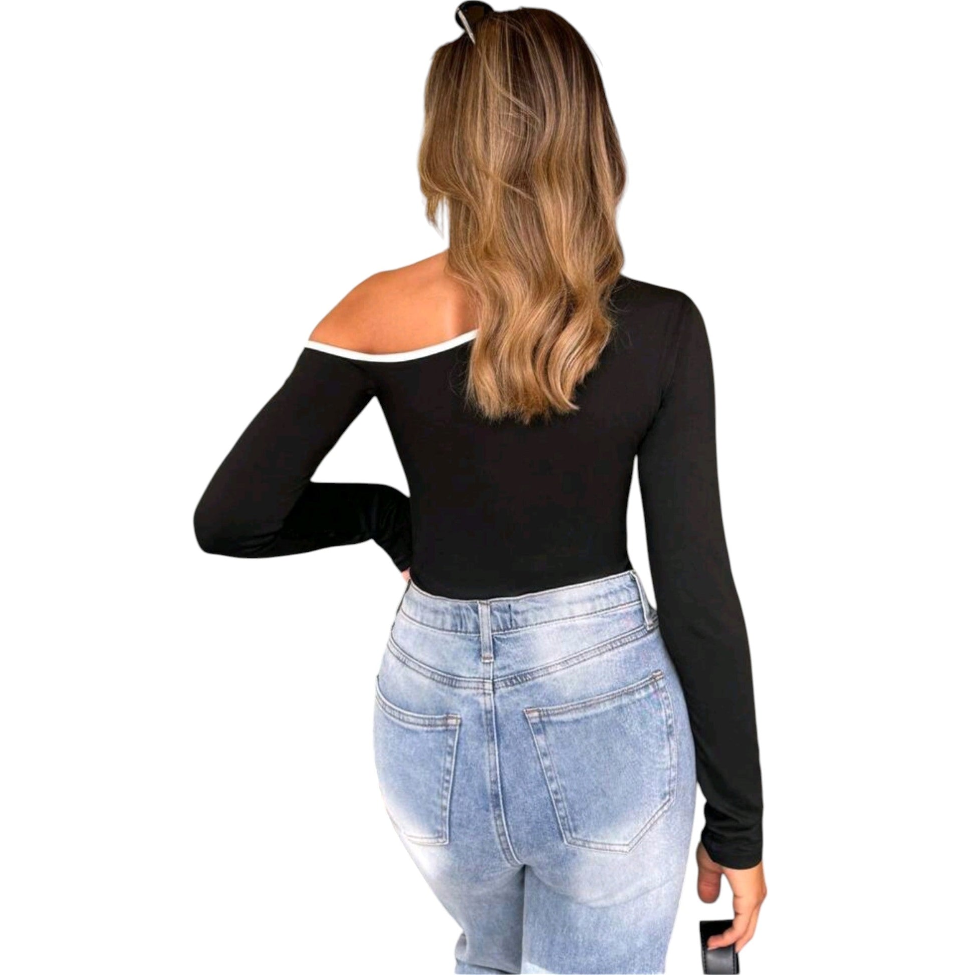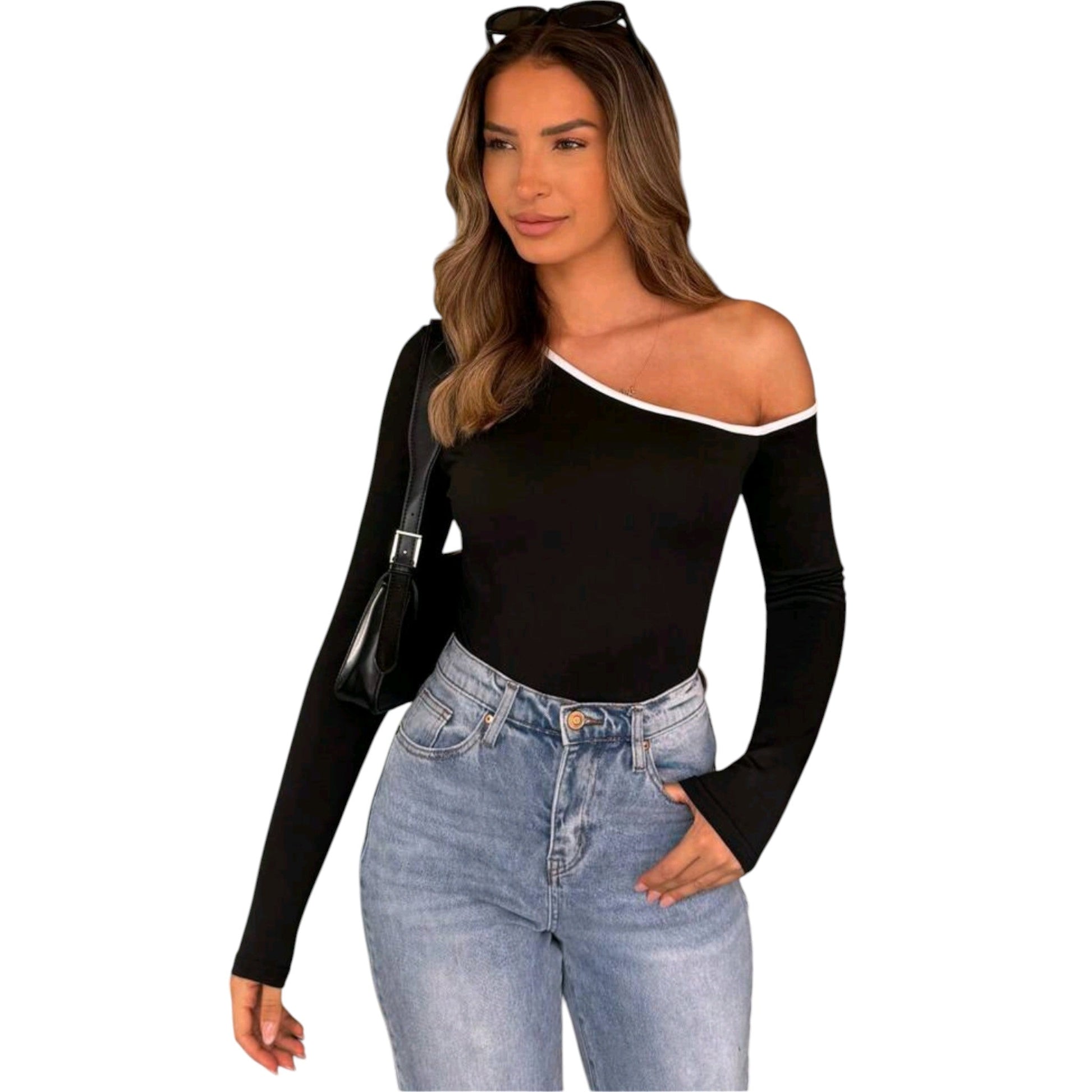 Címke nélküli, fekete, aszimmetrikus nyakú, hosszú ujjú, fehér szegéllyel.