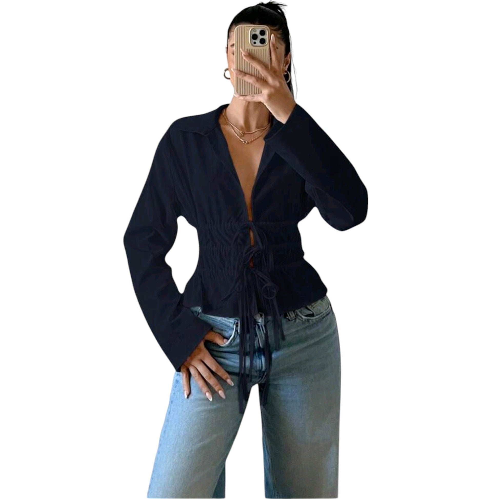Címke nélküli, fekete, hosszú ujjú, mély V-nyakú, húzott derék.
