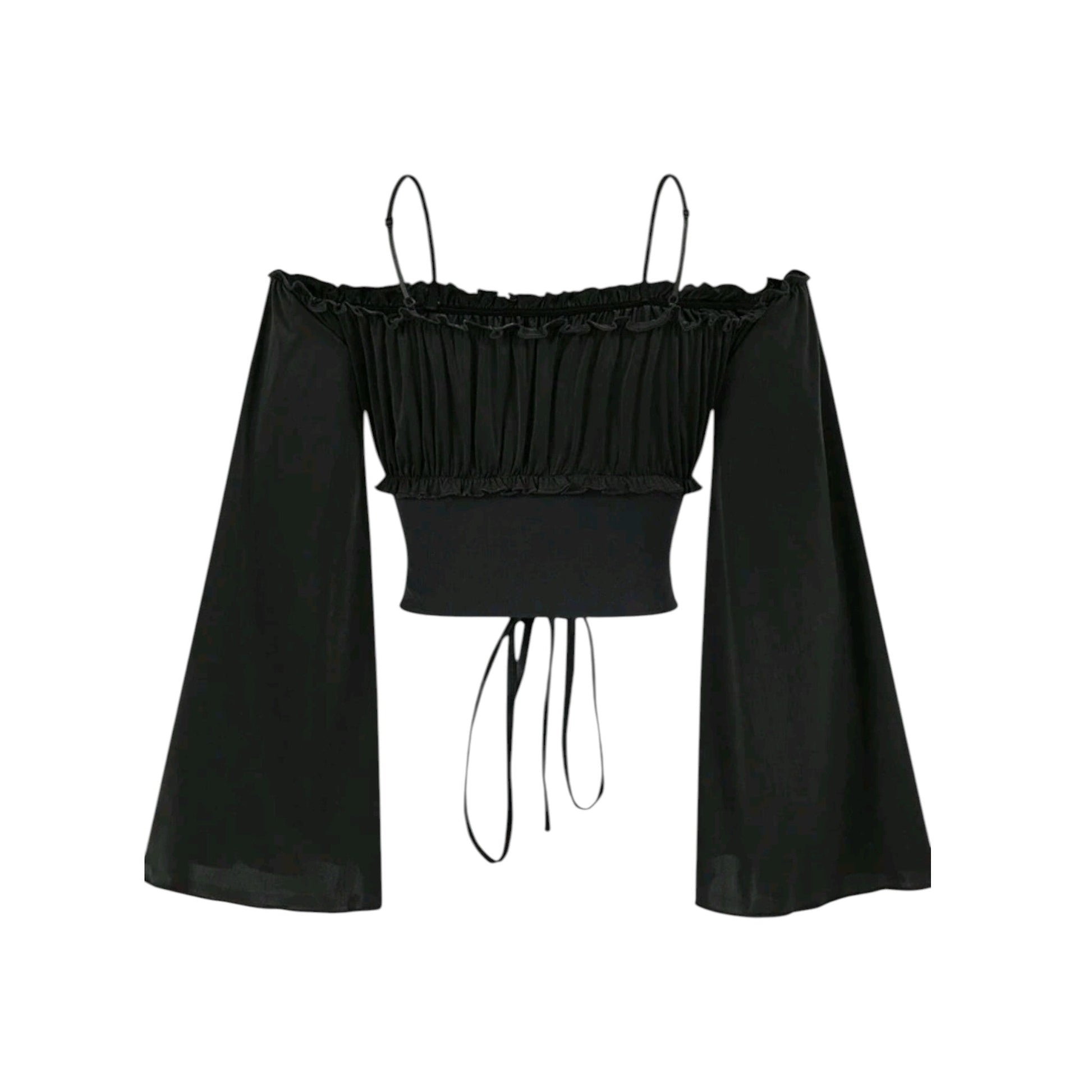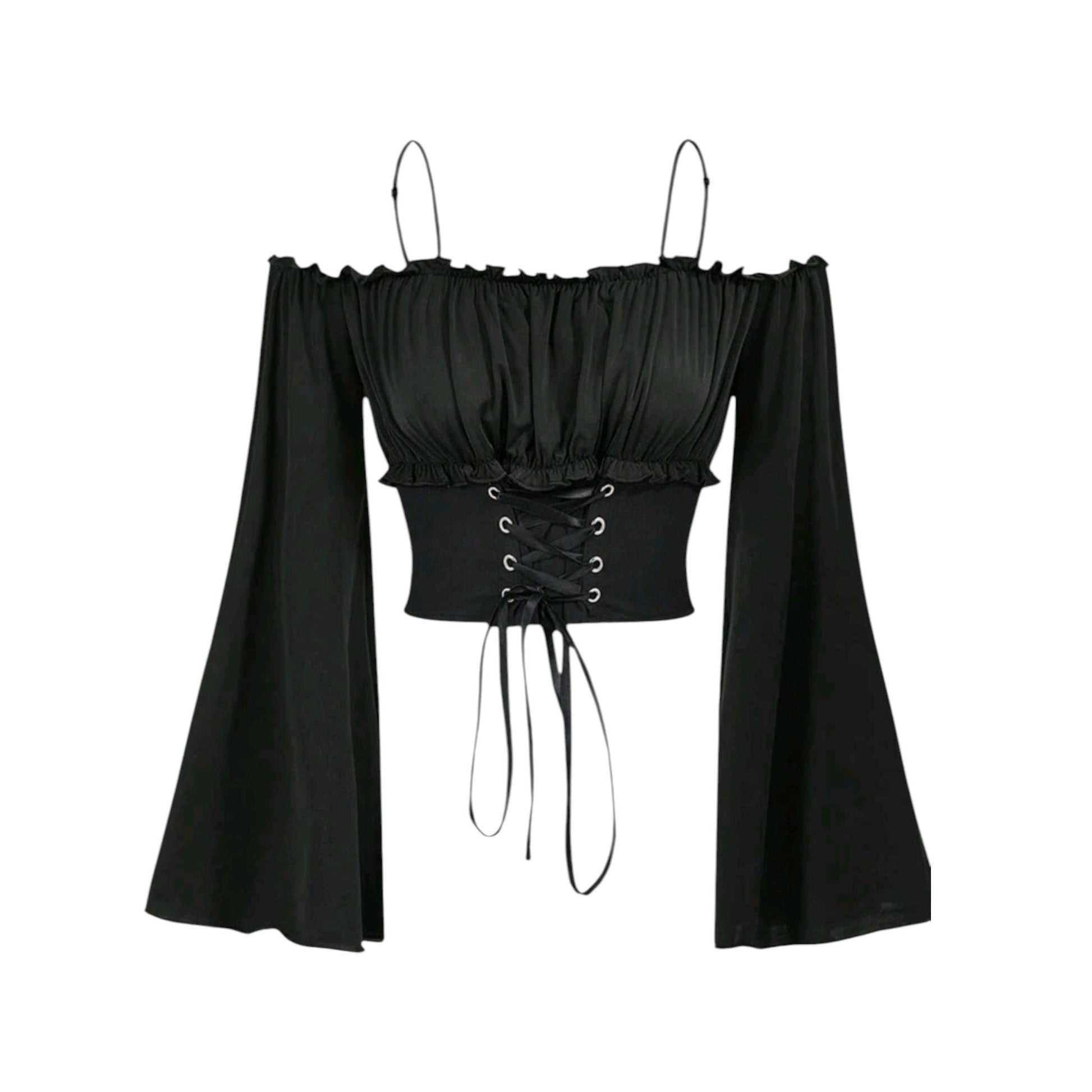 Címke nélküli, fekete, fűzős, váll nélküli, harangujjú.