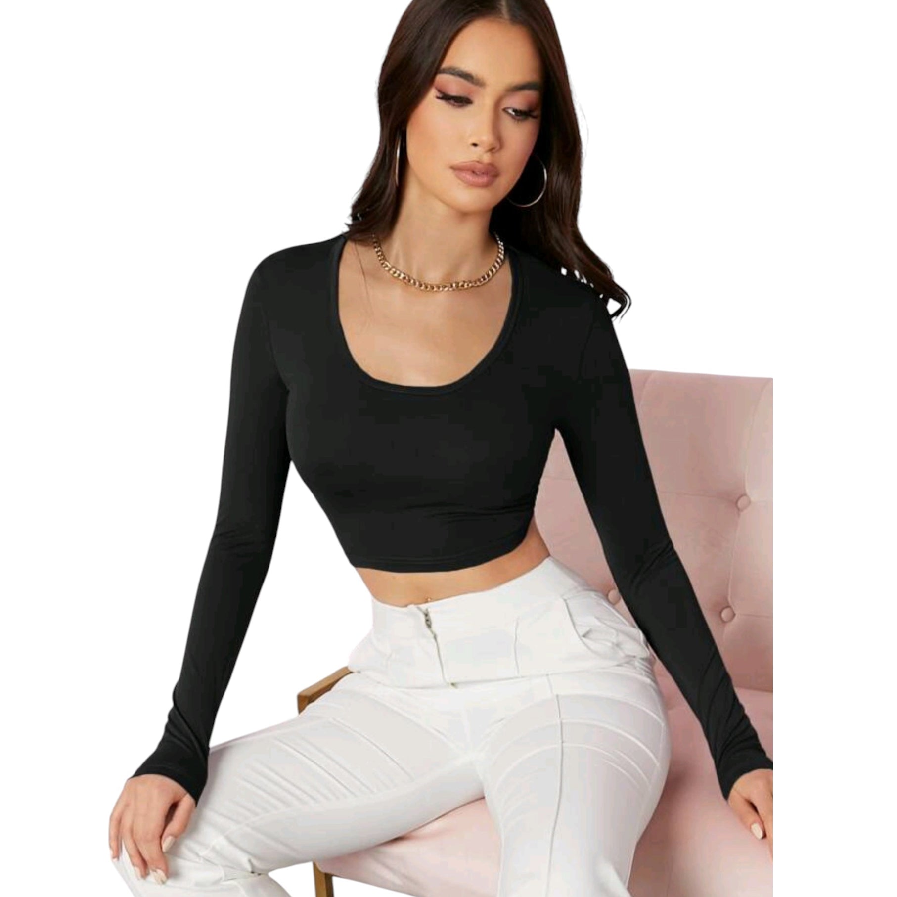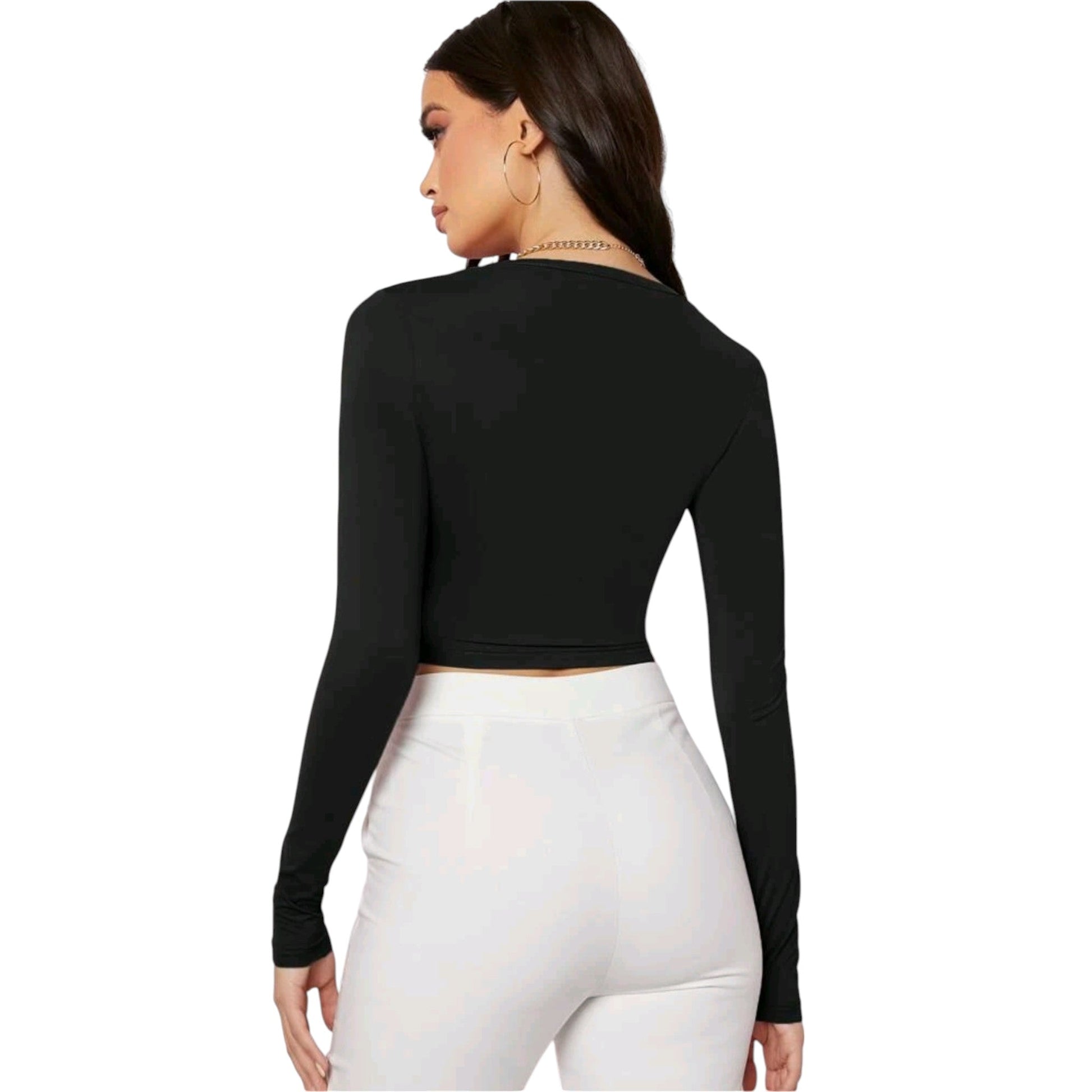 Címke nélküli, fekete, hosszú ujjú, mélyen dekoltált, crop top.