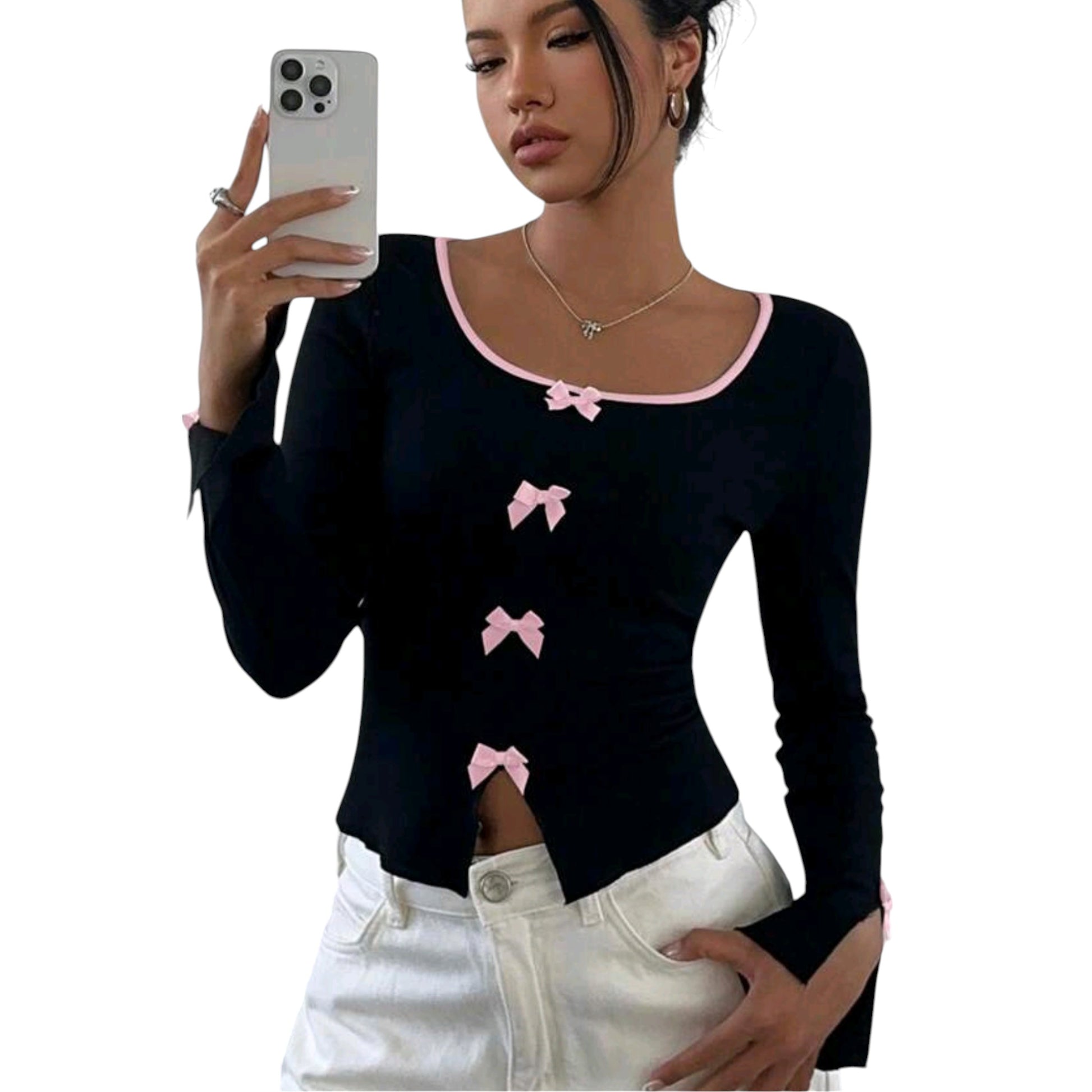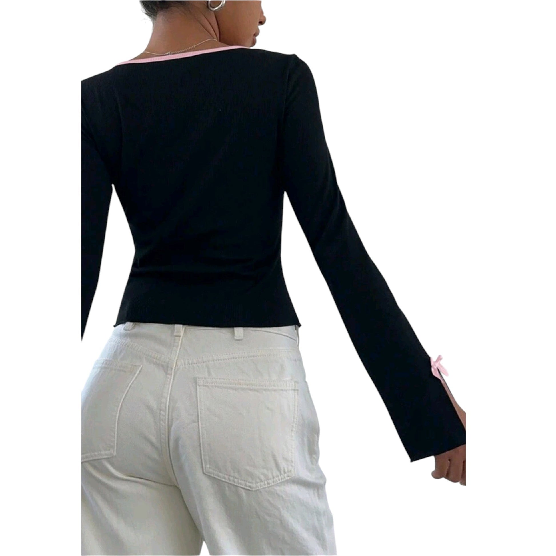 Címke nélküli, fekete, hosszú ujjú, pink szegéllyel, elől masni díszítéssel, alul gombos.