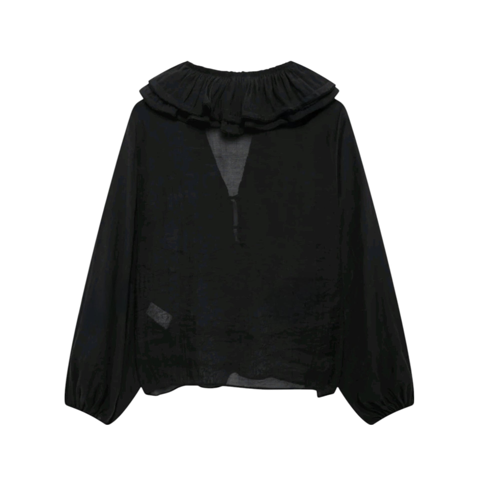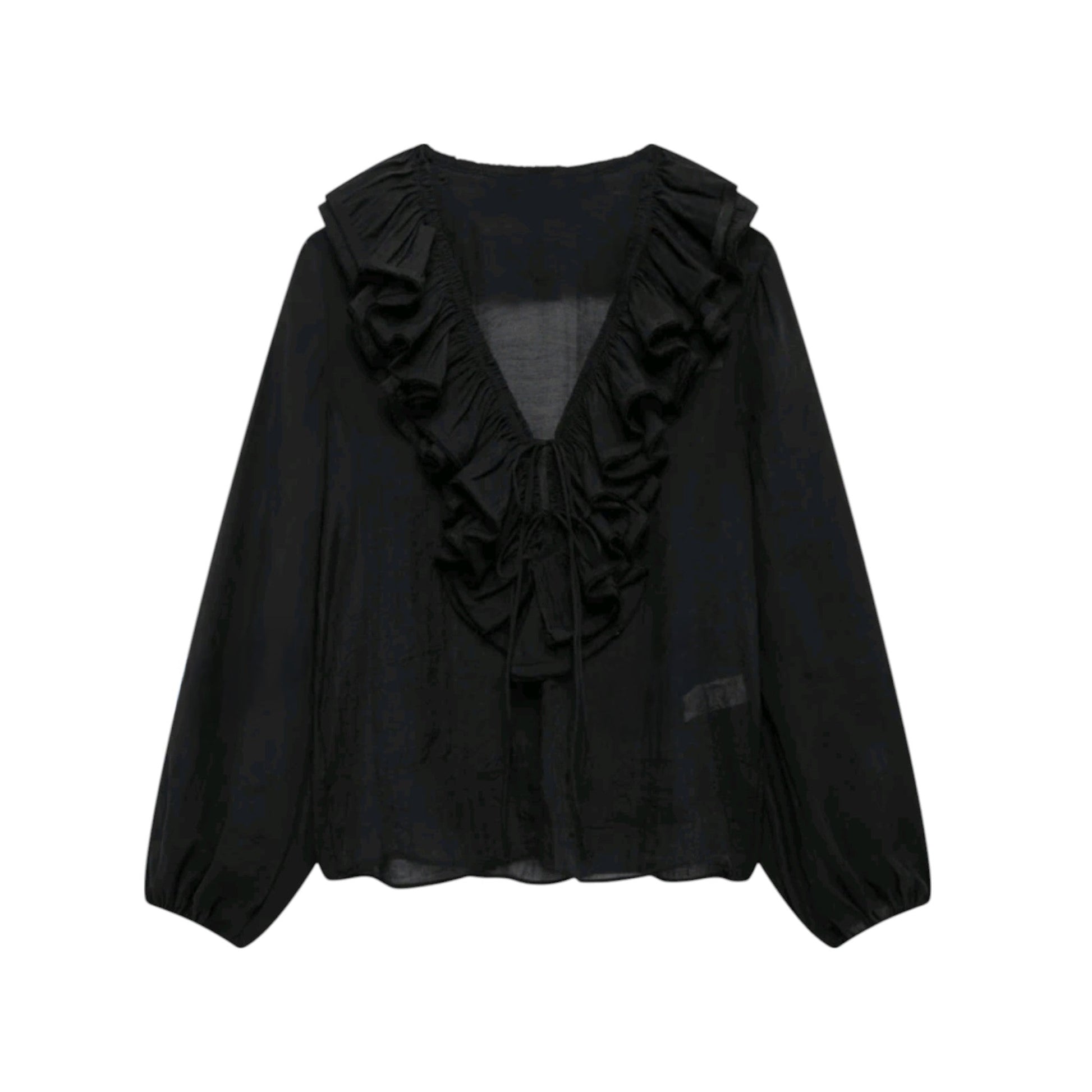 Címke nélküli, fekete, hosszú ujjú, V-nyakú, fodros gallérral, megköthető elülső résszel.