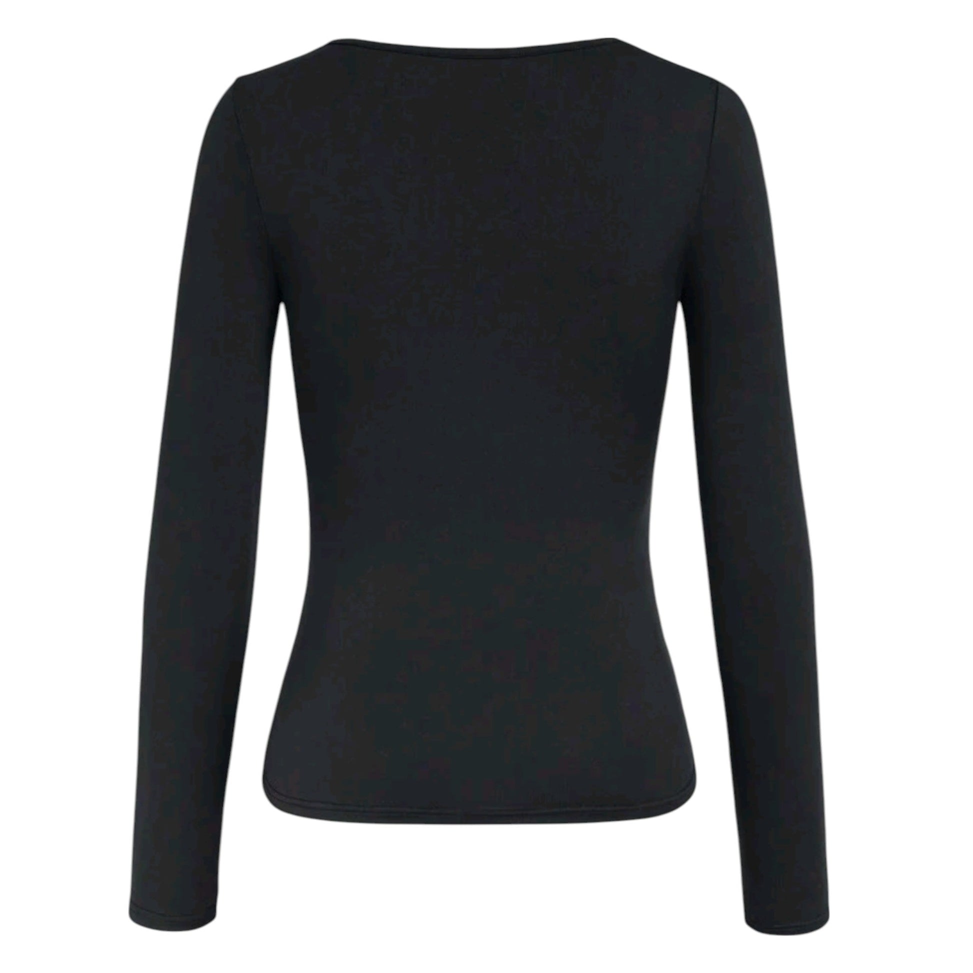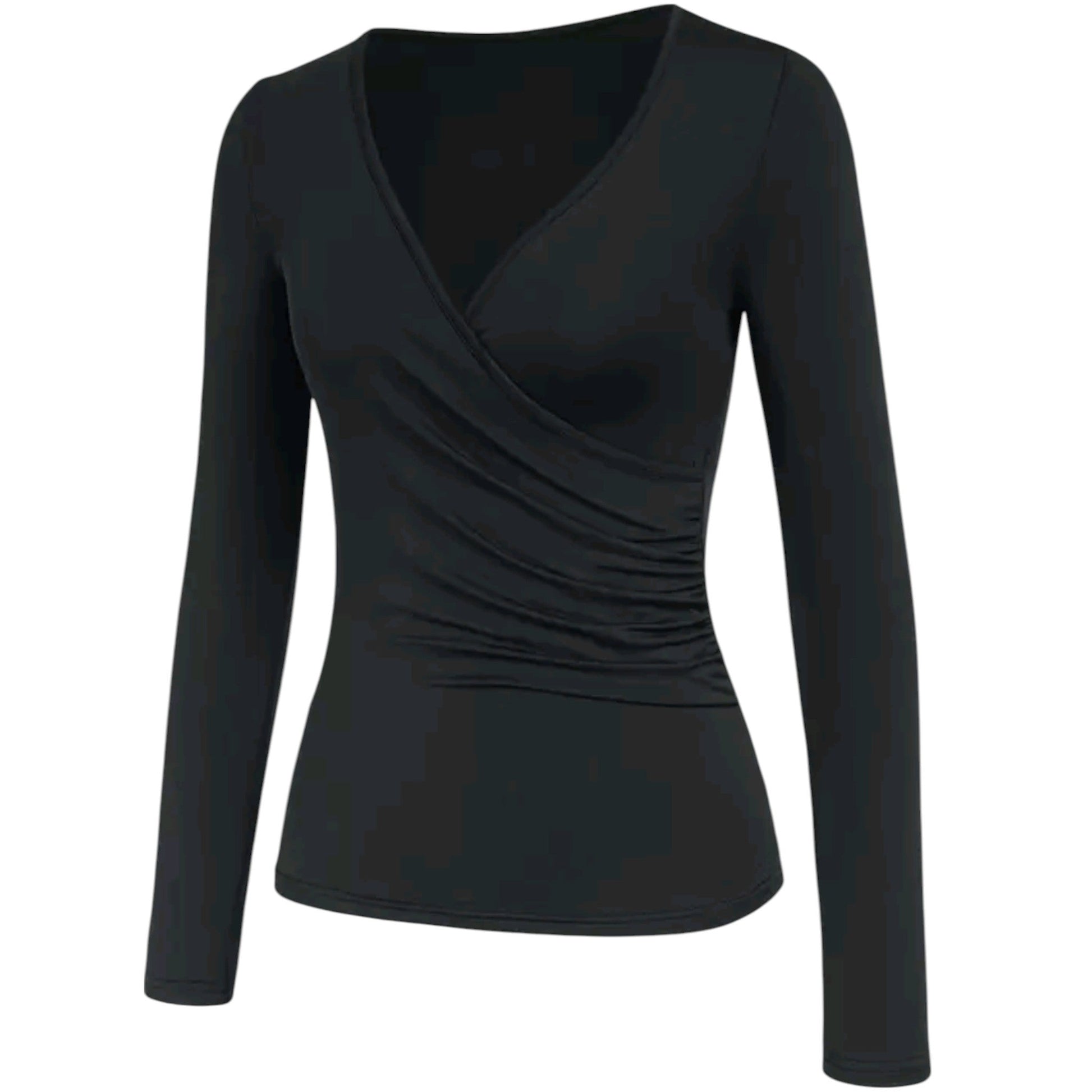 Címke nélküli, fekete, hosszú ujjú, V-nyakú, átlapolt fazonú, oldalán húzott.