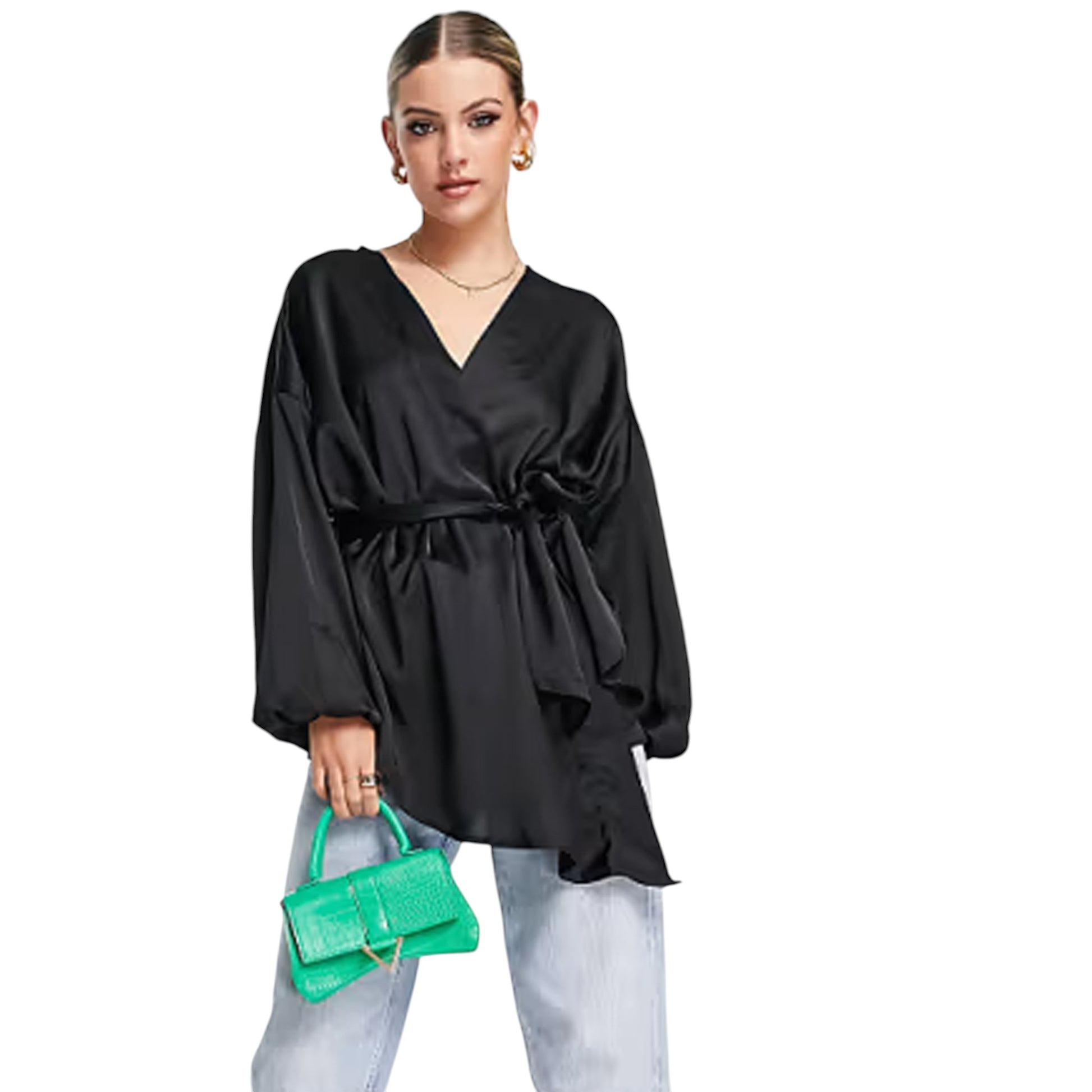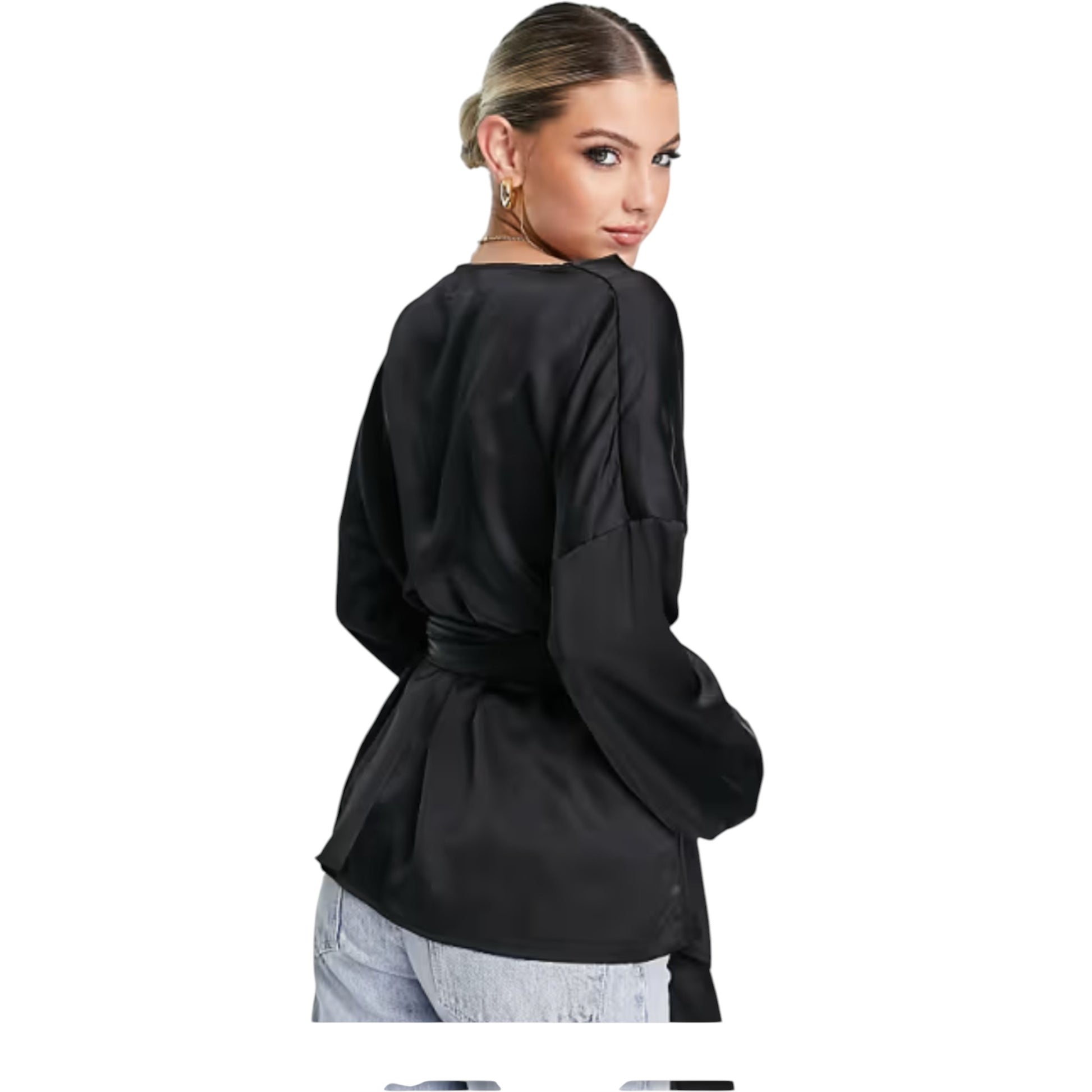 Címke nélküli, fekete, V-nyakú, hosszú ujjú, szatén hatású, bővebb szabású, megkötős.