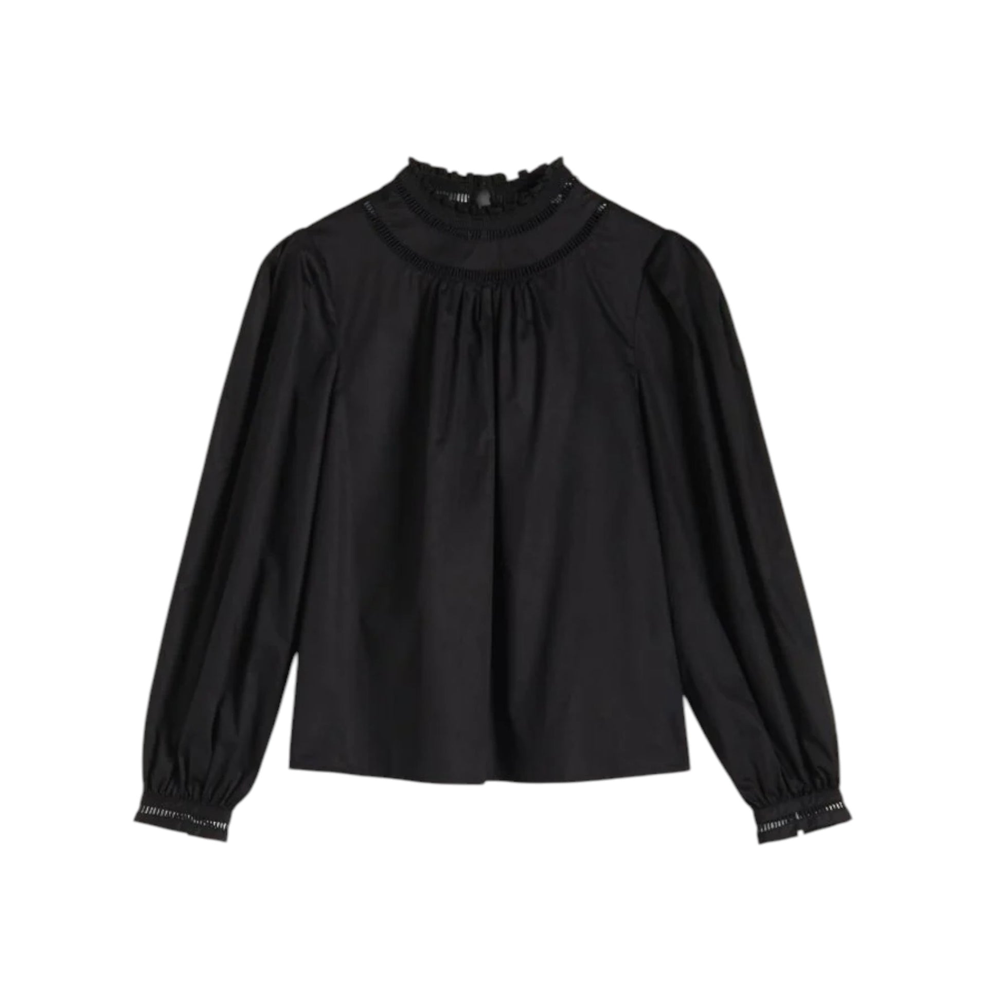 Címke nélküli, fekete, magas nyakú, hosszú ujjú, fodor és hímzés díszítésű.