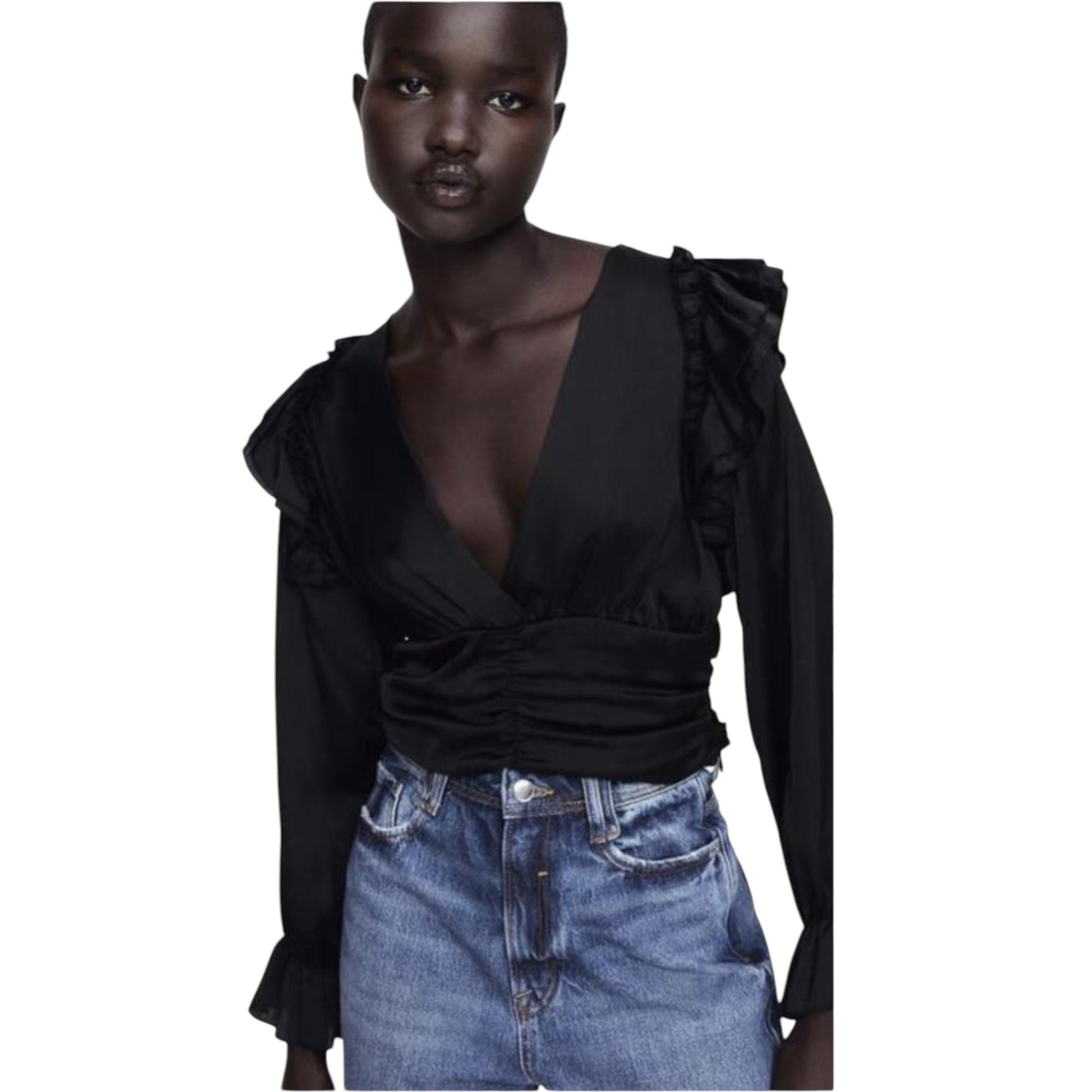 Címke nélküli, fekete, V-nyakú, hosszú ujjú, fodor díszítésű.
