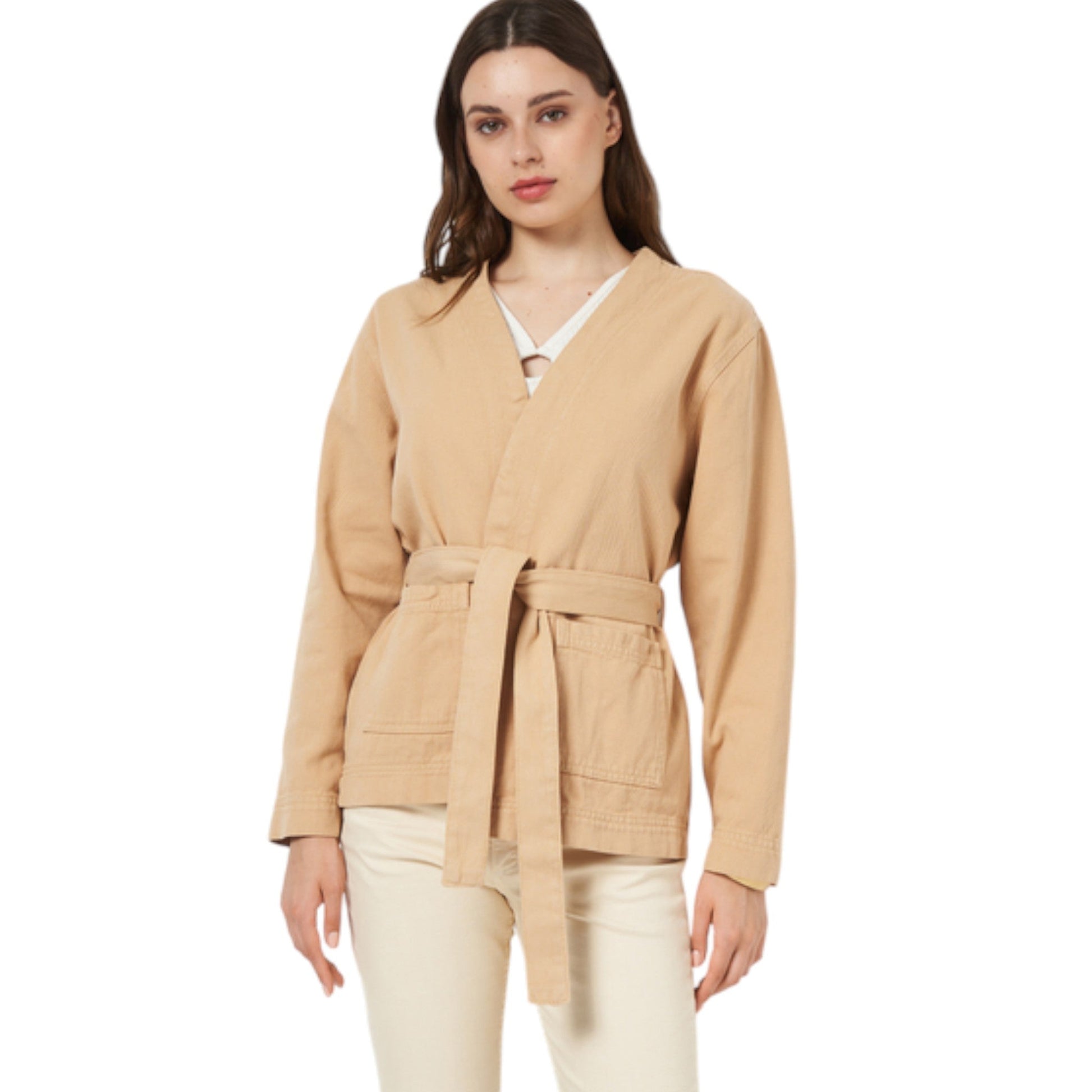Címke nélküli, bézs, V-nyakú, hosszú ujjú, karcsúsított, vékony, vászonszerű anyagú jacket, elöl átlapolt, megköthető.