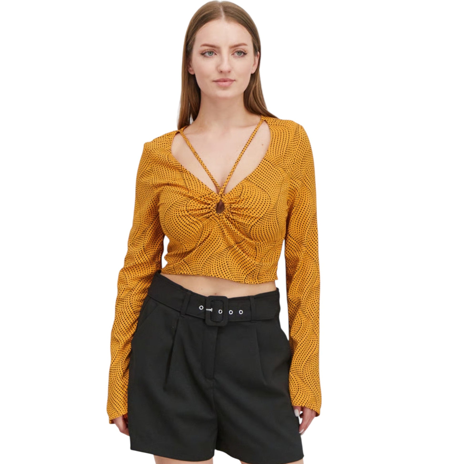 Címke nélküli, mustár alapszínű fekete pöttyös és hullámos mintás, hosszú ujjú, V-nyakú, elöl gyűrött és a nyakkivágásnál pántos top.