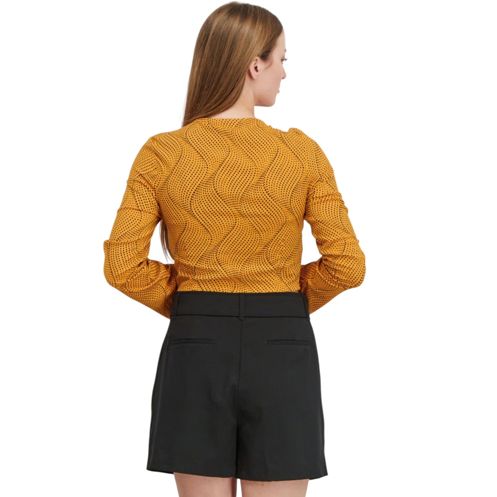 Címke nélküli, mustár alapszínű fekete pöttyös és hullámos mintás, hosszú ujjú, V-nyakú, elöl gyűrött és a nyakkivágásnál pántos top.