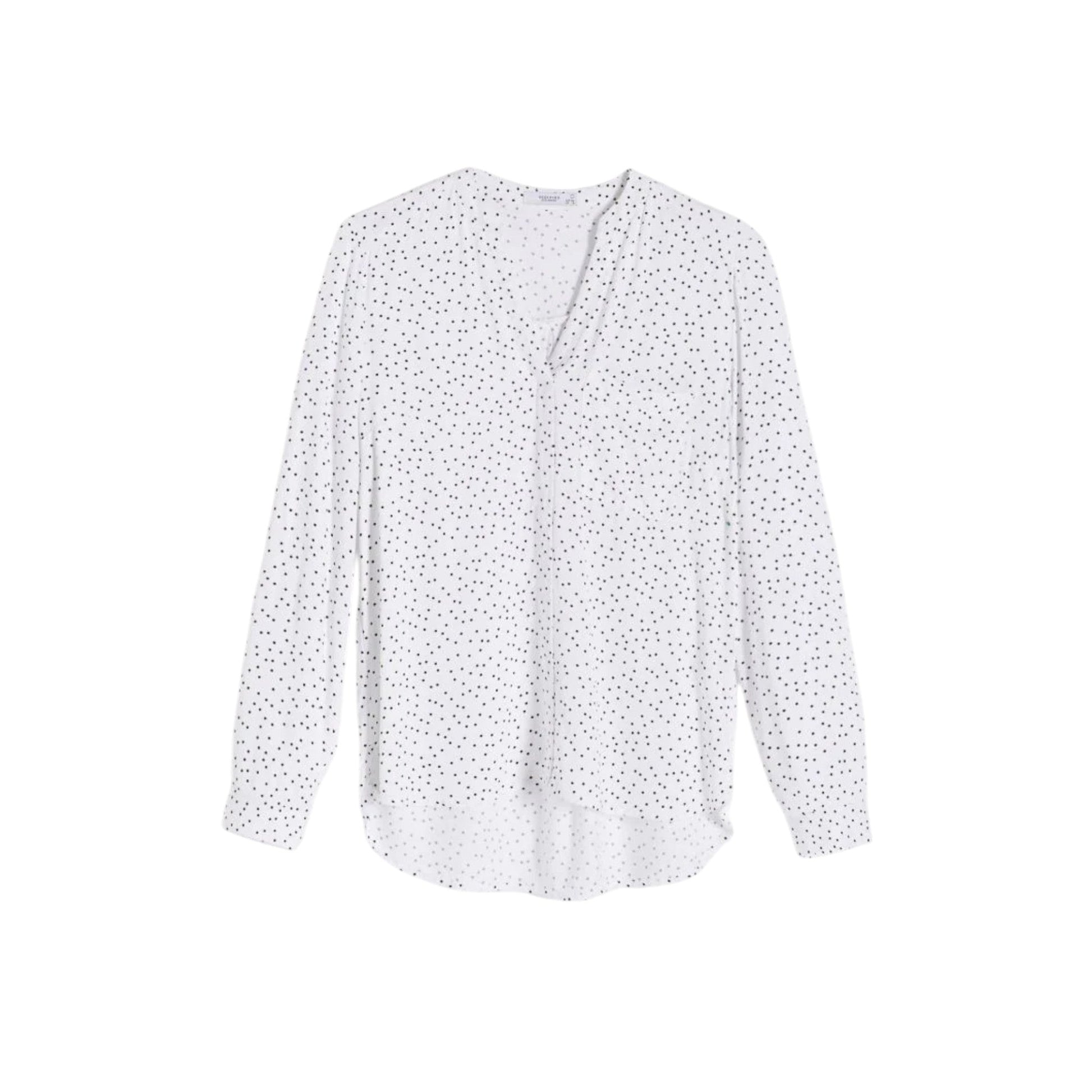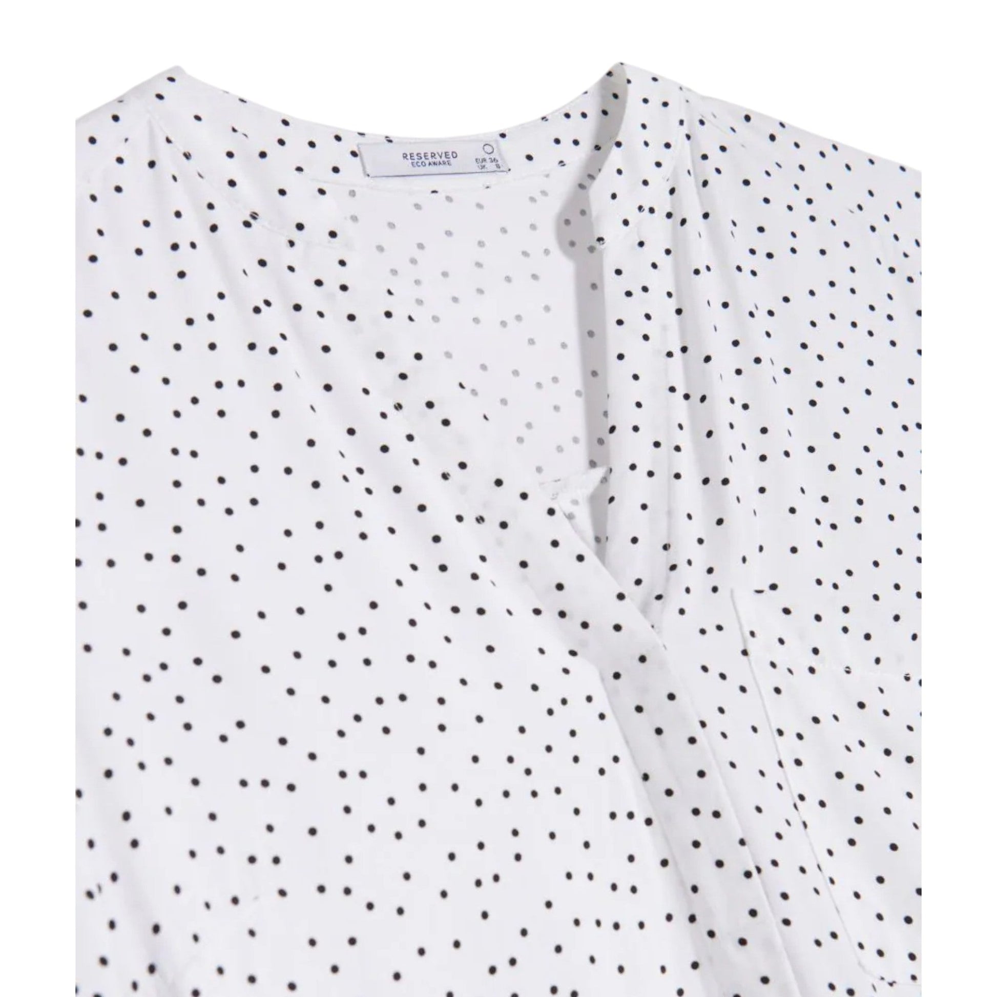 Címke nélküli, fehér alapszínű fekete pöttyös, V-nyakú, hosszú ujjú, lekerekített aljú, laza szabású blúz.