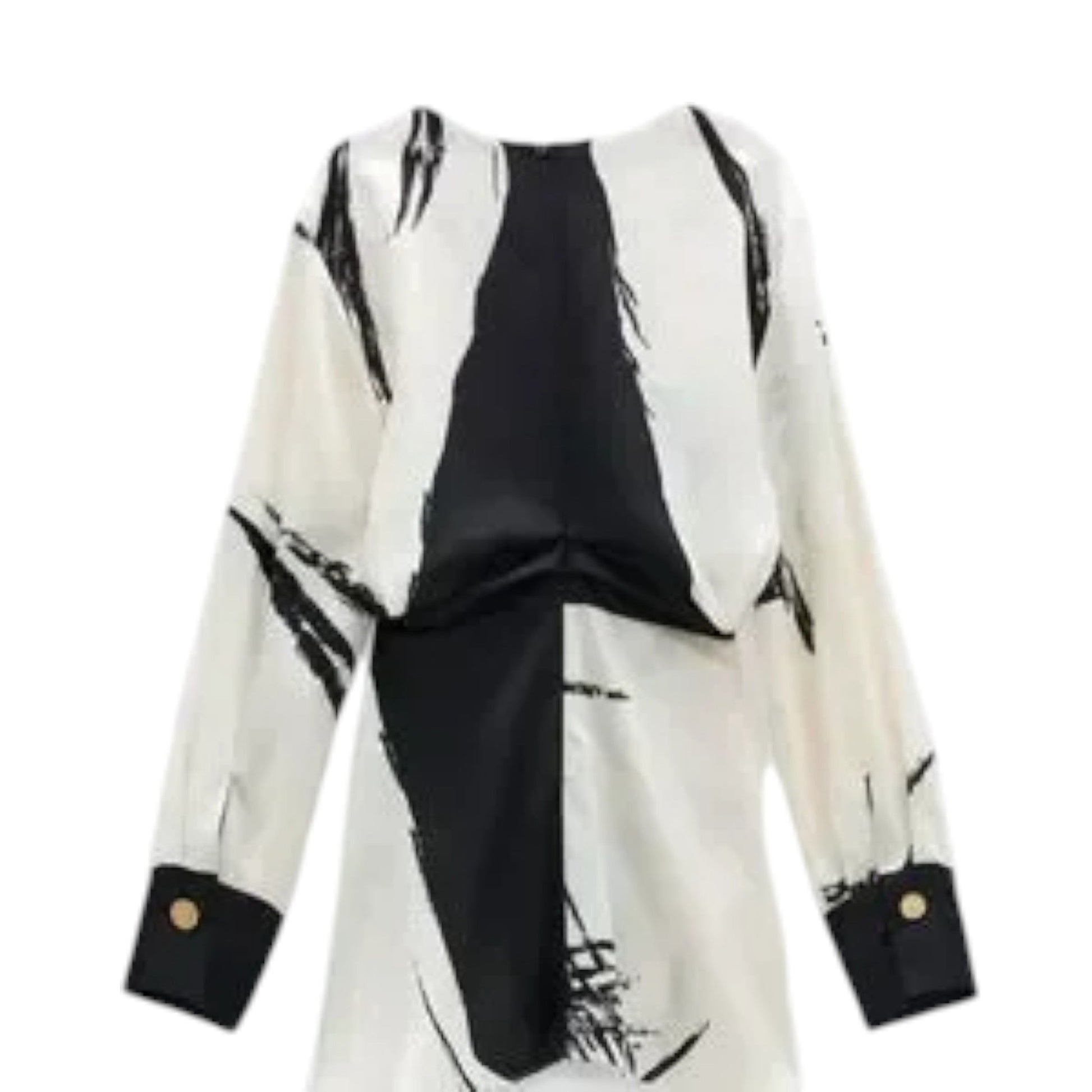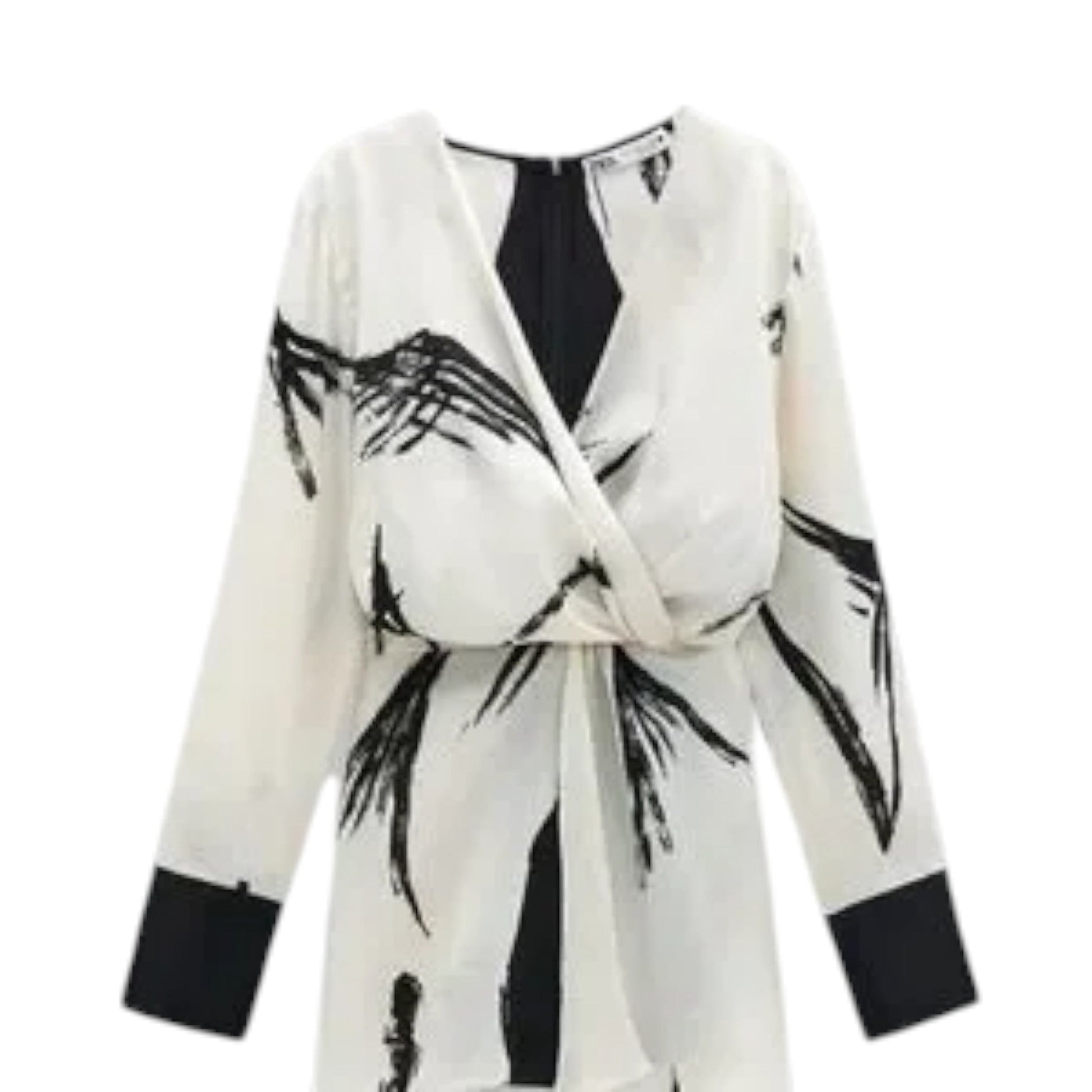 Címke nélküli, fehér alapszínű fekete ecsetvonás mintás, hosszú ujjú, V-nyakú, átlapolt elejű mini ruha, fekete belső résszel, vastag fekete mandzsettákkal.