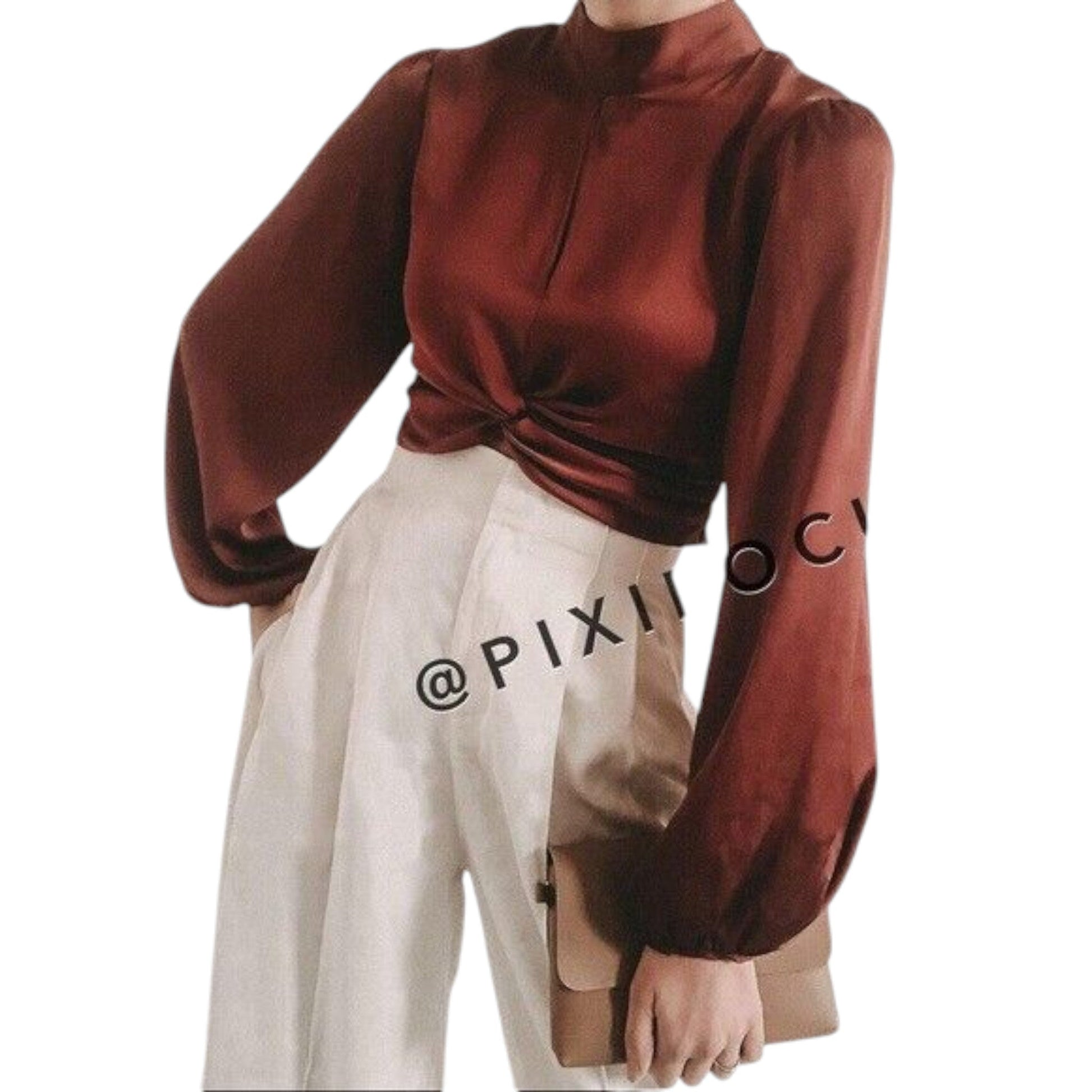 Címke nélküli, rozsdabarna színű, selyem hatású anyagból készült, garbó nyakú, elöl csomózott, bő ujjú, crop fazonú top.
