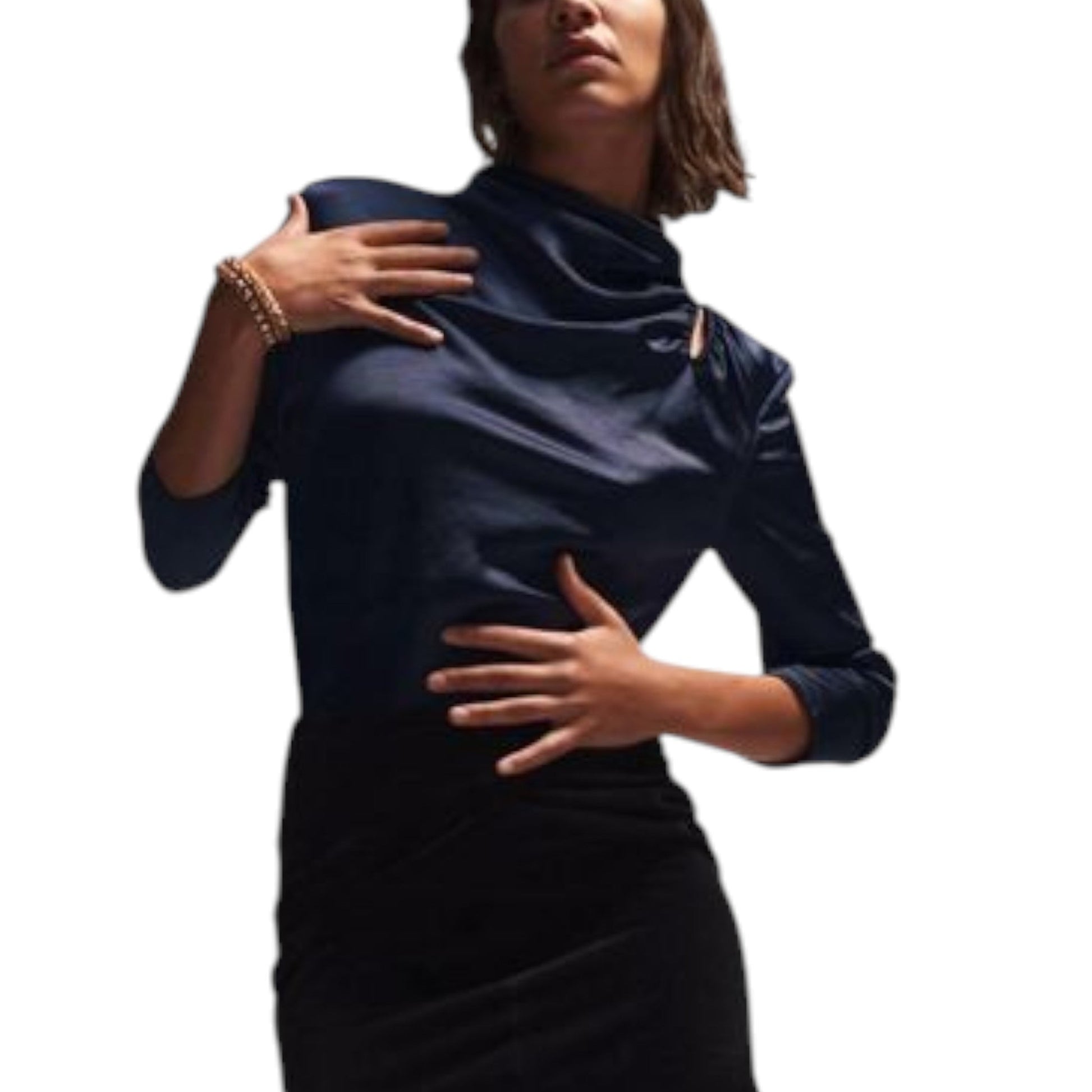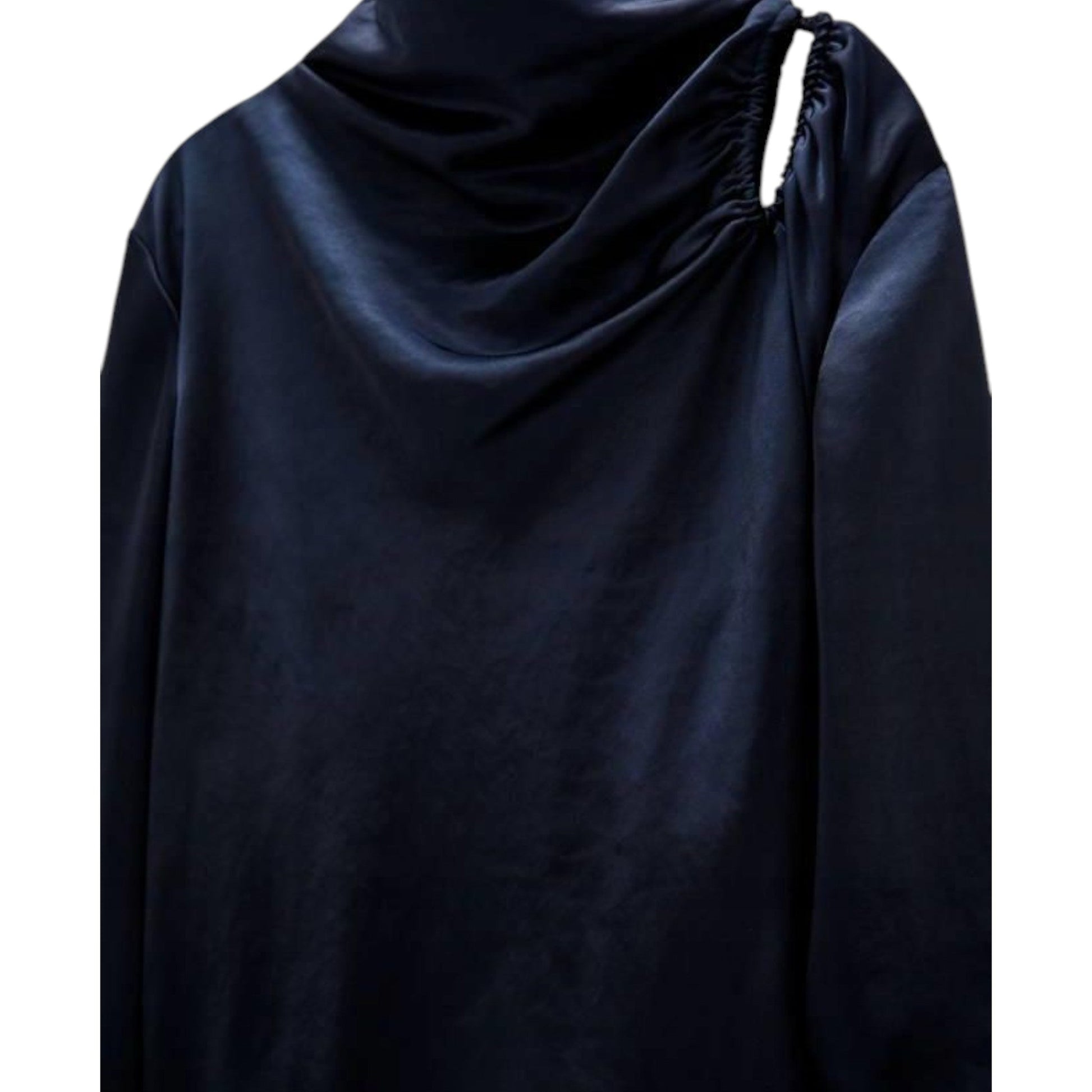 Címke nélküli, sötétkék színű, selyem hatású anyagból készült, csavart hatású garbó nyakú, 3/4 ujjú, aszimmetrikus nyakú top.