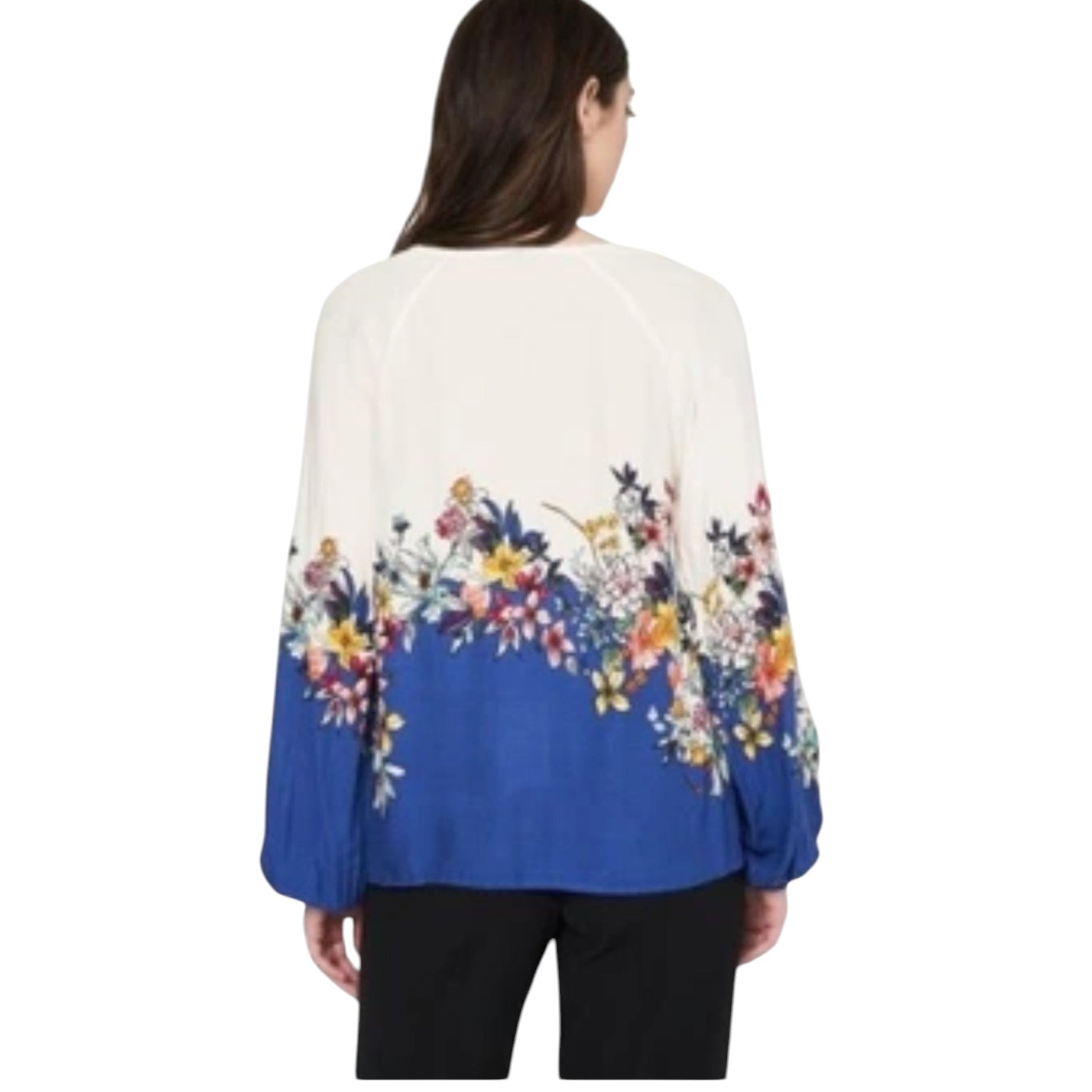 Címke nélküli, fehér, kék és színes virágmintás, hosszú ujjú, kerekített nyakú, bő szabású blúz. A hátrészen a színes virágminta a kék színnel találkozik.