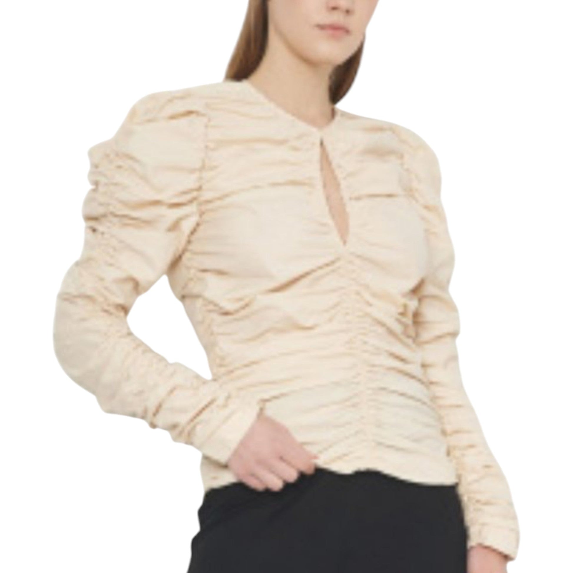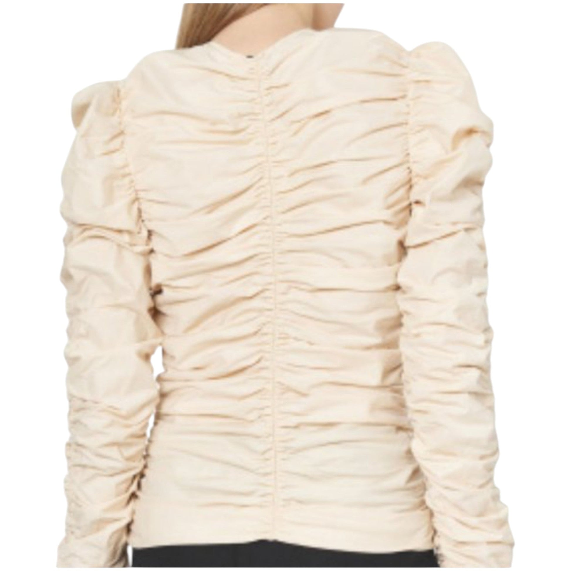 Címke nélküli, bézs, hosszú ujjú, kerek nyakú, elöl kivágással, elöl és hátul is végig ráncolt/drapírozott, puffos vállú felső.