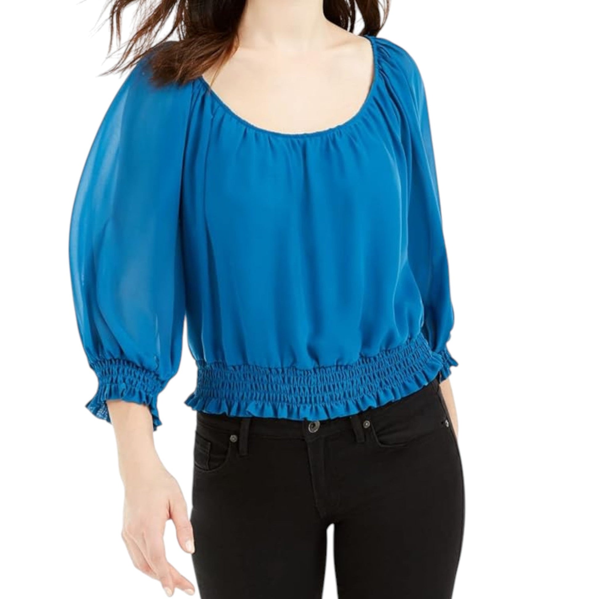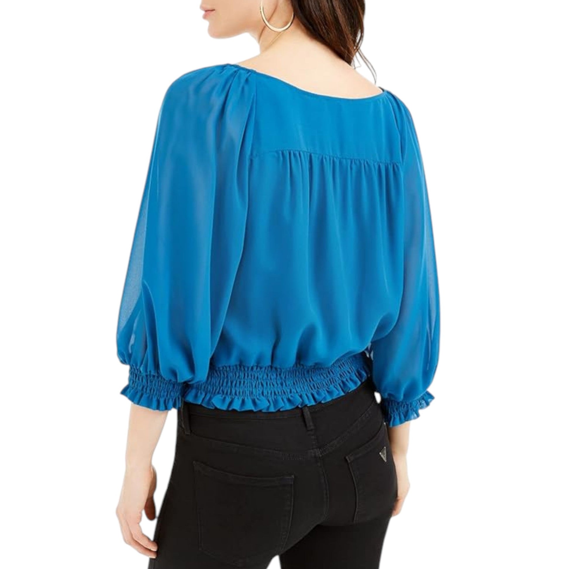 Címke nélküli, kék, rövid, 3/4 ujjú, gumírozott derékrésszel és ujjvéggel, ejtett vállú, enyhén átlátszó anyagú blúz.