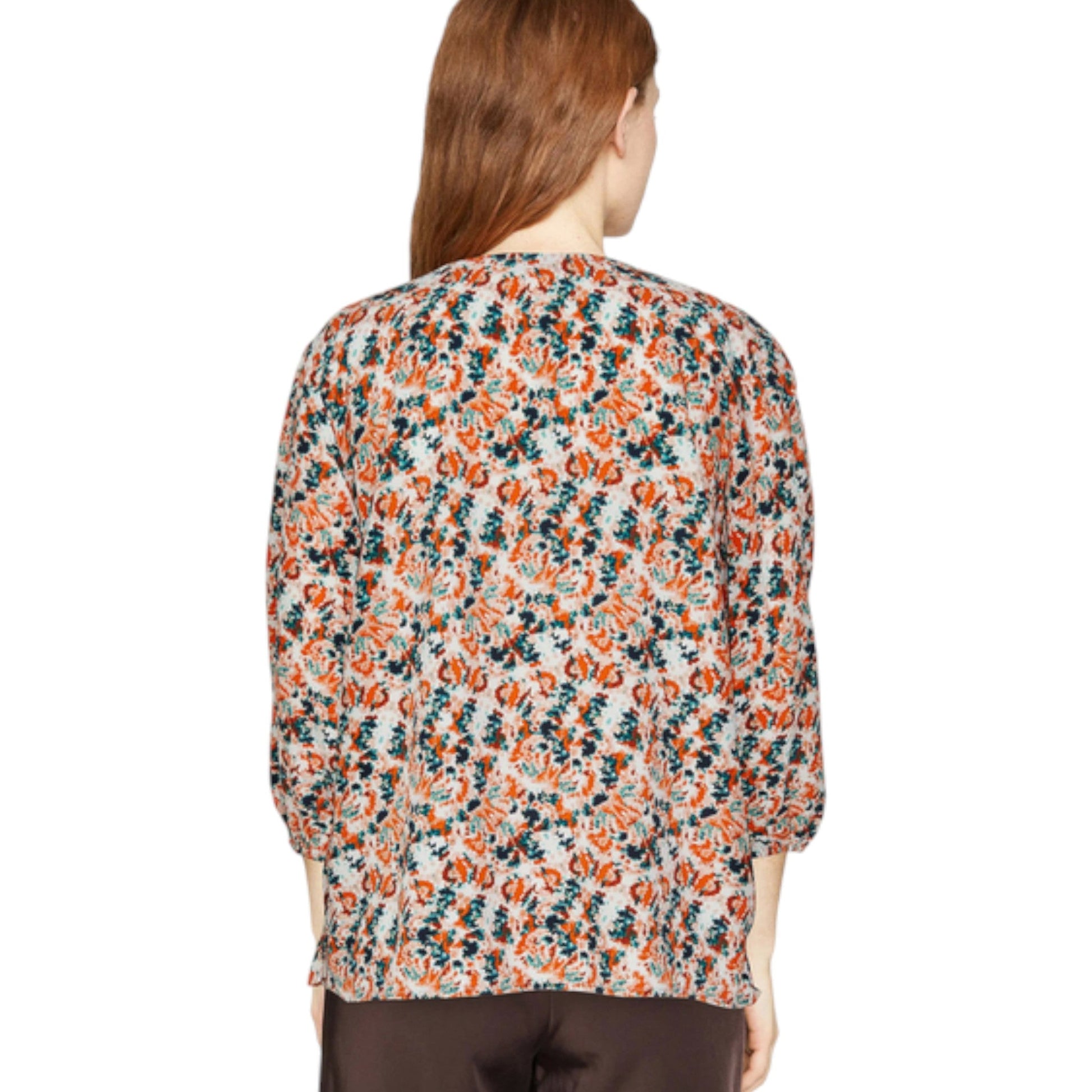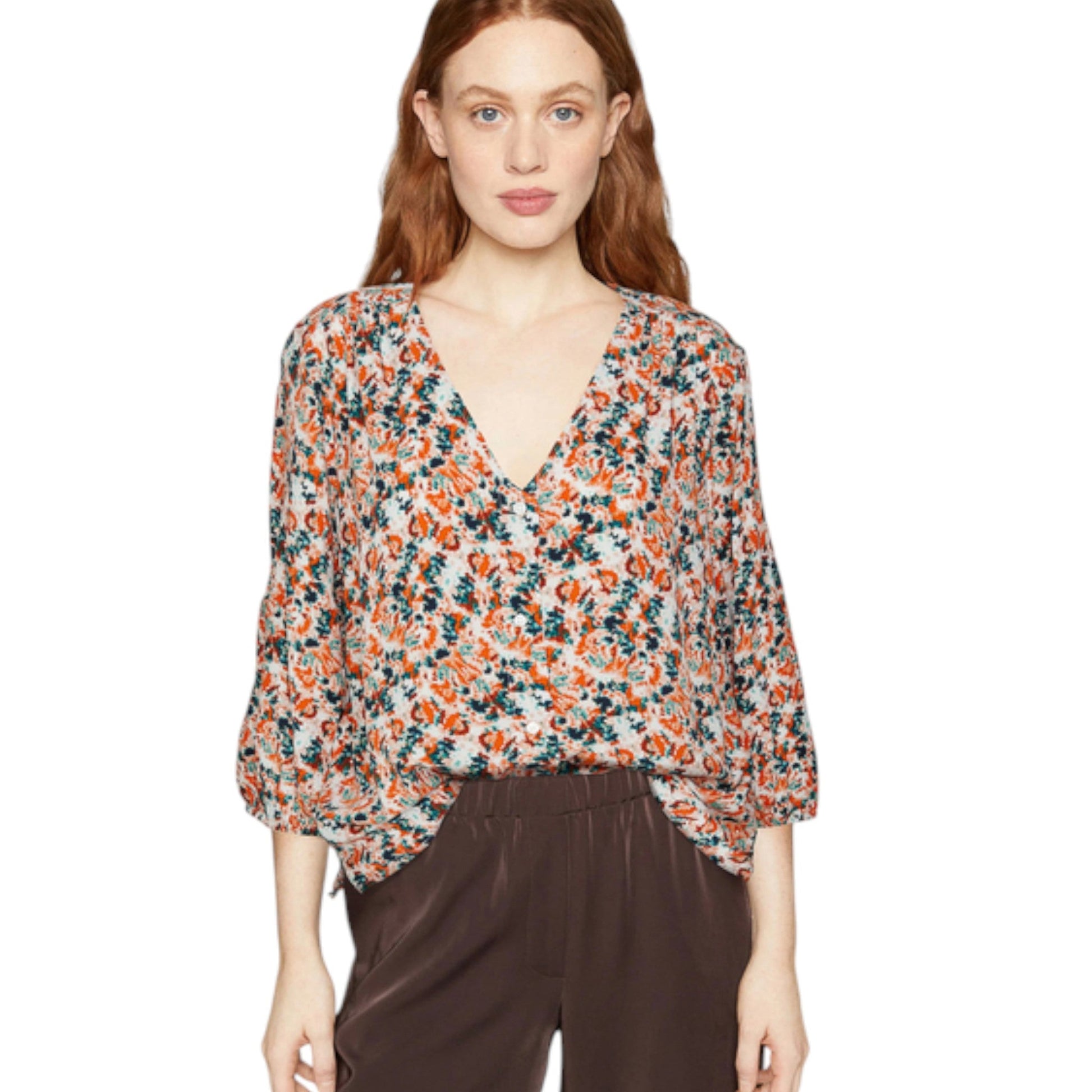Címke nélküli, színes (narancs, zöld, fekete, bézs), virágmintás, 3/4 ujjú, V-nyakú blúz.
