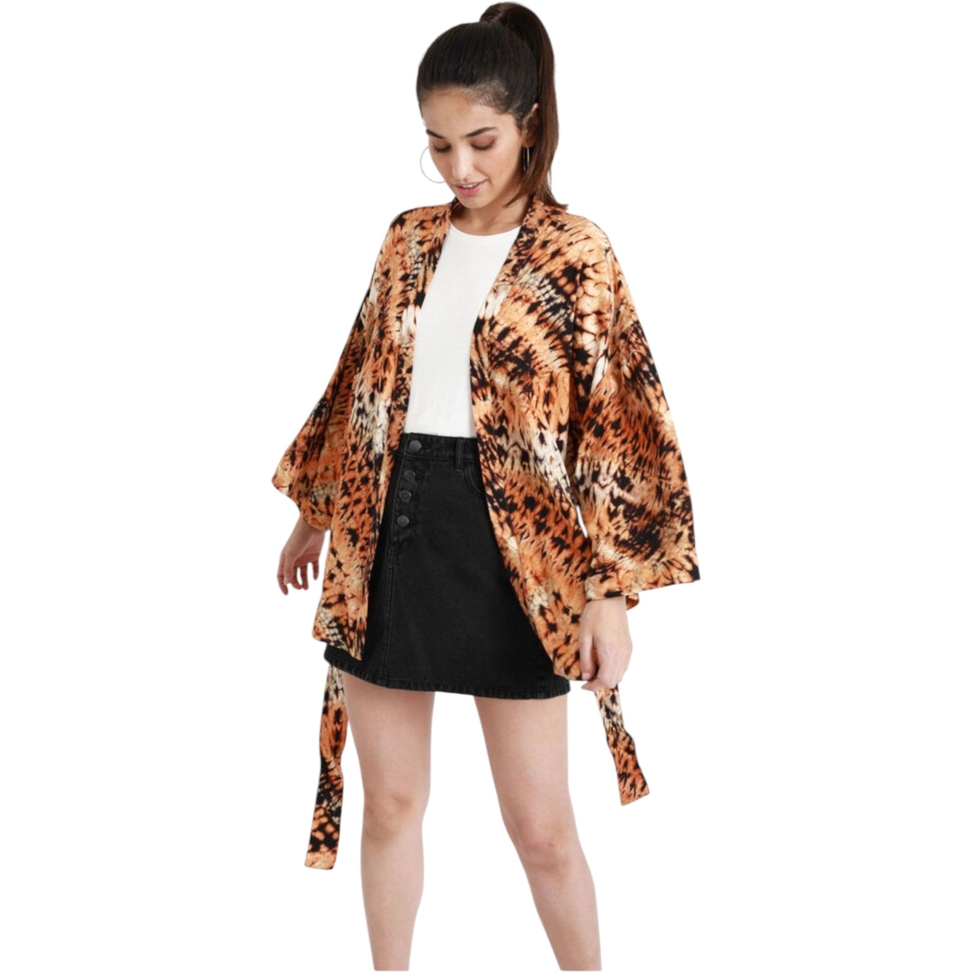 Címke nélküli, narancssárga alapon fekete és fehér batikolt mintás, rövid ujjú (kimonó ujjú), elöl megkötővel ellátott, nyitott kardigán.