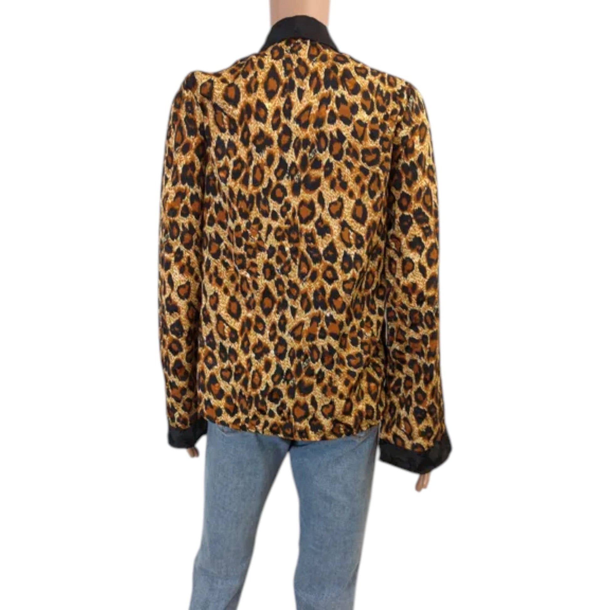 Címke nélküli, barna alapon fekete és bézs leopárdmintás, hosszú, bő ujjú, fekete szatén szegélyes, elöl megkötős (kimonó stílusú) felső.