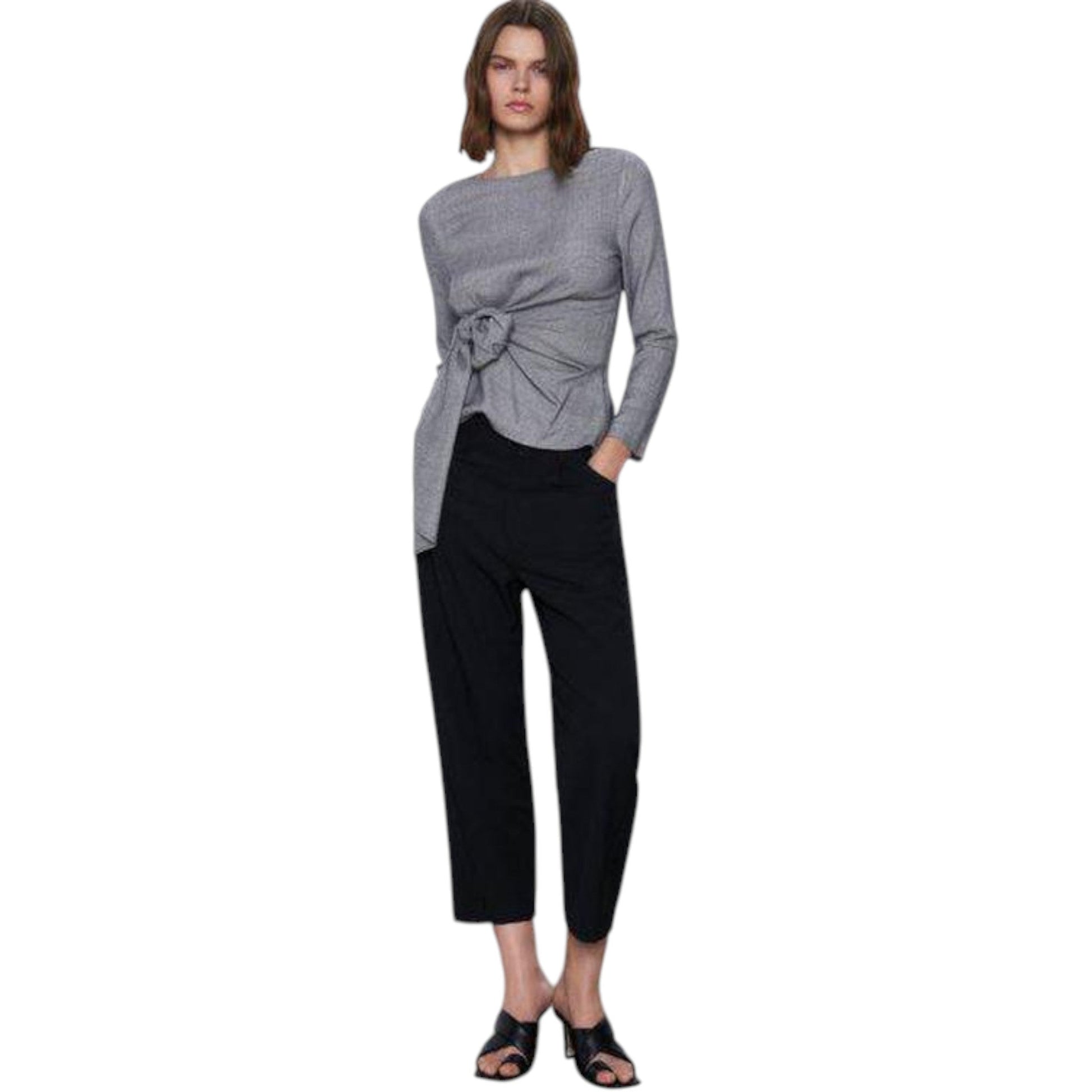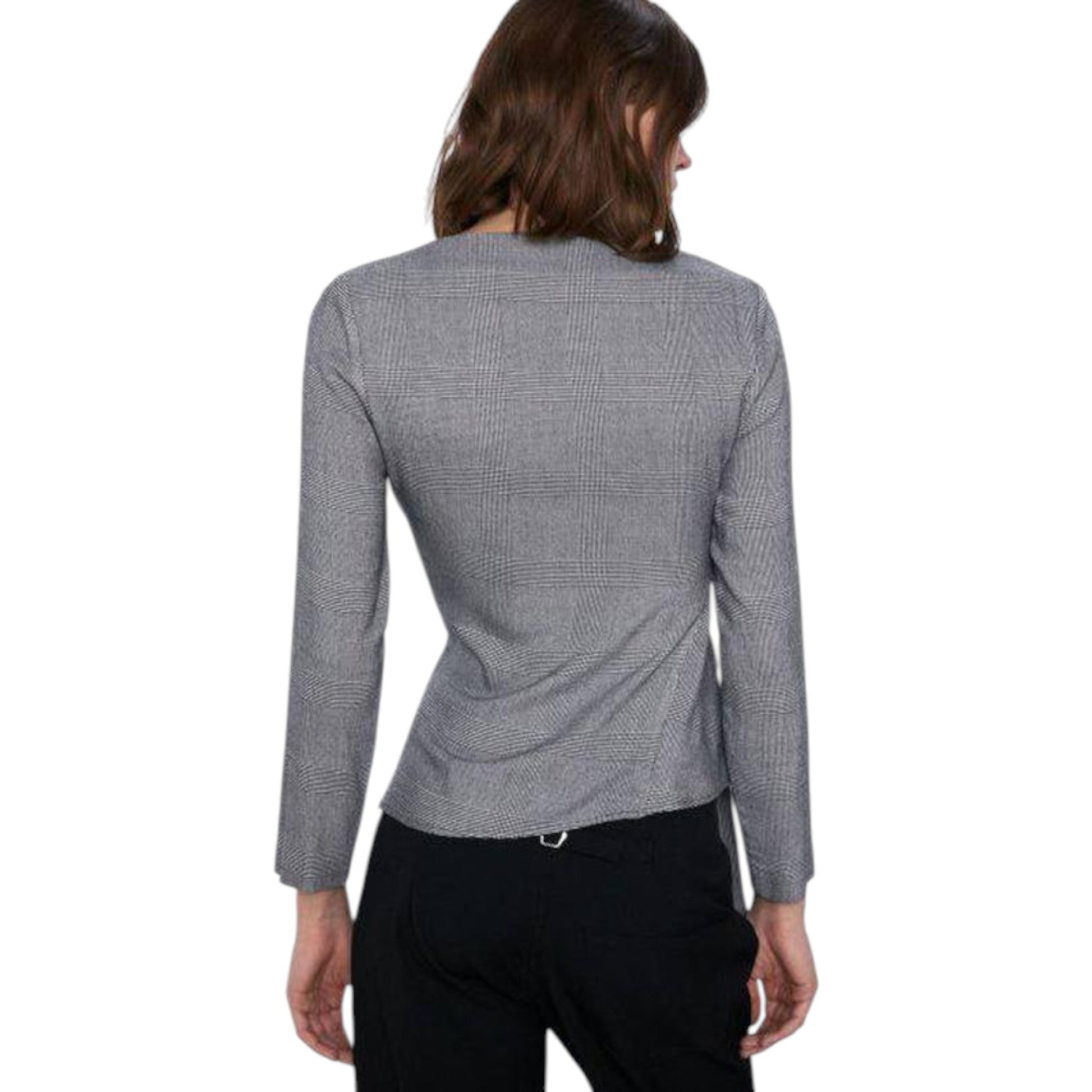 Címke nélküli, szürke-fehér kockás, hosszú ujjú, kerek nyakú, oldalt megkötős, átlapolt szabású felső.