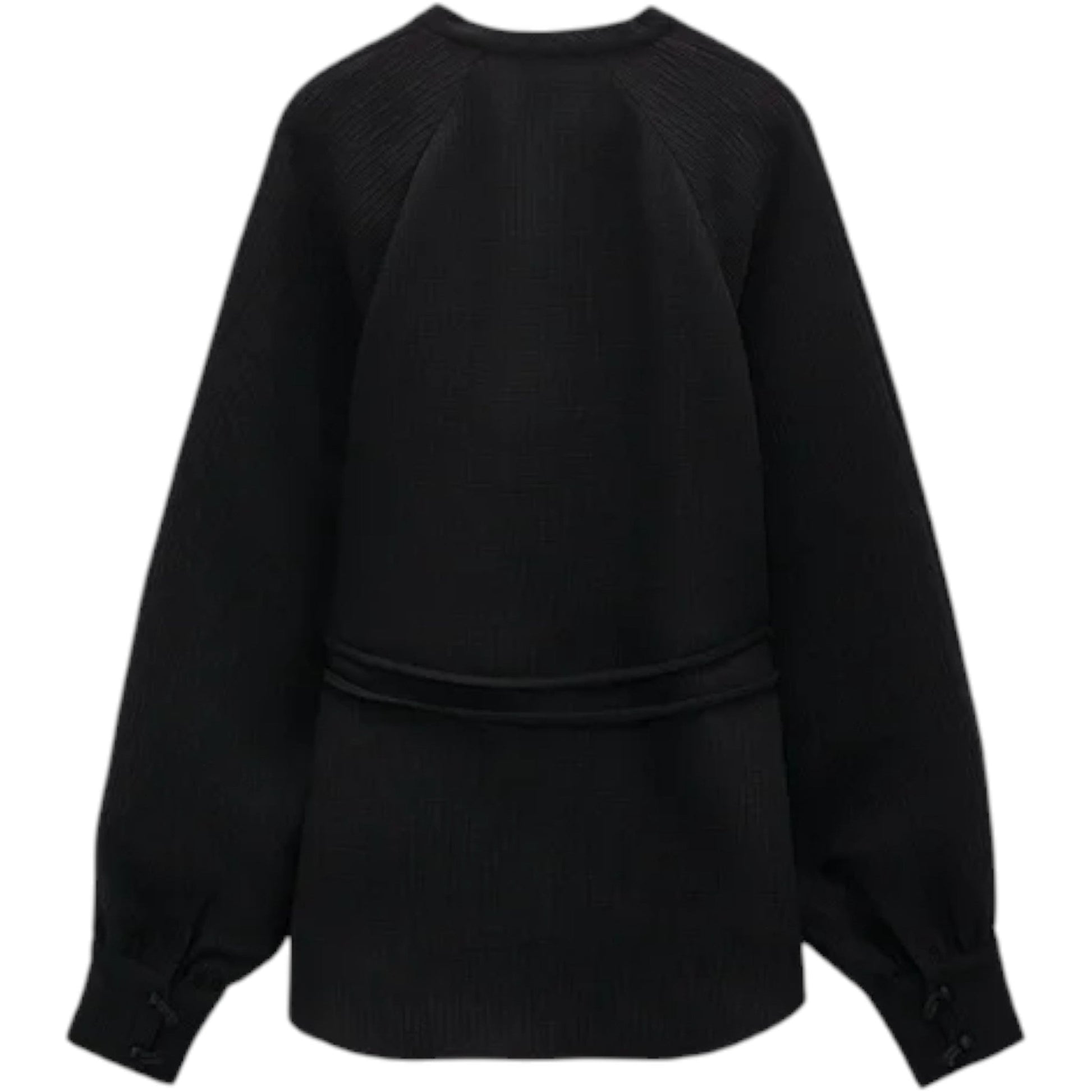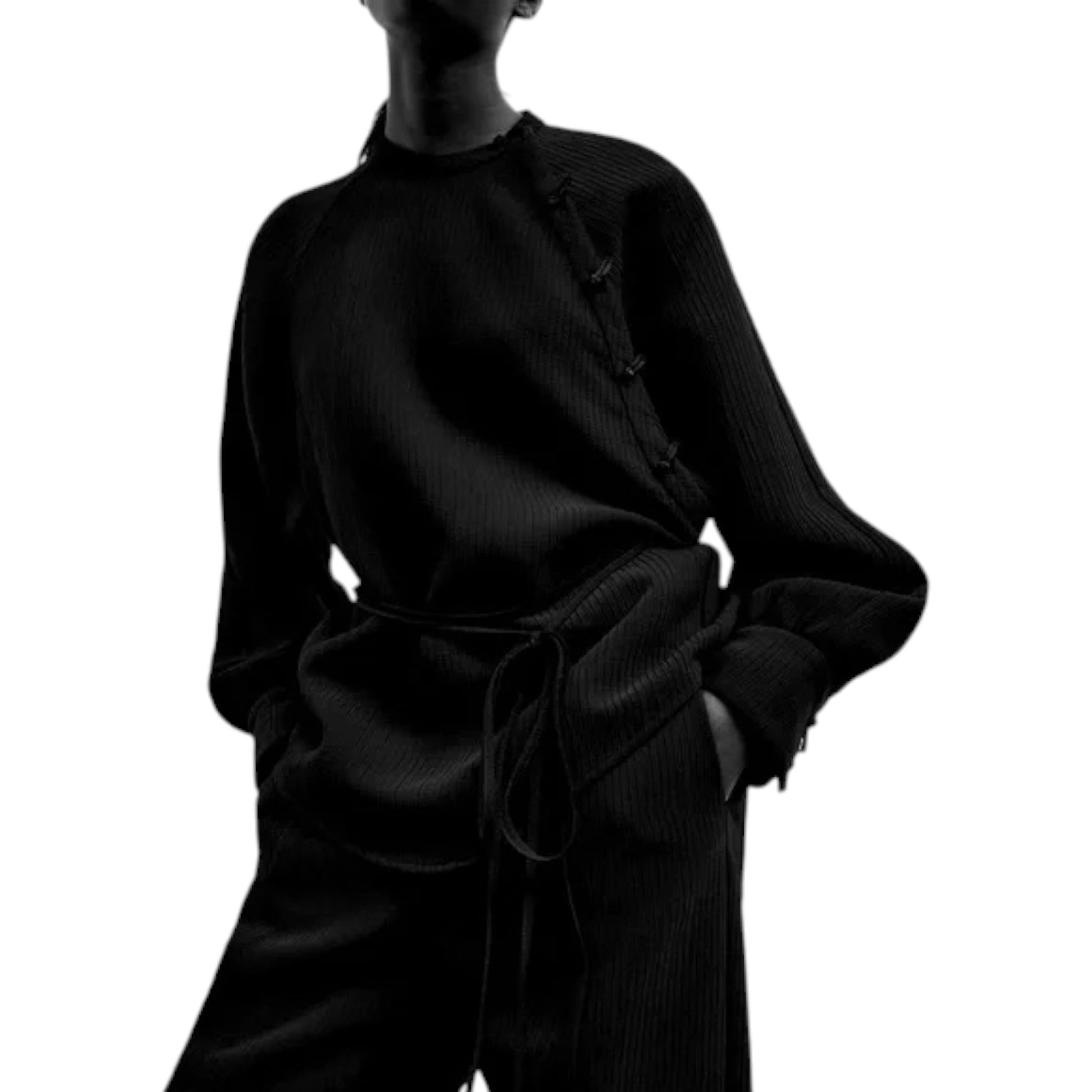 Címke nélküli, fekete, bordás kötésű, hosszú ujjú, magas nyakú, oldalt gombokkal és megkötővel díszített.