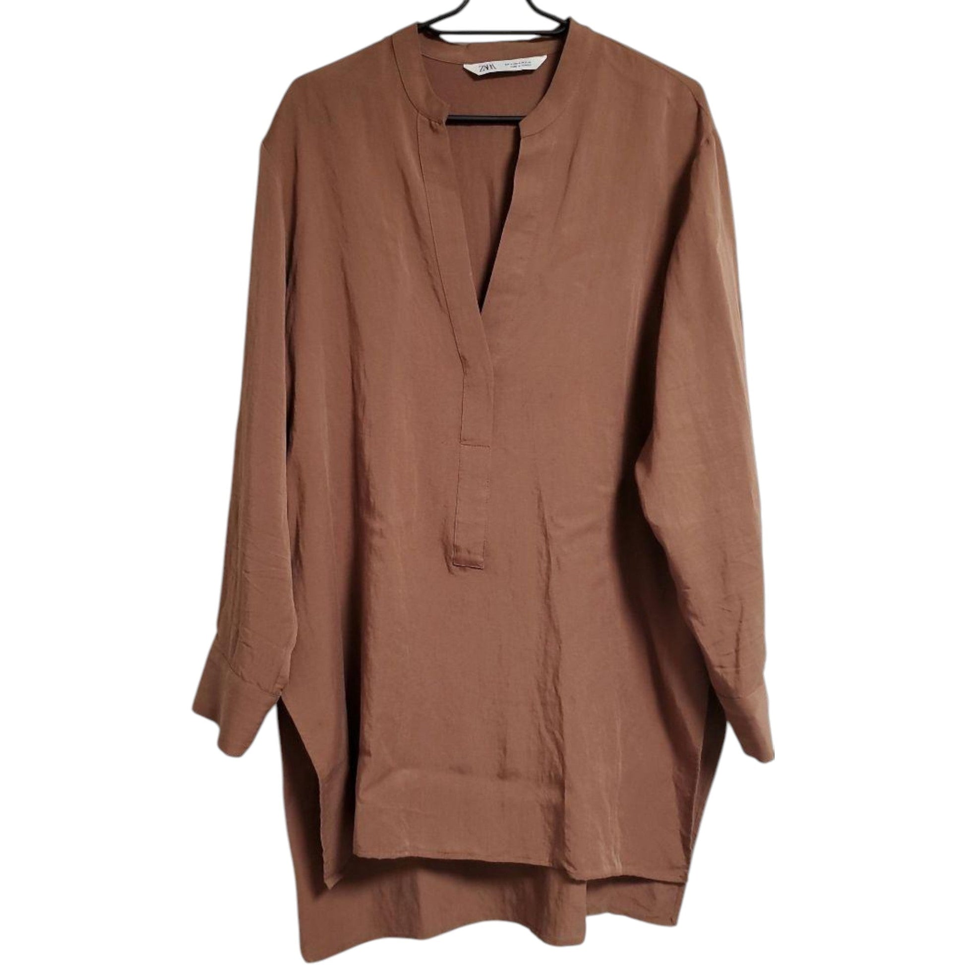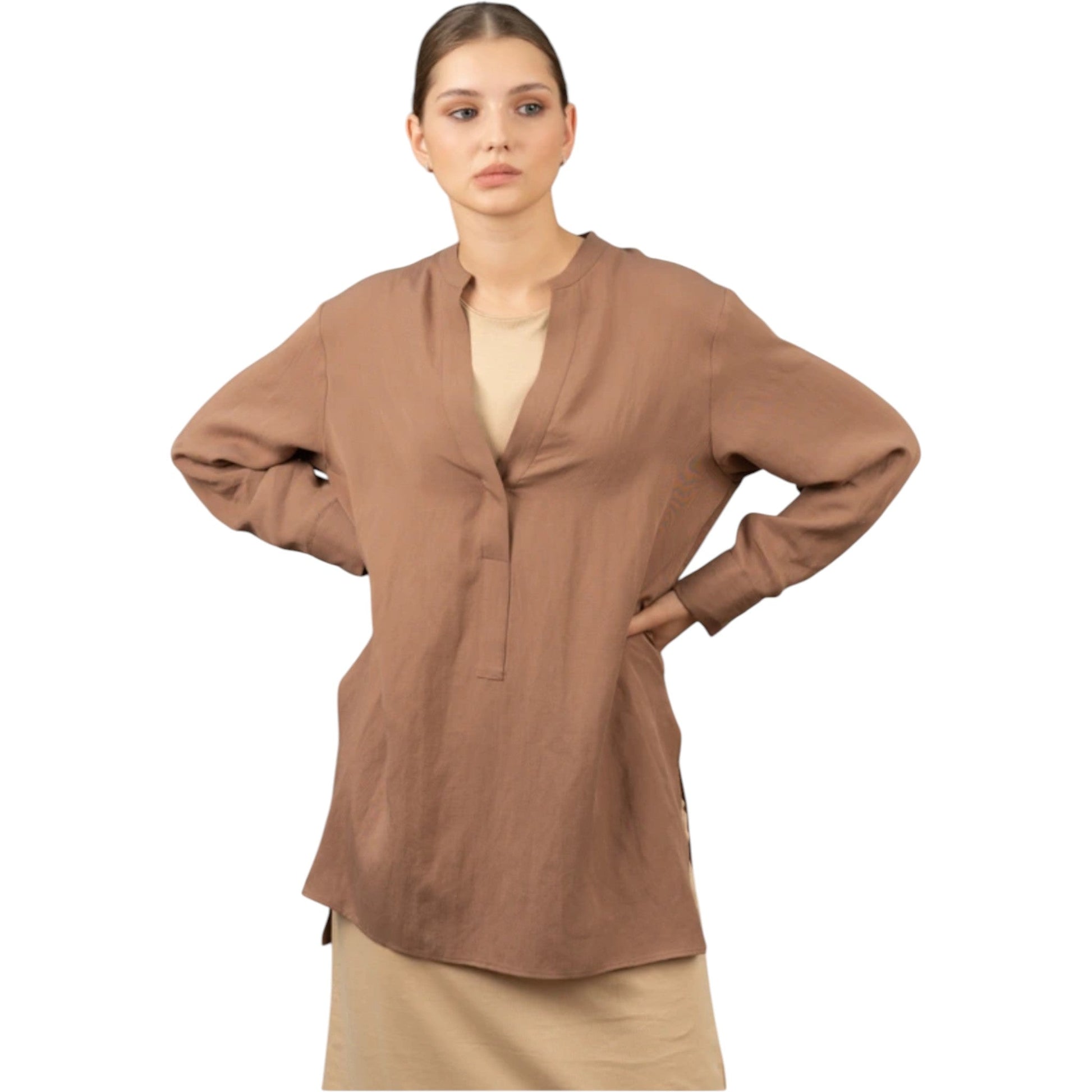 Címke nélküli, barna, hosszú ujjú, V-nyakú (állógallérral), tunika hosszúságú.