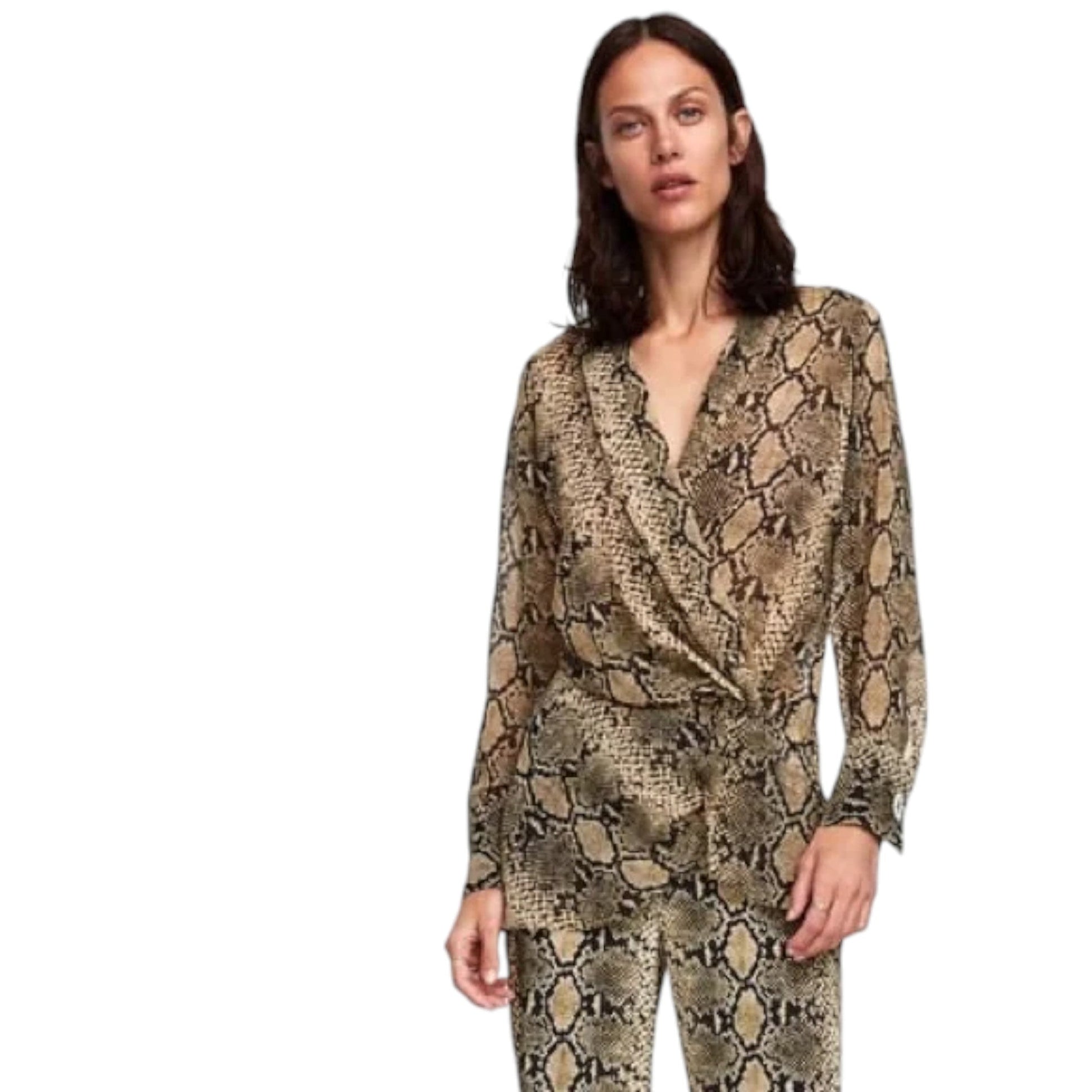 Címke nélküli, barna, kígyóbőr (snake) mintás, hosszú ujjú, mély V-nyakú, átlapolt fazonú.