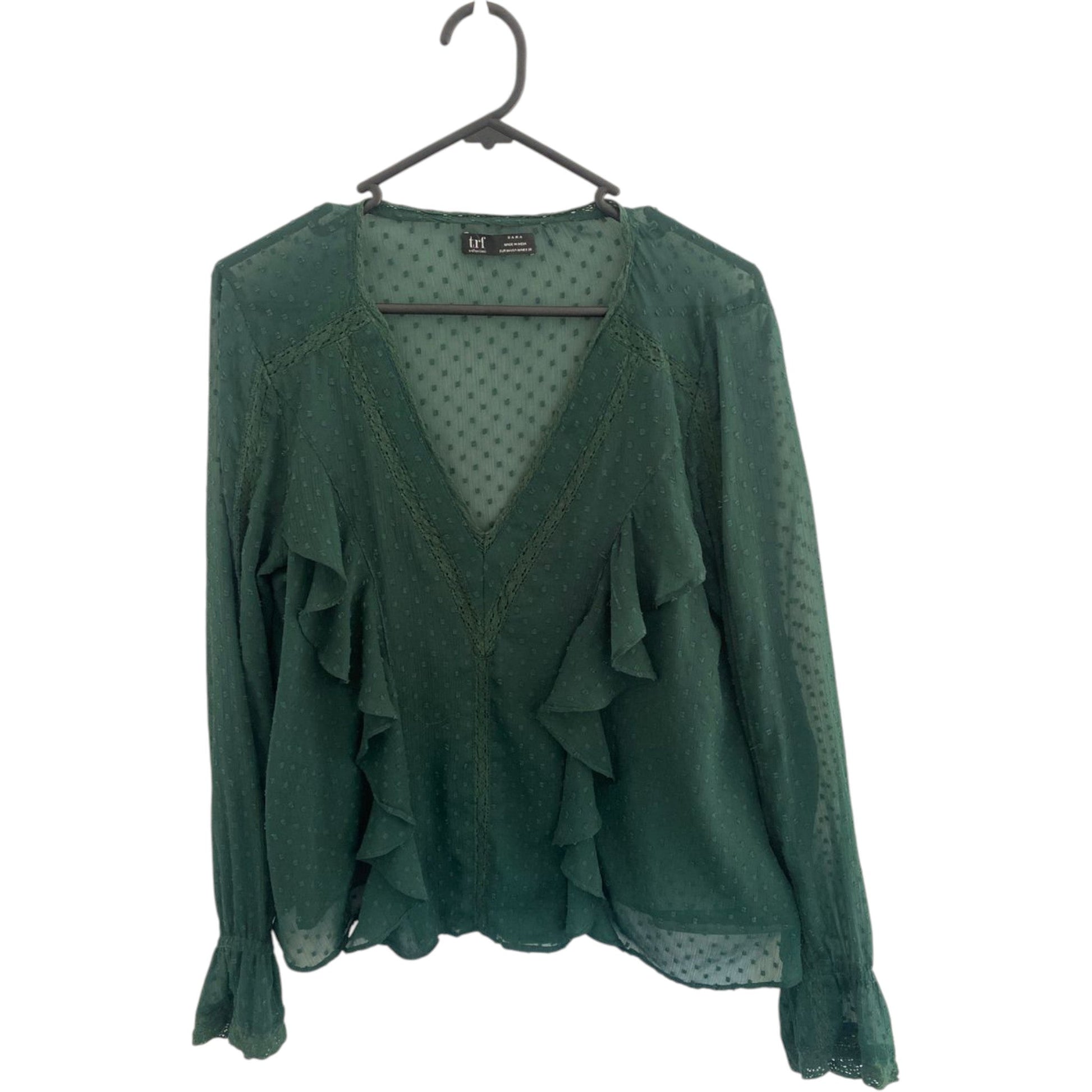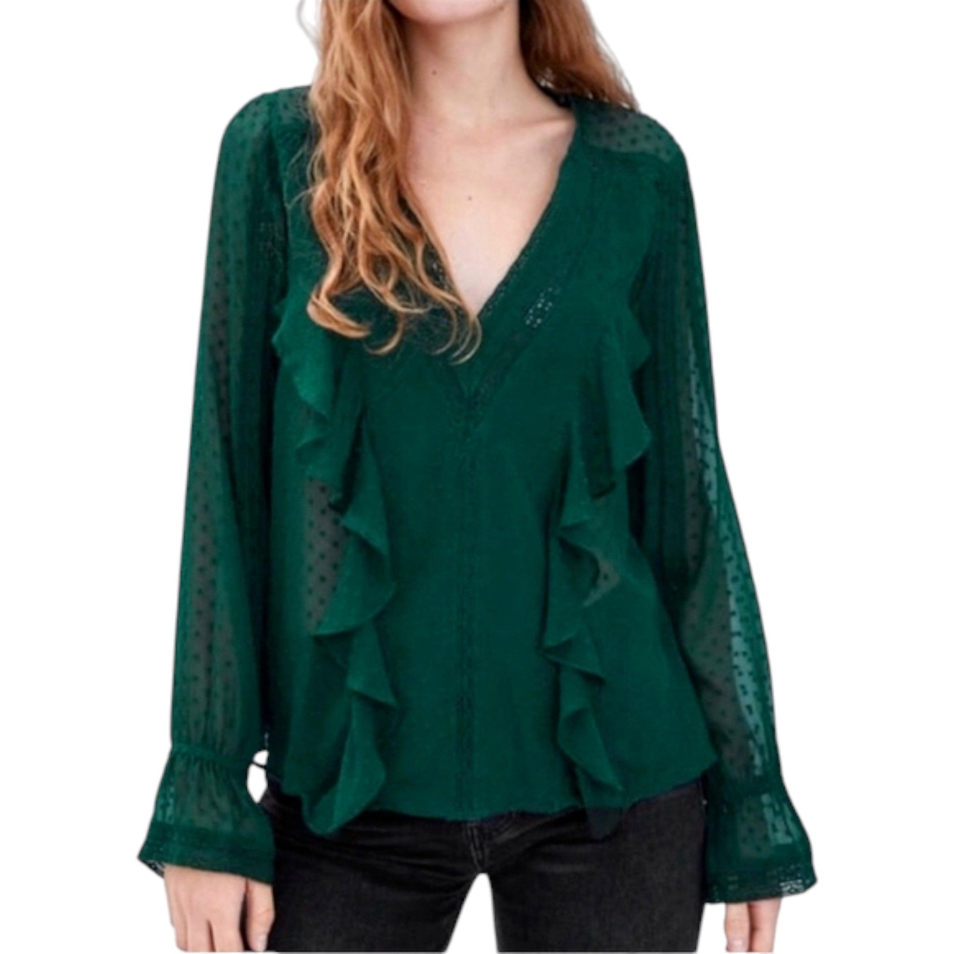 Címke nélküli, sötétzöld, hosszú ujjú, mély V-nyakú, áttetsző, hálós anyagú, pettyes/jacquard mintás, elöl fodrokkal és csipke szegéllyel díszített.