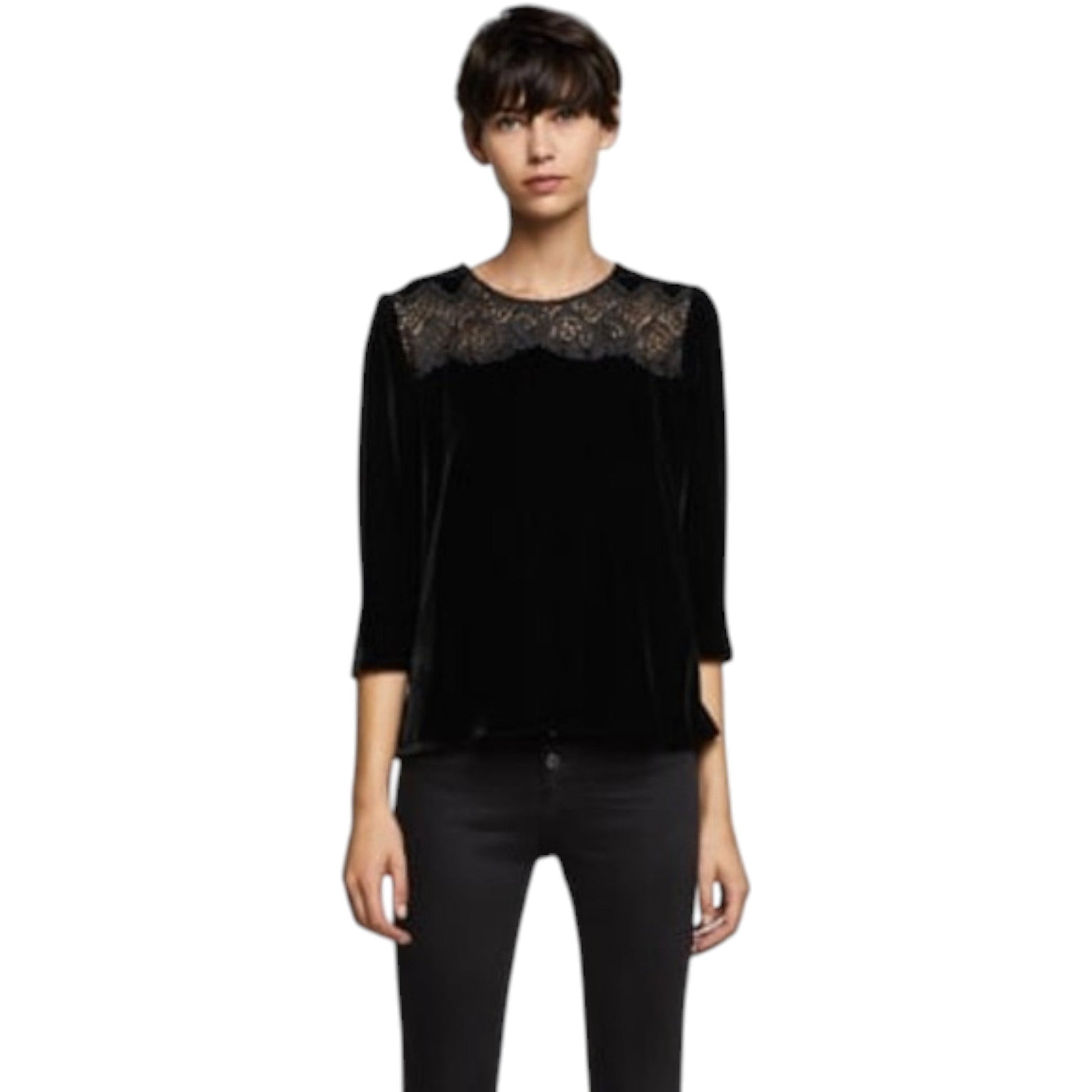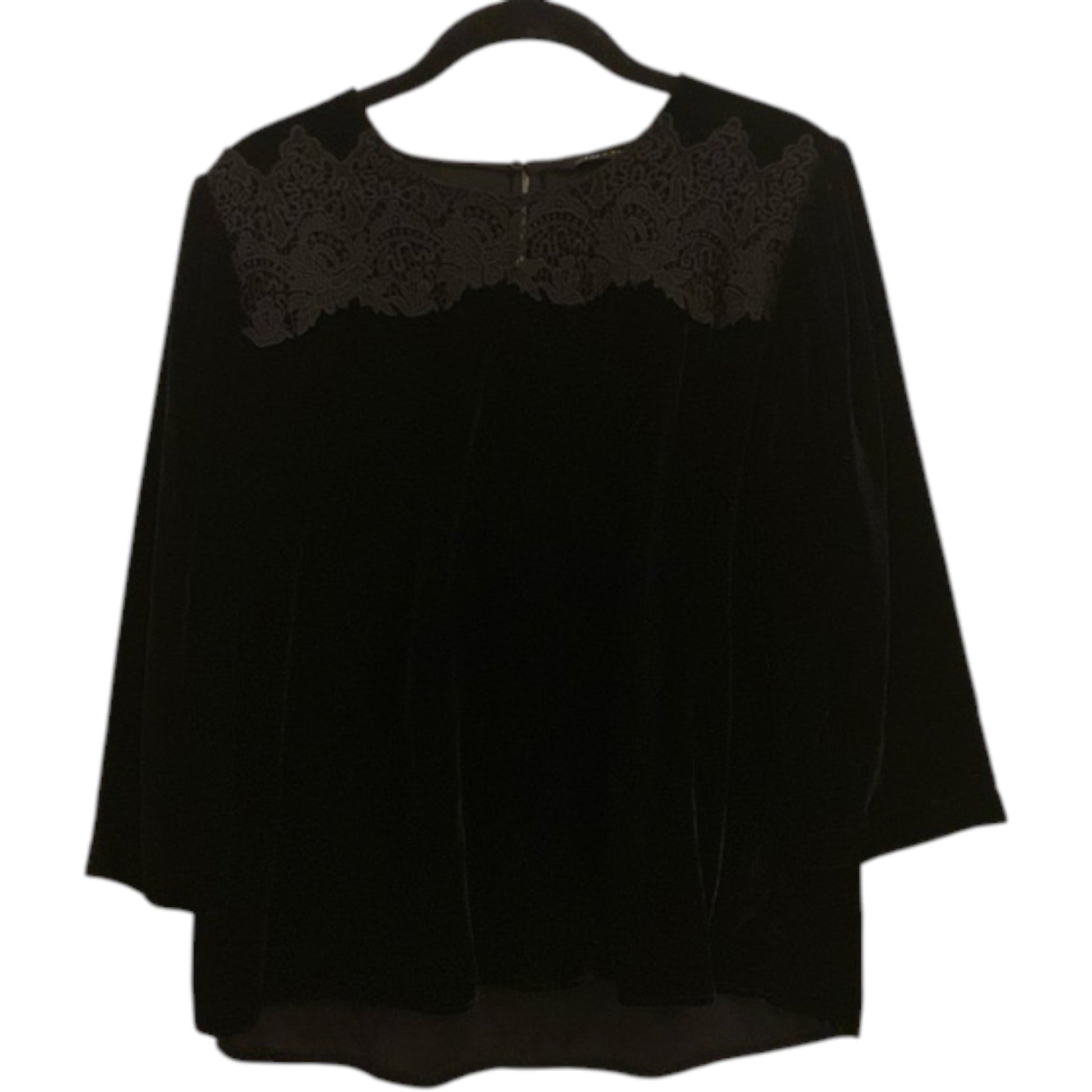 Címke nélküli, fekete, bársony anyagú, háromnegyedes ujjú, kerek nyakú, vállrészen fekete csipkével díszített.
