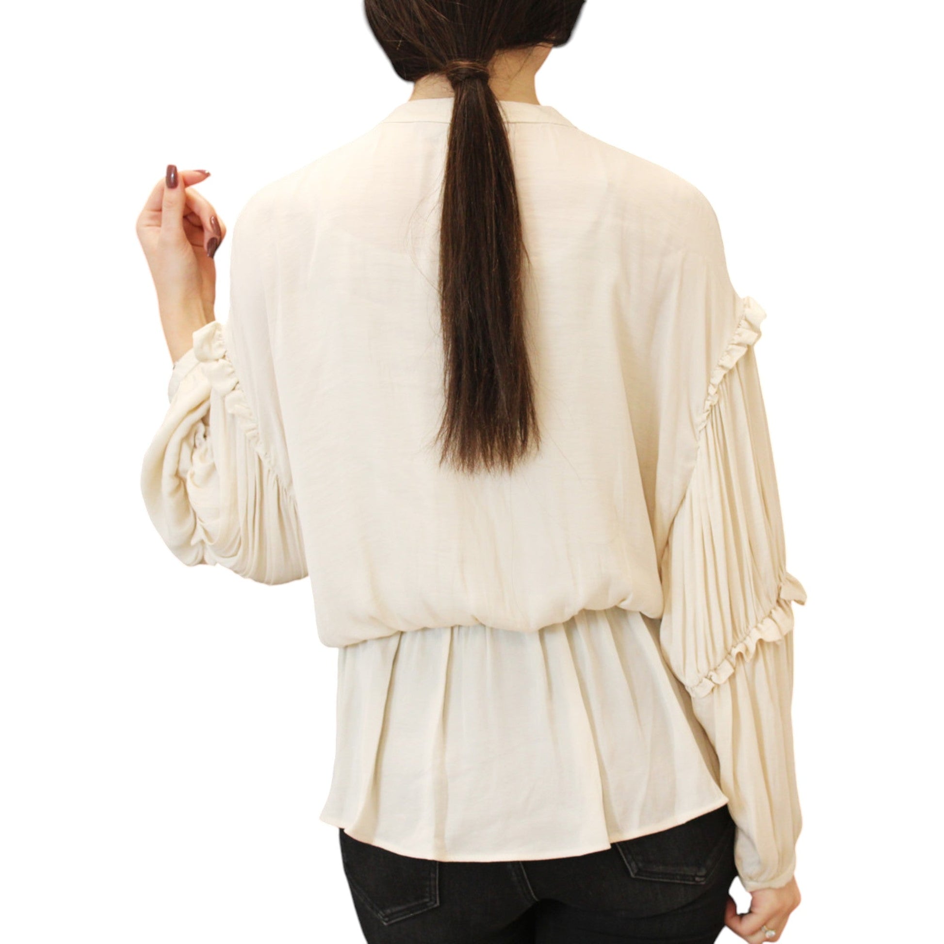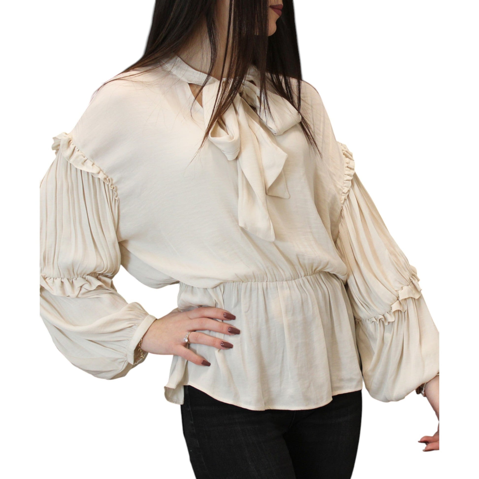 Címke nélküli, ekrü, hosszú puffos ujjú (gumírozott/ráncolt részletek az ujjakon), magas nyakú, elöl nagy masnival (megkötővel) díszített, gumírozott derékrésszel.