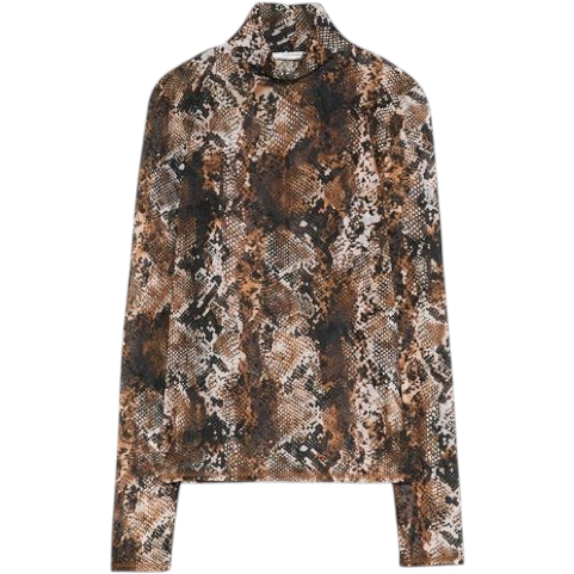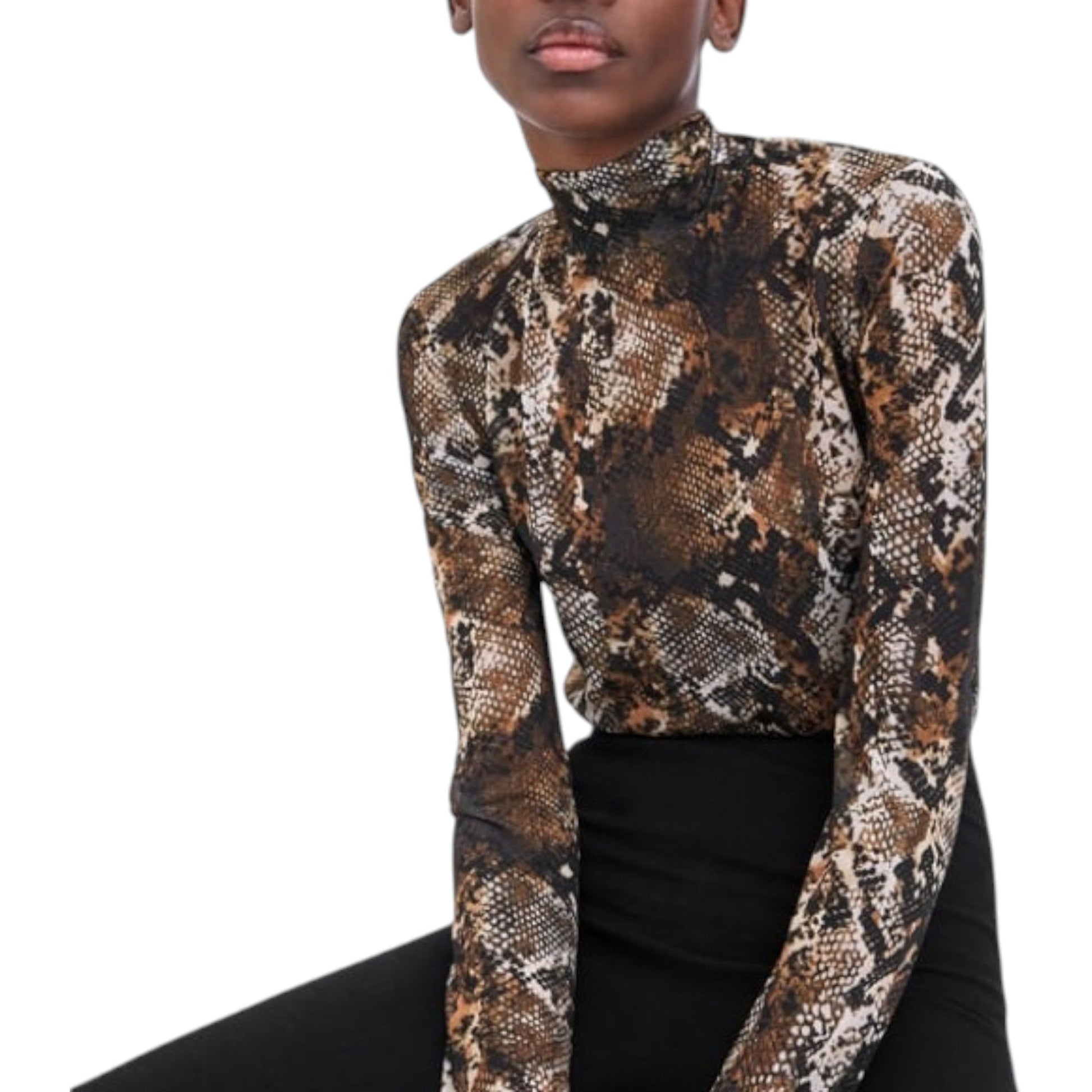Címke nélküli, barna, kígyóbőr (snake) mintás, hosszú ujjú, garbó nyakú, testhezálló.